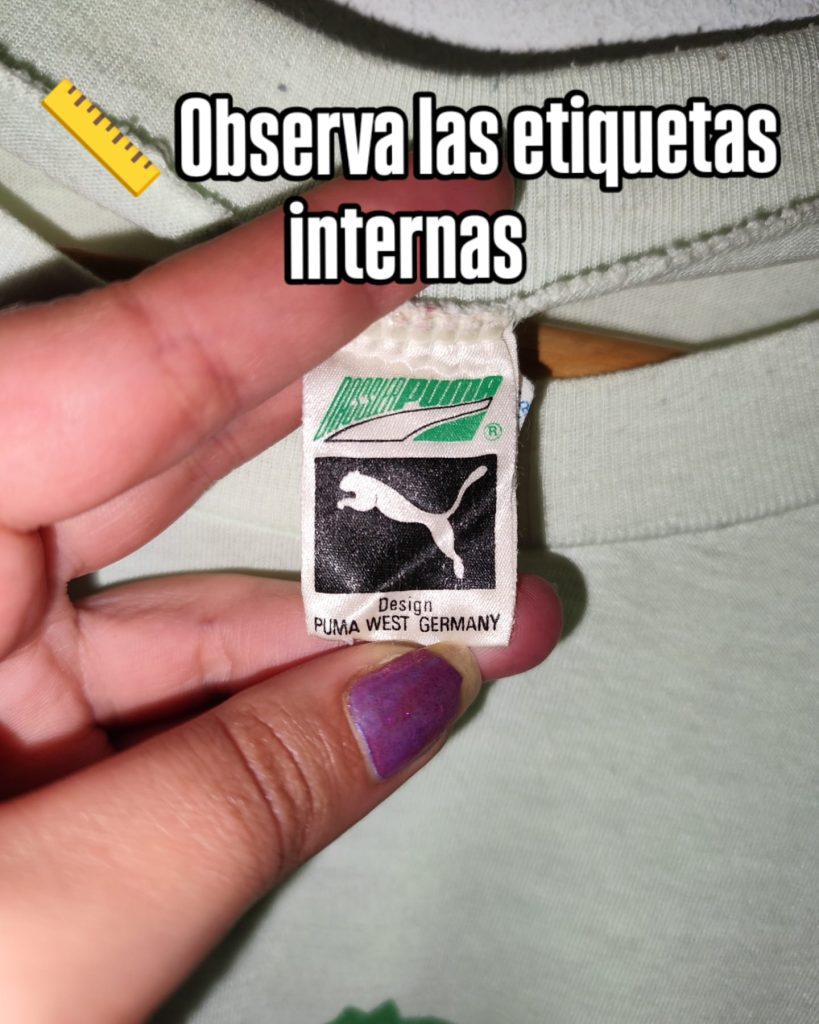 Las etiquetas antiguas suelen tener un diseño más elaborado, muy probablemente sin web ni QR dependiendo de que vintage estemos buscando (Y2k por ejemplo podría tenerlas ya). Fíjate en el país de fabricación (USA, Spain, Hong Kong…), los logos antiguos de las marcas y los materiales.