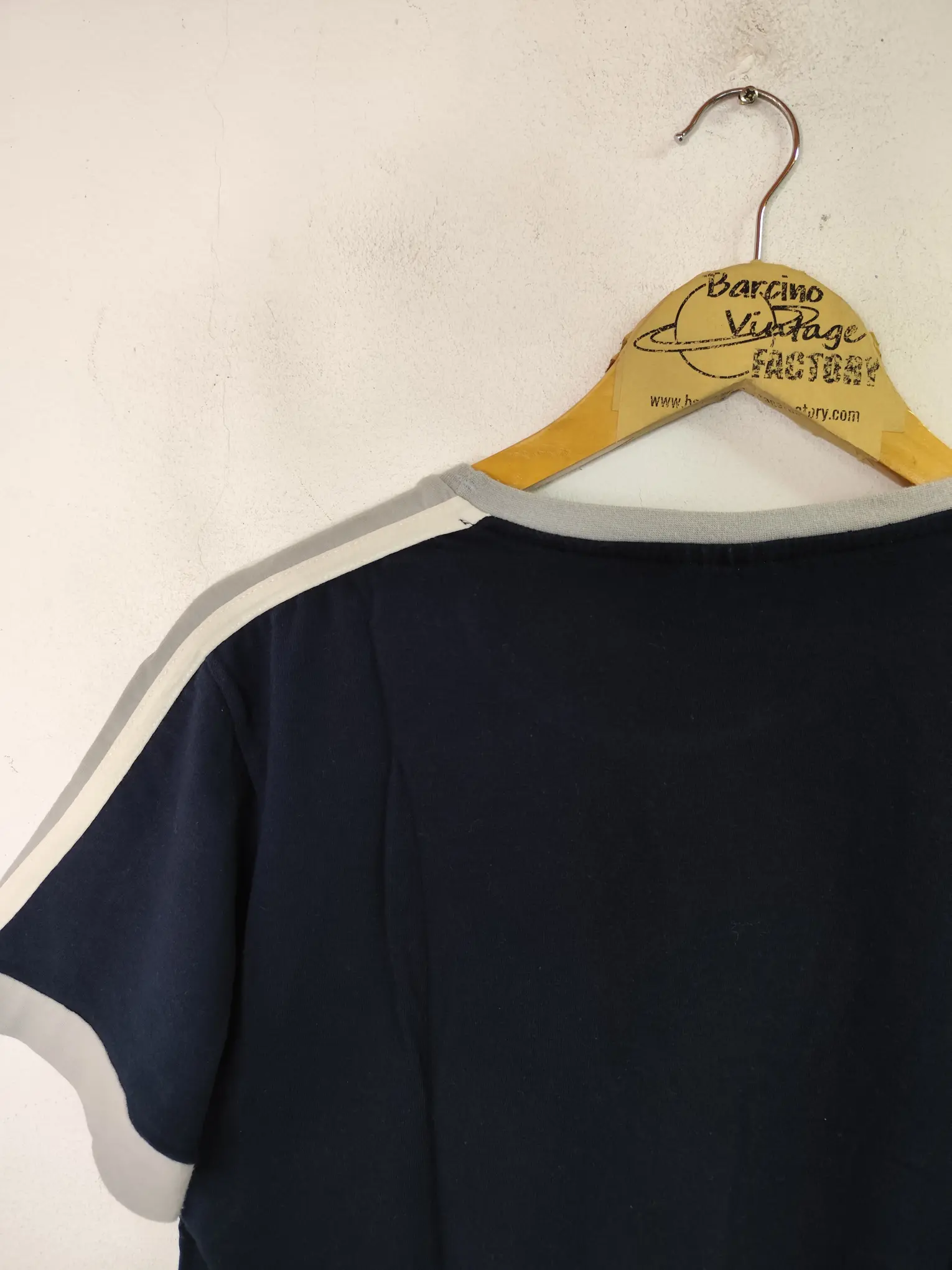 Camiseta deportiva de algodón de manga corta en color azul marino con estampado frontal en blanco. Ideal para primavera y verano o para invierno para llevarlas con alguna cazadora vaquera o track jacket abierta. Queda genial tanto con pantalones vaqueros como con pantalones deportivos o incluso con una falda si quieres darle un aire diferente a tu look.