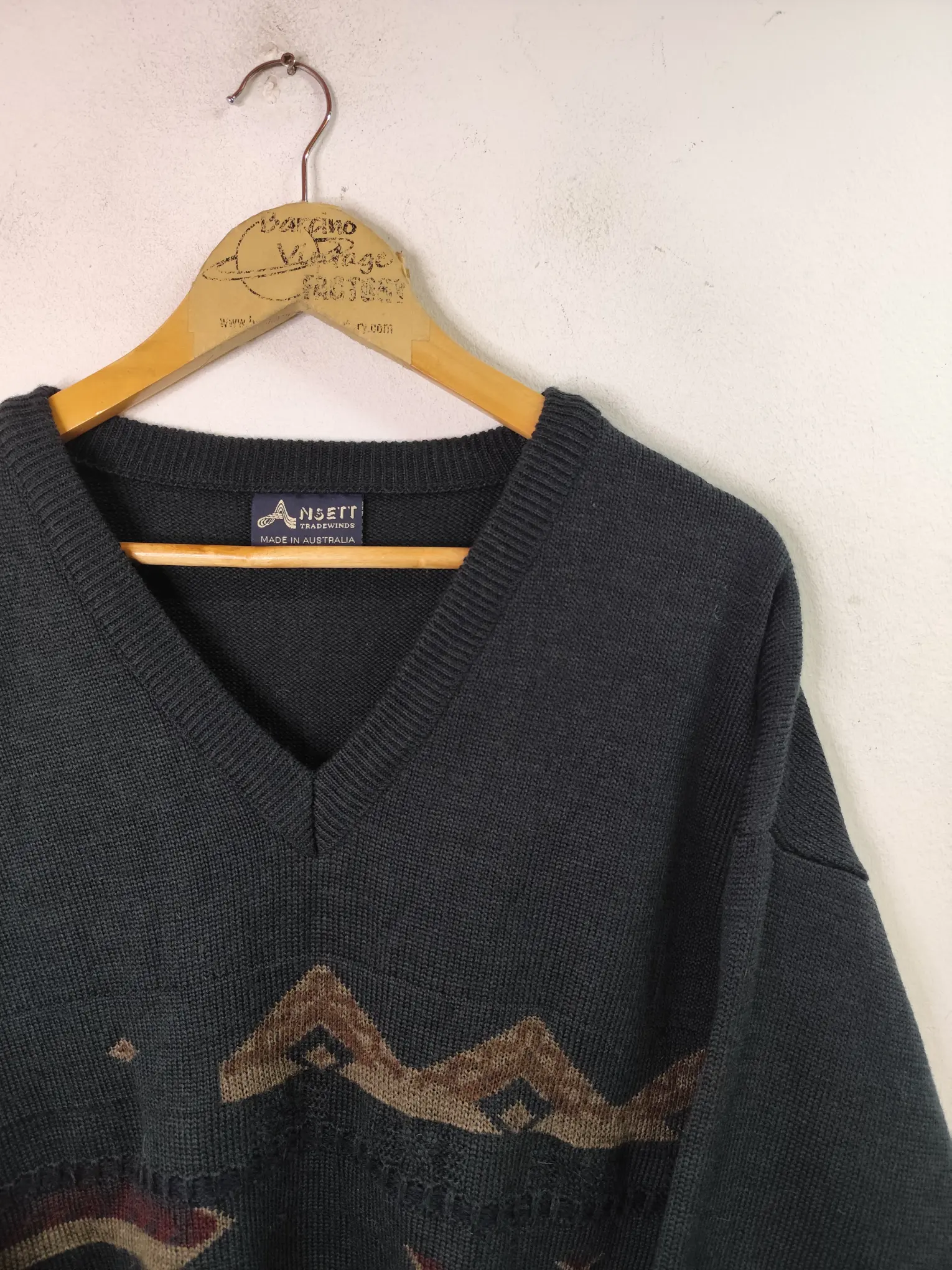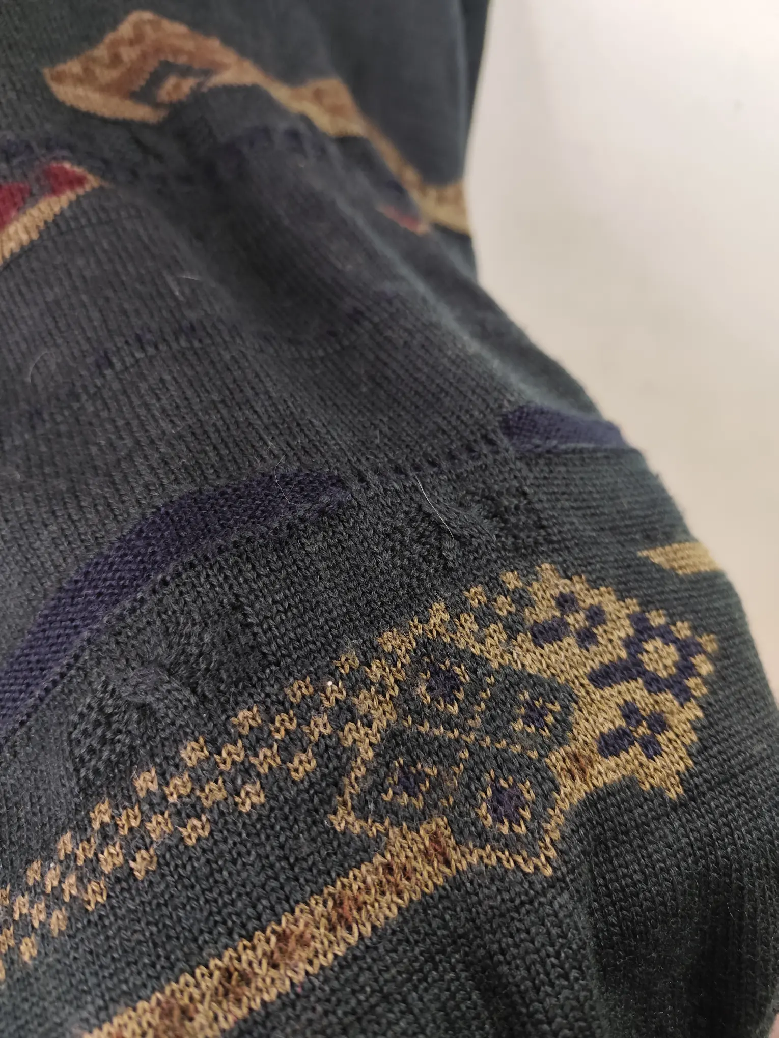 Jersey vintage de punto, hecho de algodón y poliéster, en color verde oscuro con estampados en marrón y el cuello en pico. Ideal para primavera y verano en los días más fresquitos o para invierno para usarla debajo del abrigo. Queda genial tanto con pantalones vaqueros como con pantalones de pinzas o incluso con una falda para darle un rollo moderno y diferente a tu look.