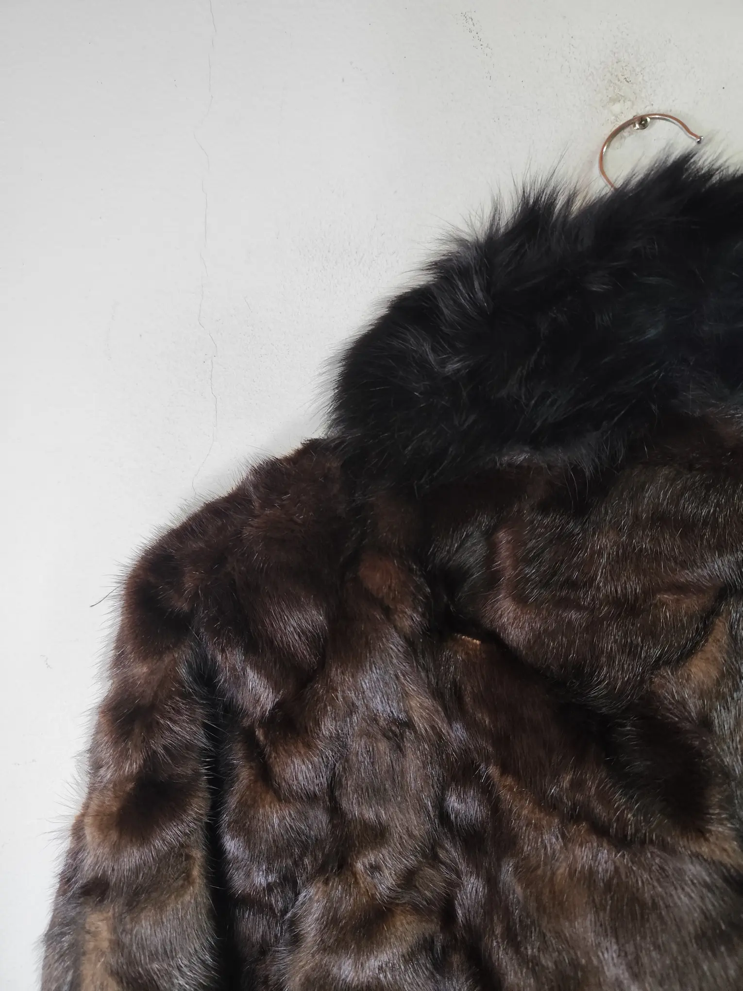 Abrigo largo vintage 90s de pelo natural de visón en color marrón oscuro y con los puños y el cuello en color negro. Tiene botones con clip para poder cerrarlo y un botón en el cuello para poder llevarlo más cerrado en los días más fríos. Tiene forro interior y cuenta también con un bolsillo interior en él. Ideal para los días más fríos de invierno para usarla con más capas debajo del abrigo, como un jersey de punto o incluso con una sudadera para darle un toque más atrevido y único a tu look. Queda genial tanto con pantalones vaqueros como con pantalones tipo chinos o de pinzas, o incluso con una falda.