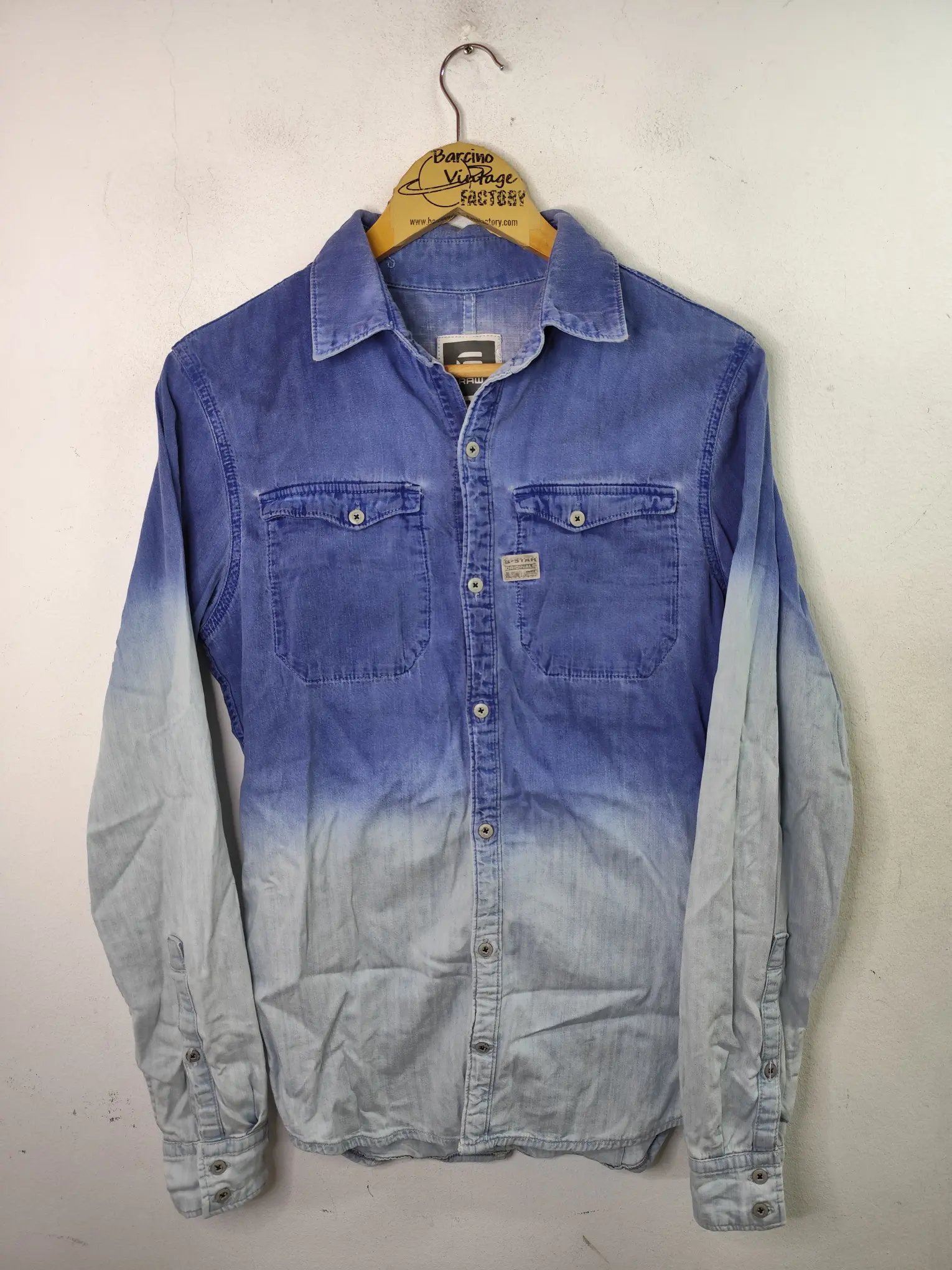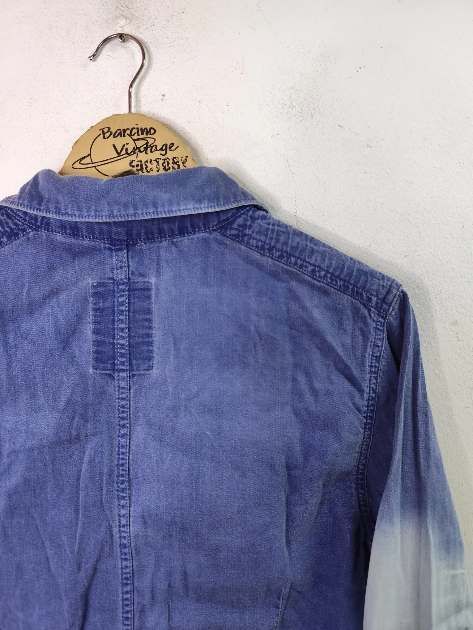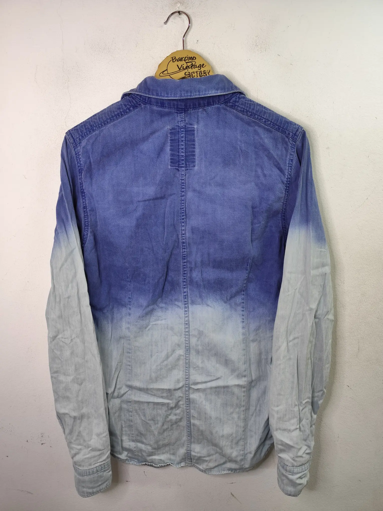 Camisa vintage 00s, Y2K, de manga larga de algodón vaquero en color azul marino y azul claro con efecto degradado. Ideal para primavera y verano en los días más fresquitos. Queda genial tanto con pantalones largos, ya sean unos vaqueros o unos pantalones chinos, como también con unas bermudas vaqueras o unos pantalones chinos tipo capri.