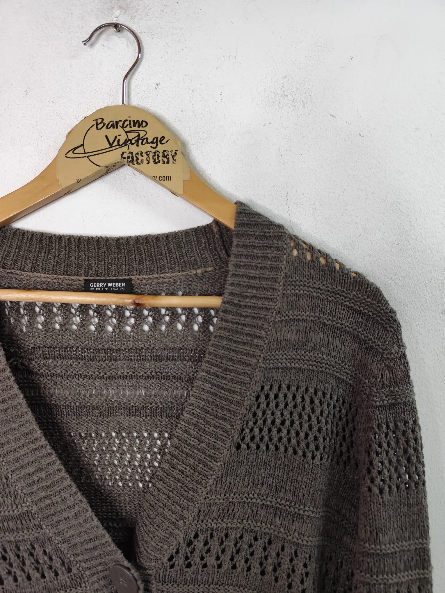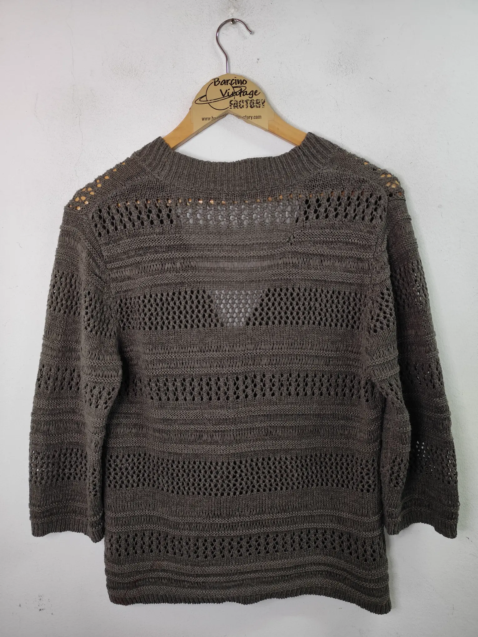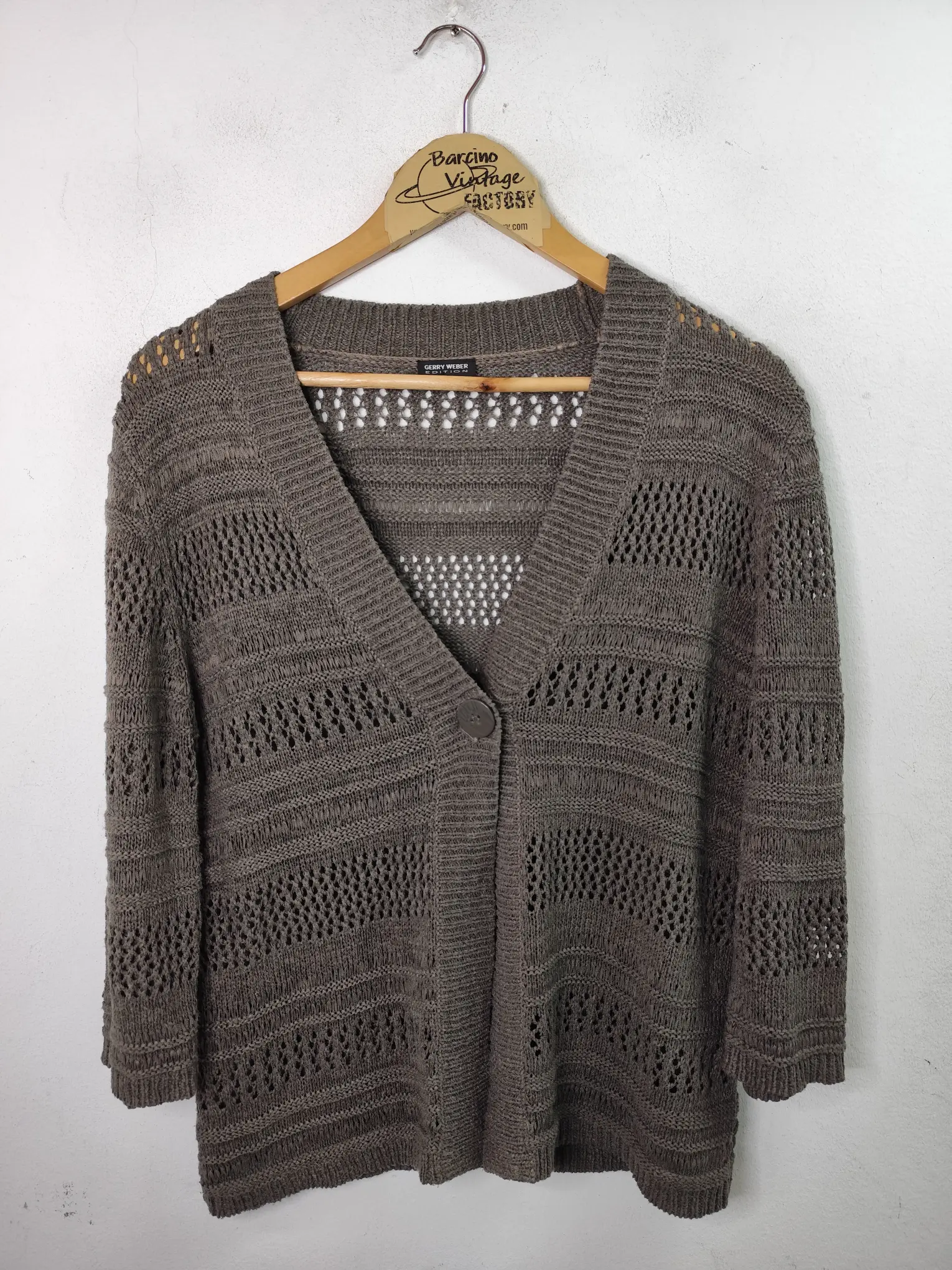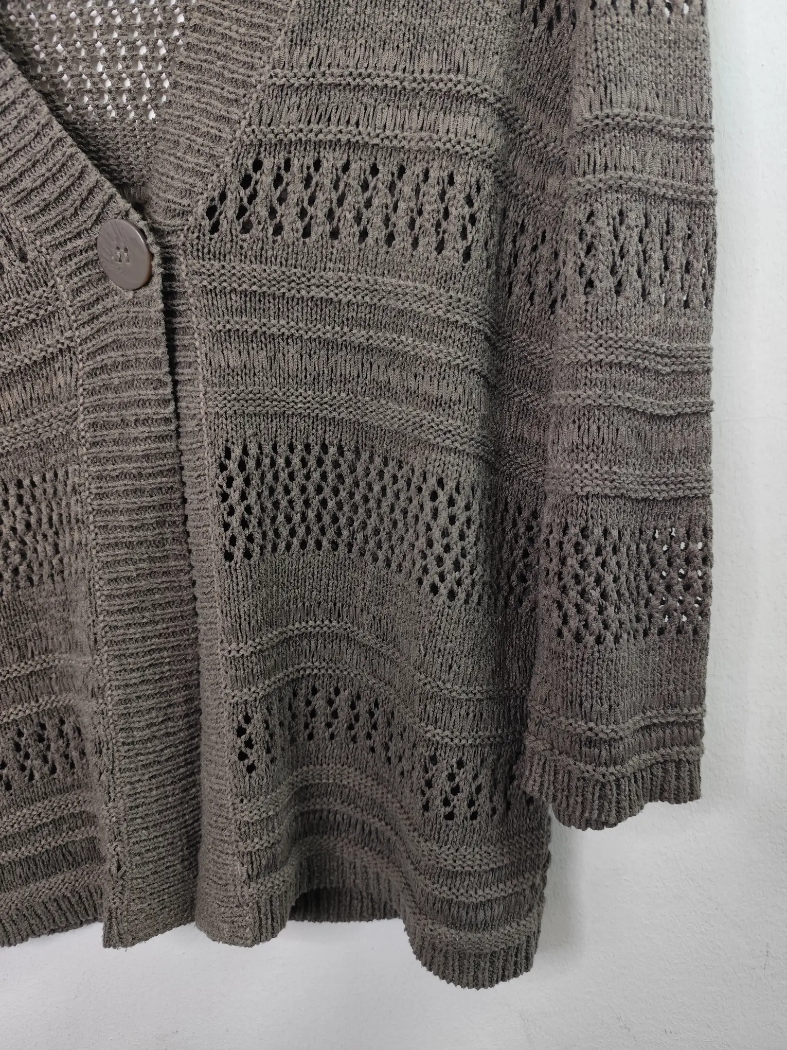 Chaqueta de punto con calados en color verde caqui de manga 3/4 y con el cuello pico. Ideal para primavera y otoño en los días más fresquitos o para invierno para usarla debajo de alguna prenda de abrigo. Queda genial tanto con pantalones de algodón o vaqueros como con pantalones de pinzas o incluso con una falda para darle un rollo más atrevido a tu outfit.