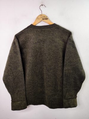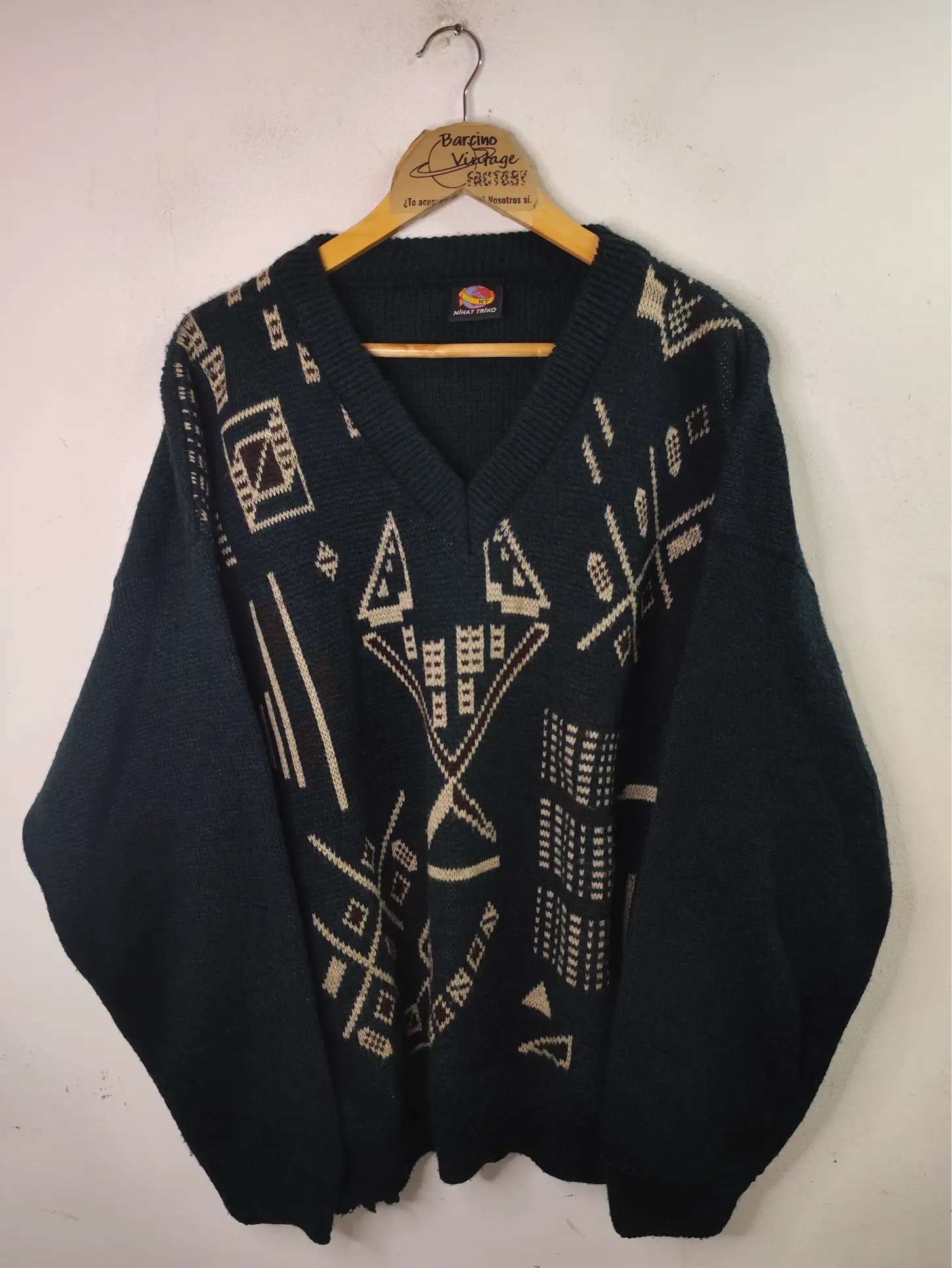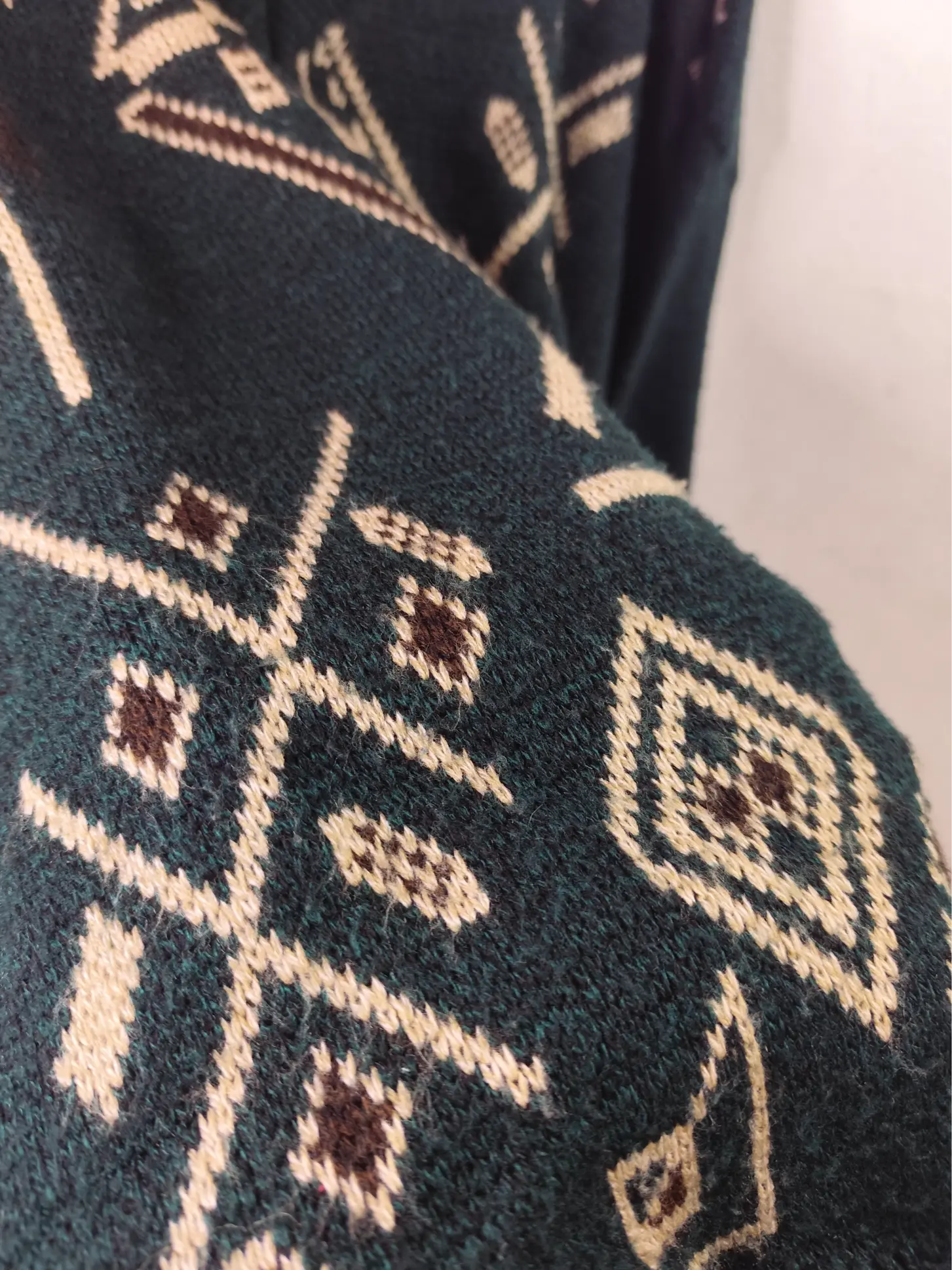 Vintage 90s knit jumper in dark green with beige and dark brown prints and a V-neck. Ideal for spring and autumn on cooler days or for winter to wear under a coat. It looks great with jeans as well as tailored trousers or even with a skirt to give your look a modern and different vibe.