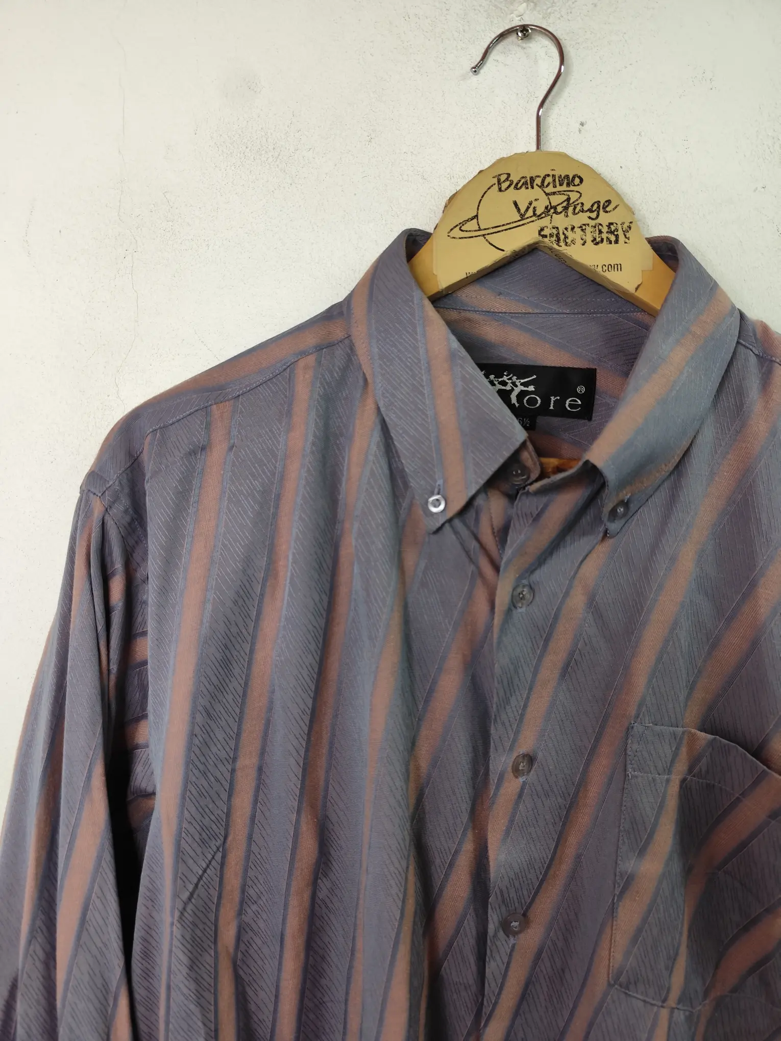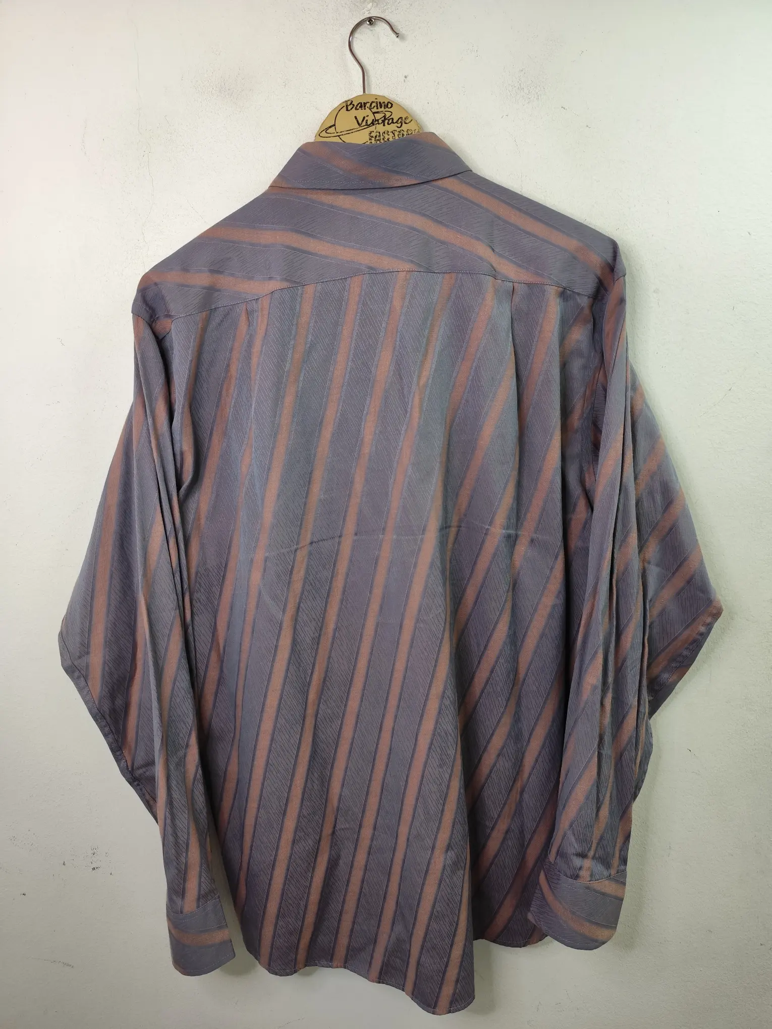 Camisa vintage 80s de manga larga con estampado a rayas diagonales en color lila claro y rosa palo. Ideal para invierno y primavera y verano en los días más fresquitos, para llevarla así o como sobrecamisa, abierta con una camiseta o top debajo. Queda genial tanto con pantalones largos, como con una falda vaquera o unos shorts.
