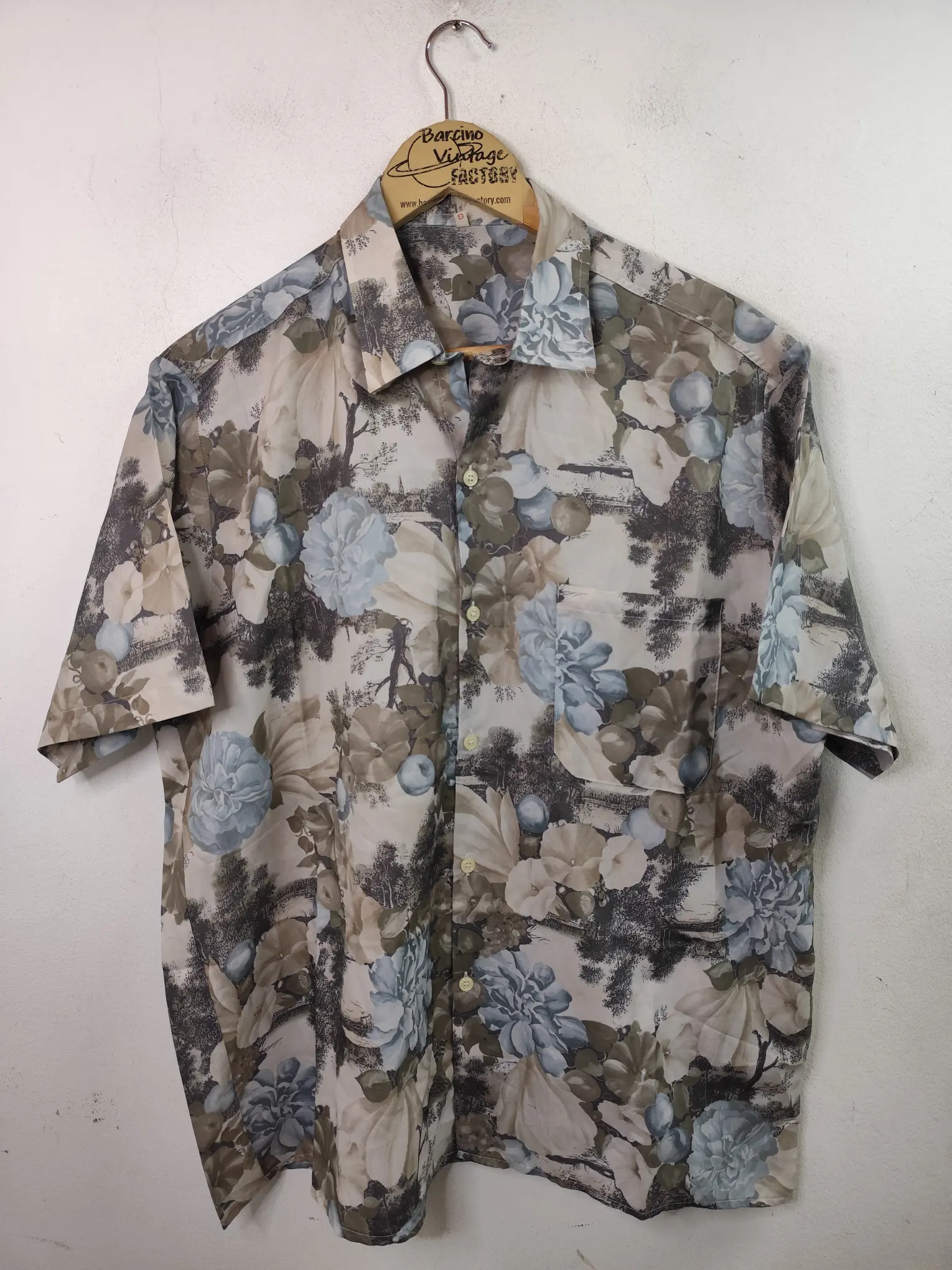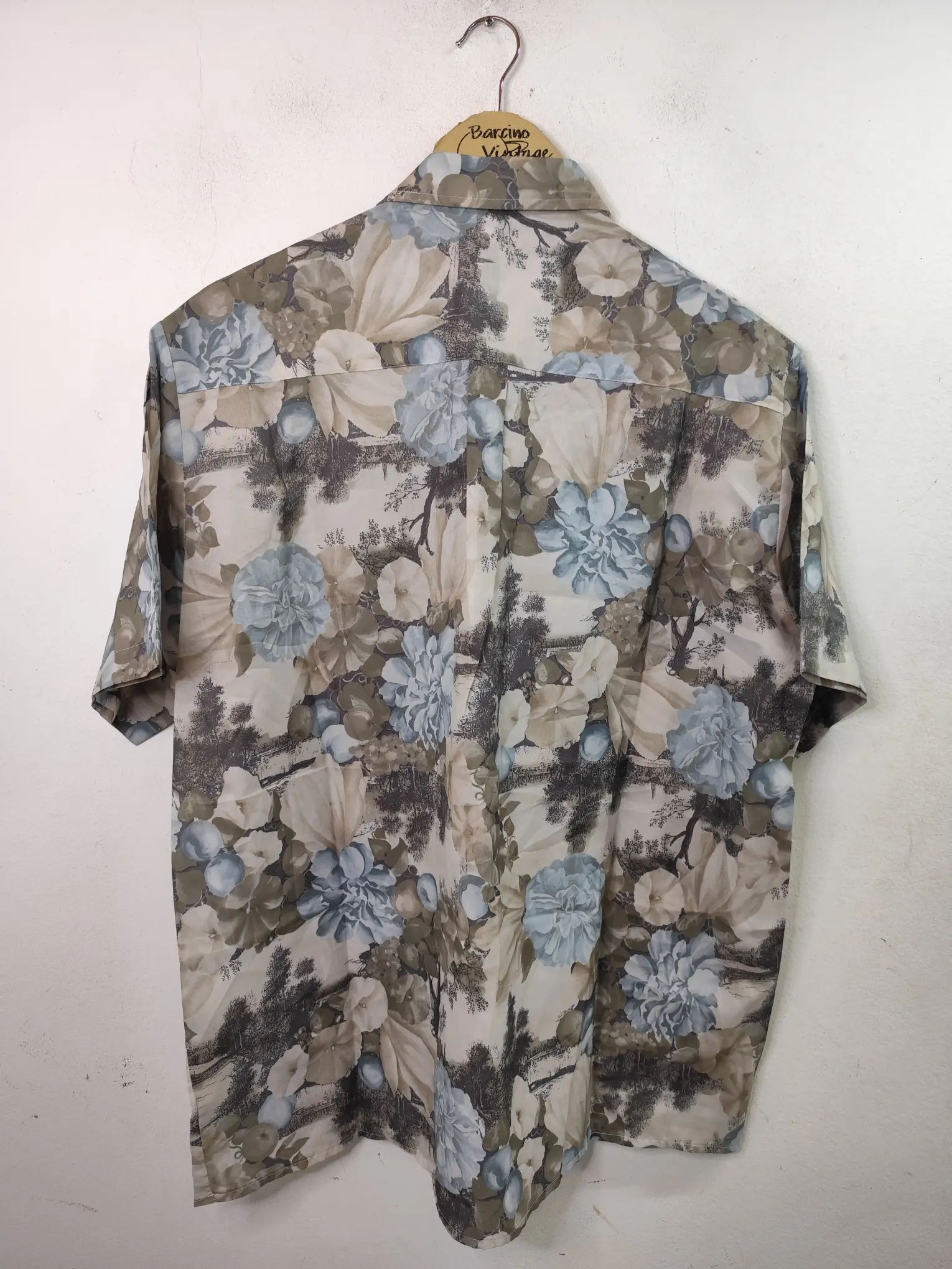 Camisa vintage estilo años 80s de manga corta en color gris claro con estampado de flores en azul celeste y gris oscuro. Ideal para primavera y verano, para llevarla así en los días de más calor o como sobrecamisa, abierta con una camiseta o top debajo en los días más fresquitos. Queda genial tanto con pantalones largos, como con una falda vaquera o unos shorts.