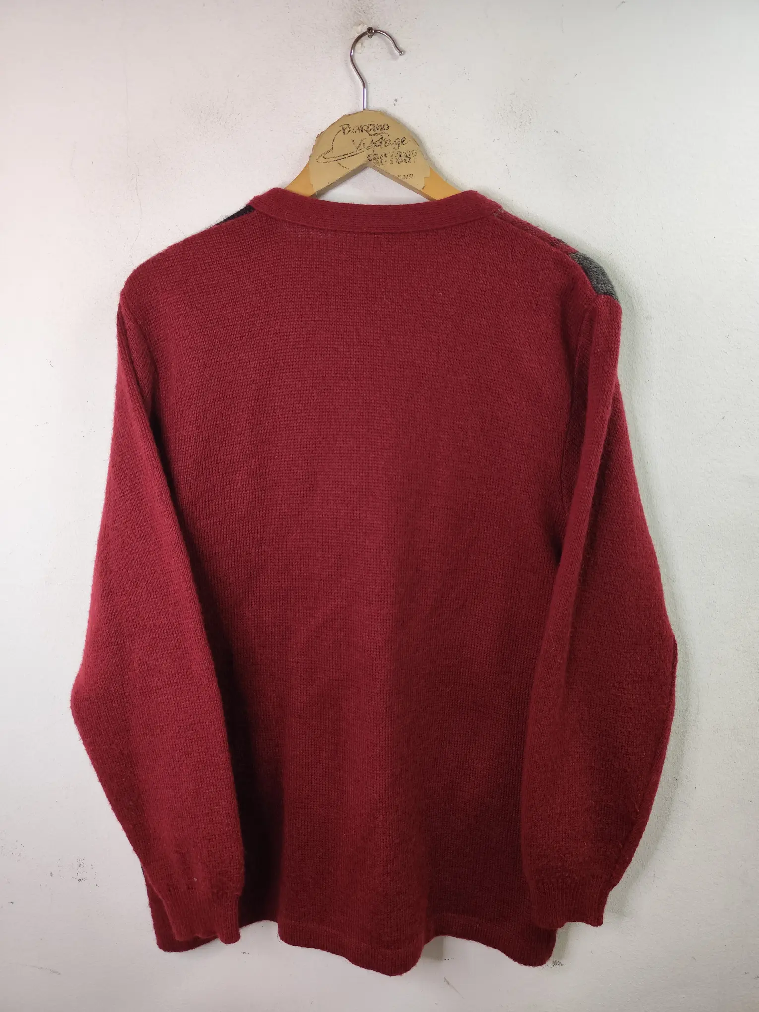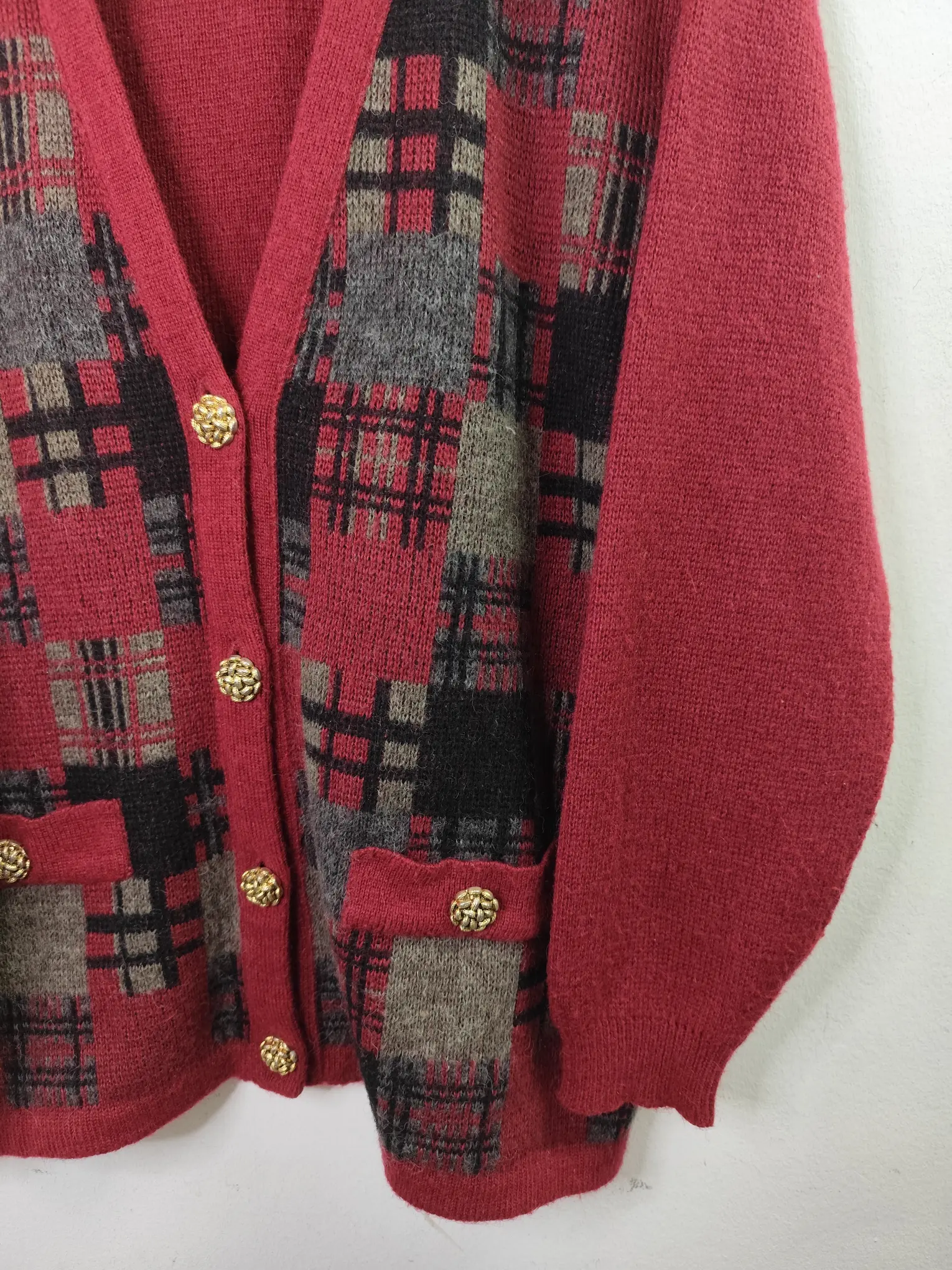 Cárdigan vintage de punto, hecho con mohair y acrílico en color rojo burdeos con estampado de cuadros en gris, negro y marrón y el cuello pico con botones. Ideal para primavera y otoño en los días más fresquitos o para invierno para usarla debajo del abrigo. Queda genial tanto con pantalones vaqueros como con pantalones de pinzas o incluso con una falda para darle un rollo moderno y diferente a tu look.