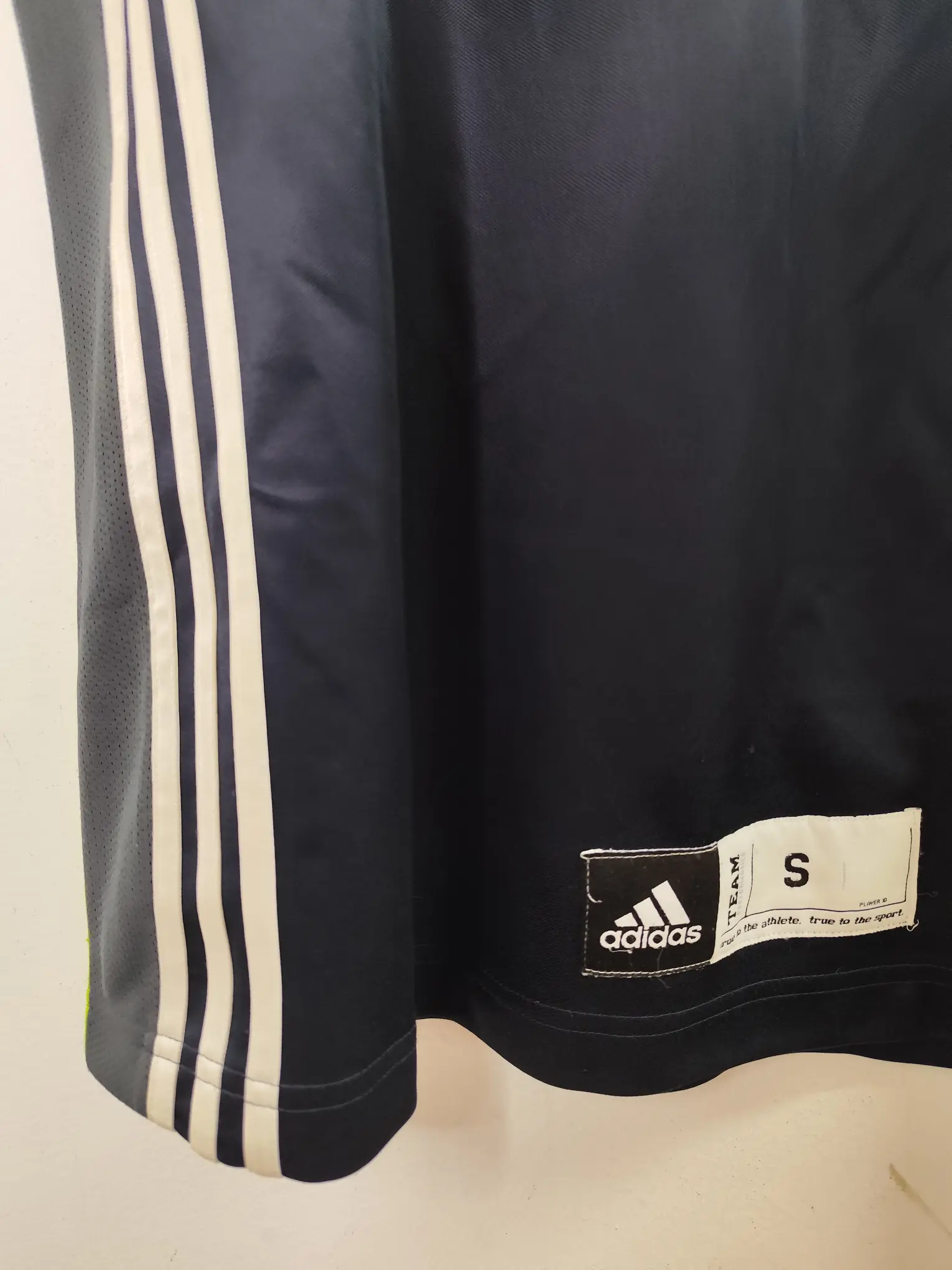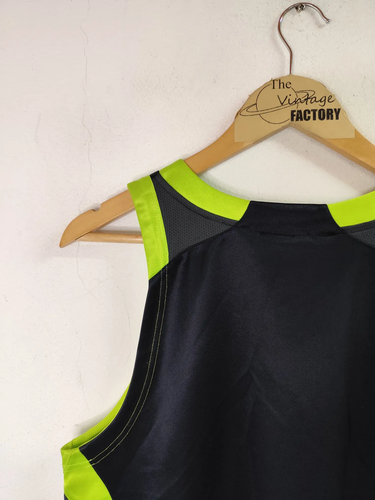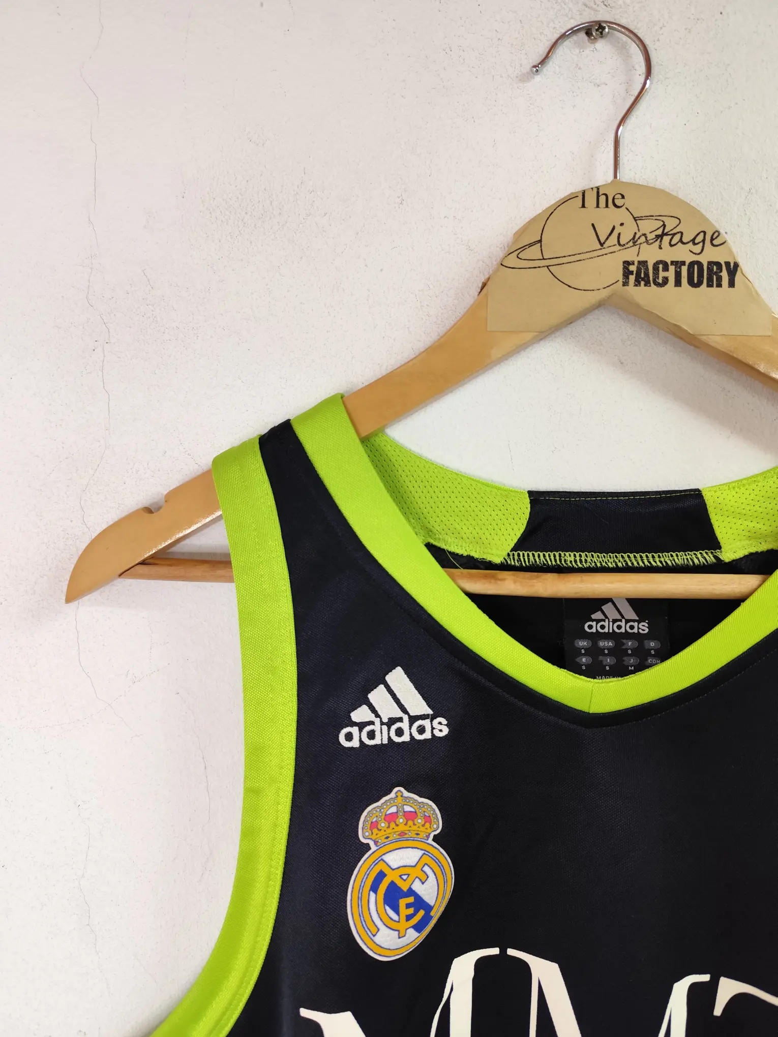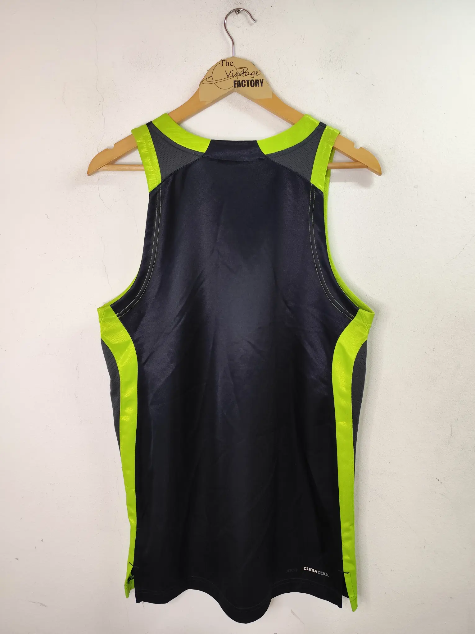Camiseta deportiva técnica del Real Madrid de Adidas de tirantes en color azul marino con detalles en verde fluorescente neón y blanco. Ideal para primavera y verano o para invierno para ir a entrenar. Queda genial tanto con pantalones deportivos como incluso con una falda si quieres darle un rollo más atrevido a tu look.
