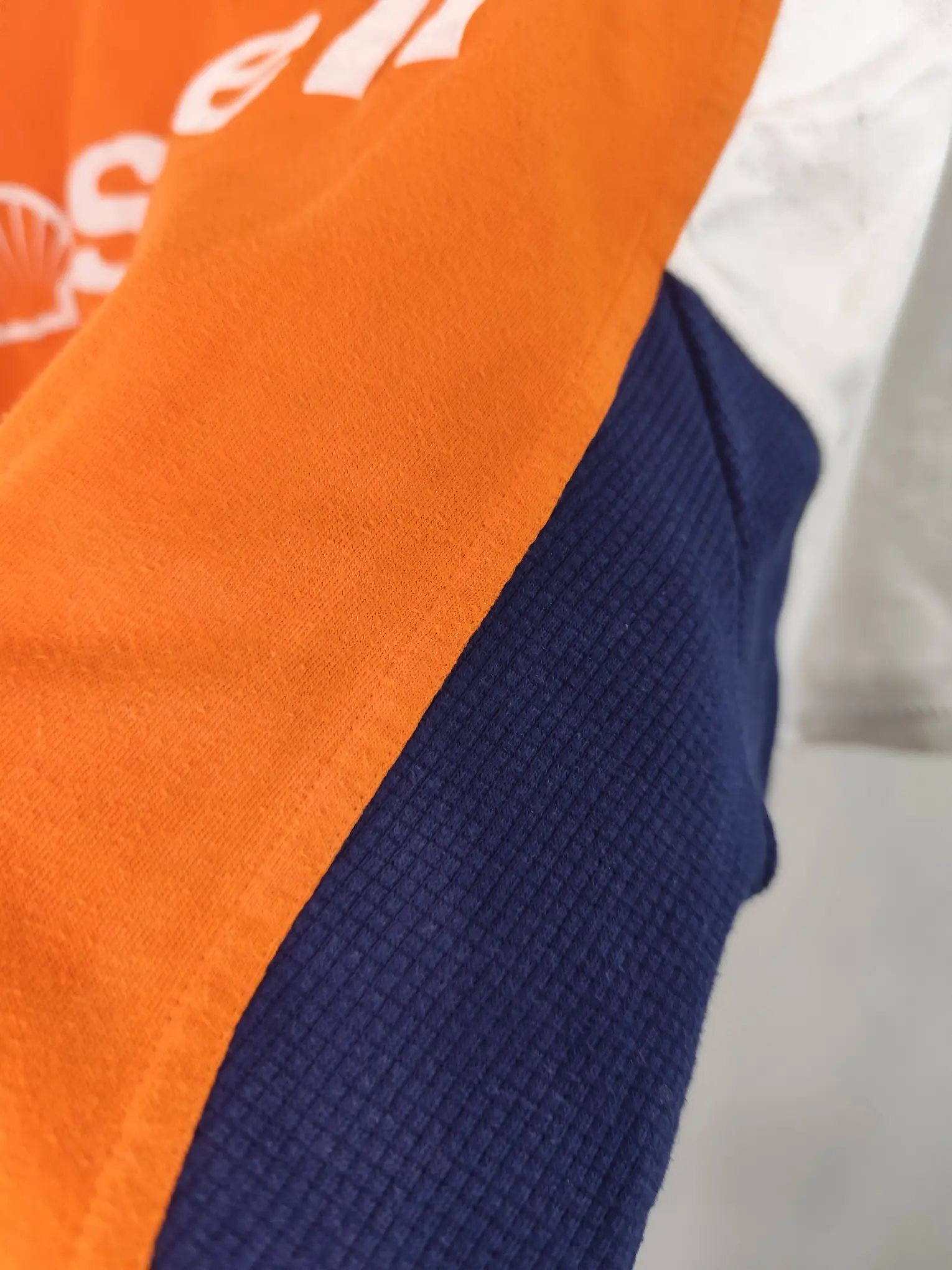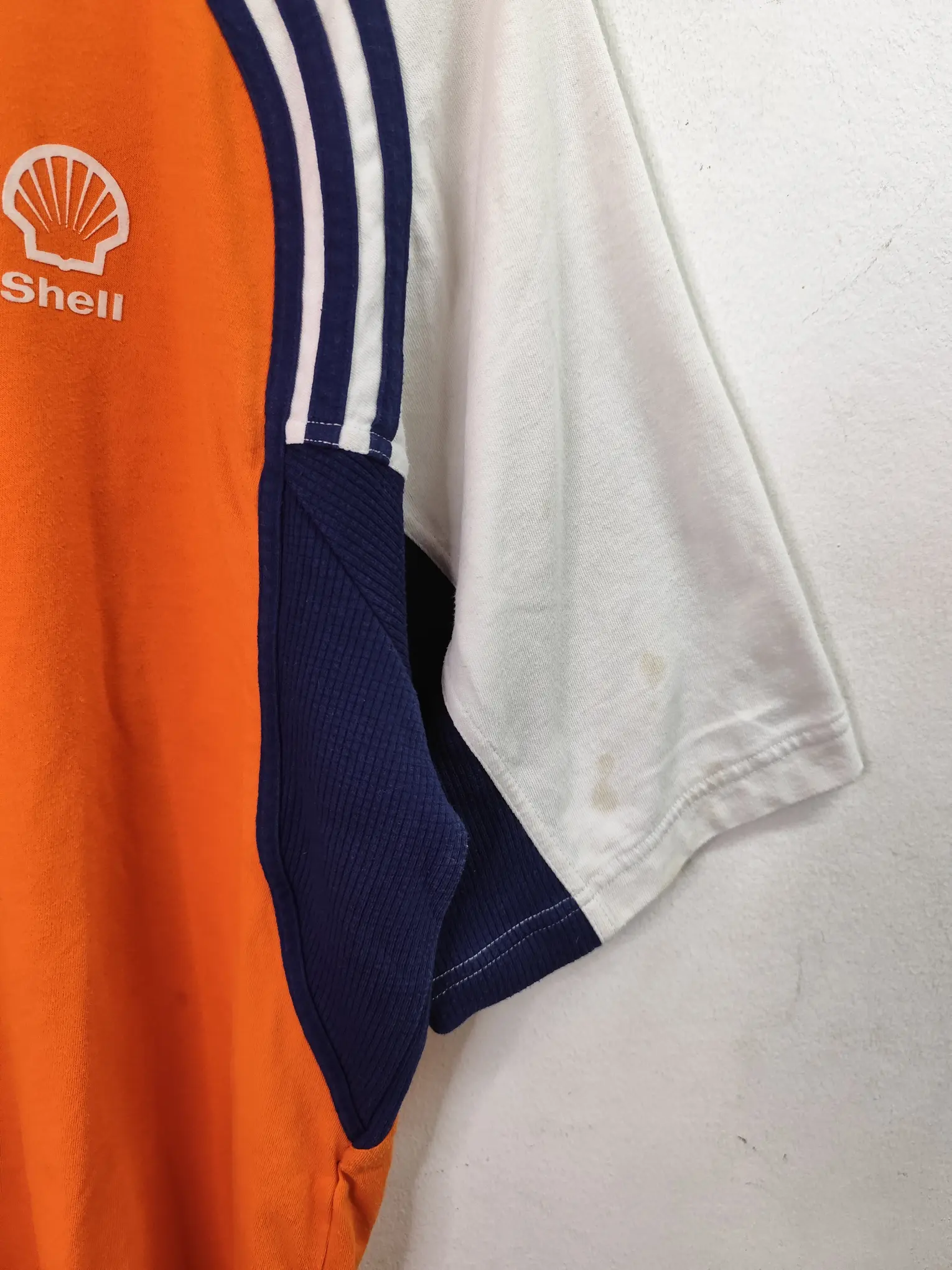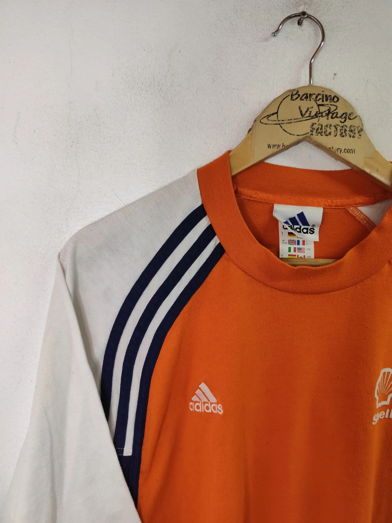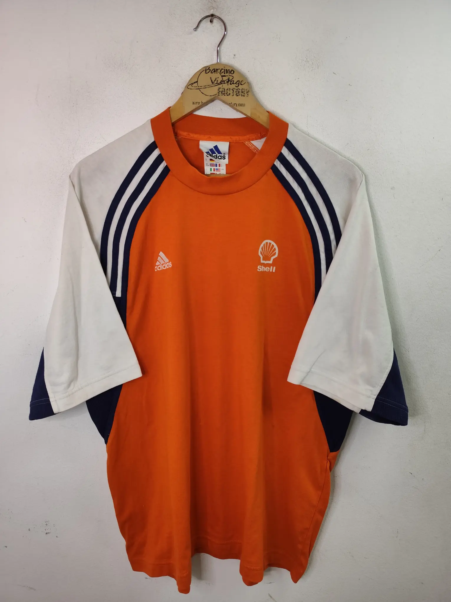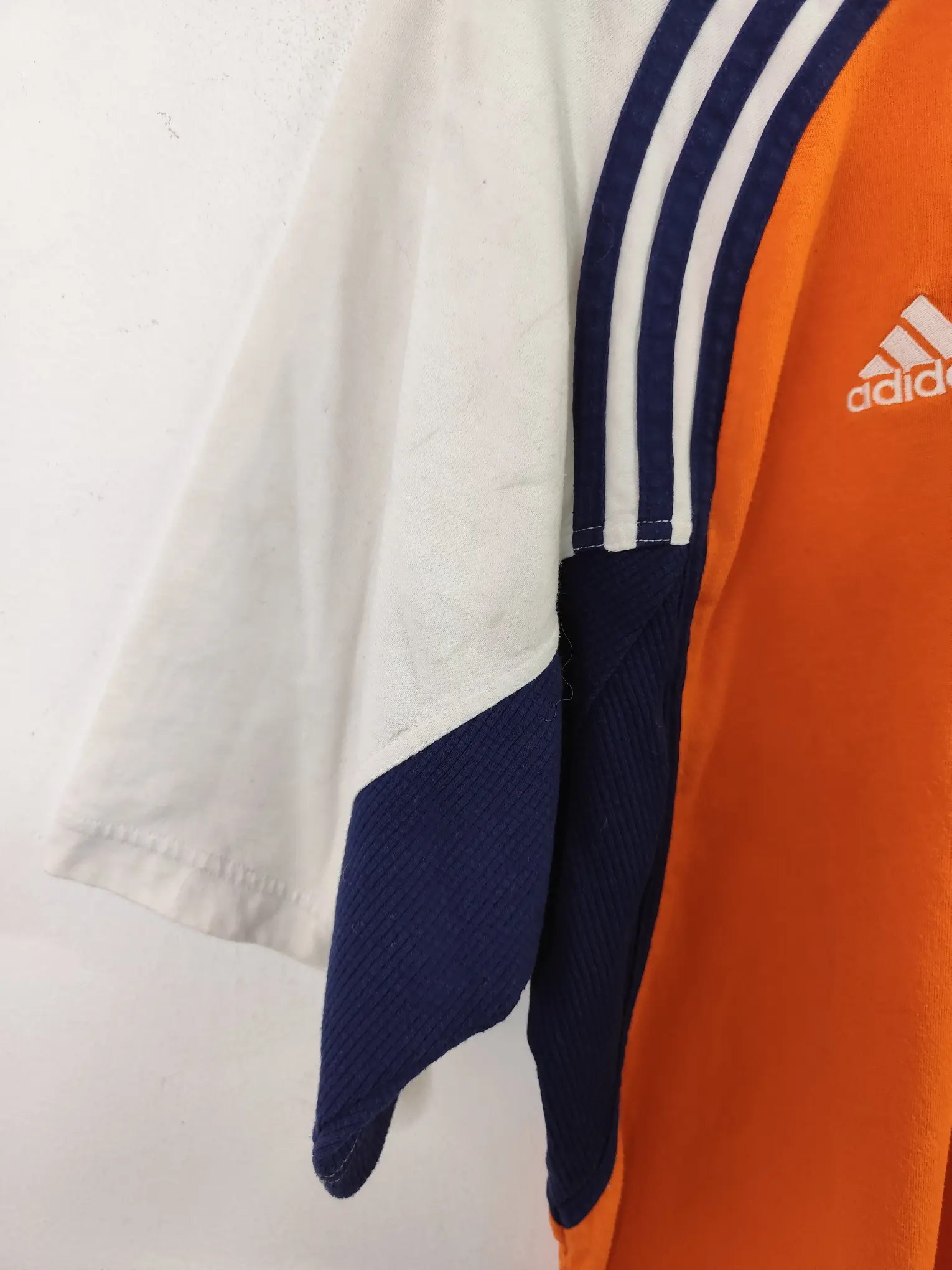 Camiseta Adidas vintage 90s deportiva de algodón de manga corta en color naranja con detalles en azul marino y blanco. Ideal para primavera y verano o para invierno para llevarla con alguna camisa, cazadora vaquera o track jacket abierta. Queda genial tanto con pantalones vaqueros como con pantalones deportivos o incluso con una falda si quieres darle un aire diferente a tu look.