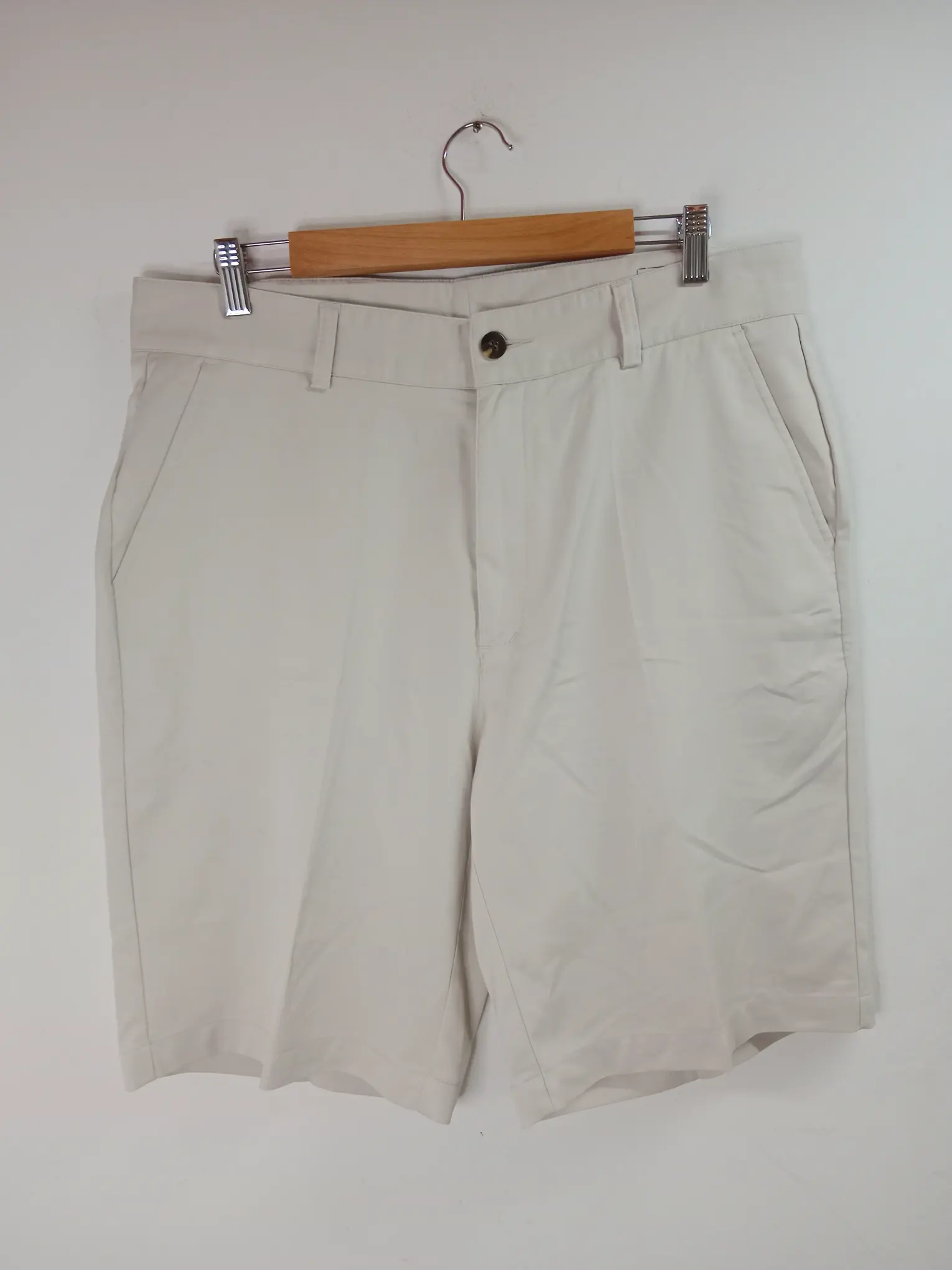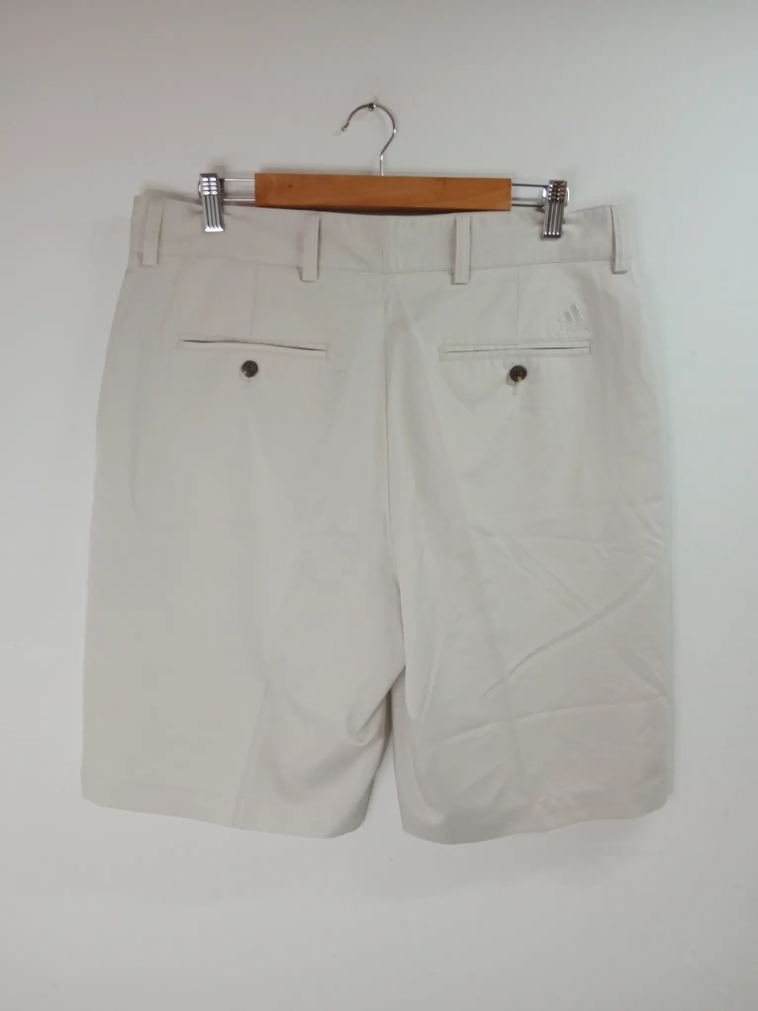 Pantalón corto de vestir en color blanco crema gris claro con el logo bordado y bolsillos. Ideal para primavera y verano en los días más fresquitos, tanto para ir a entrenar como para combinarlo con alguna camiseta chula o algún polo vintage técnico deportivo con algún bordado y darle un giro a tu look.