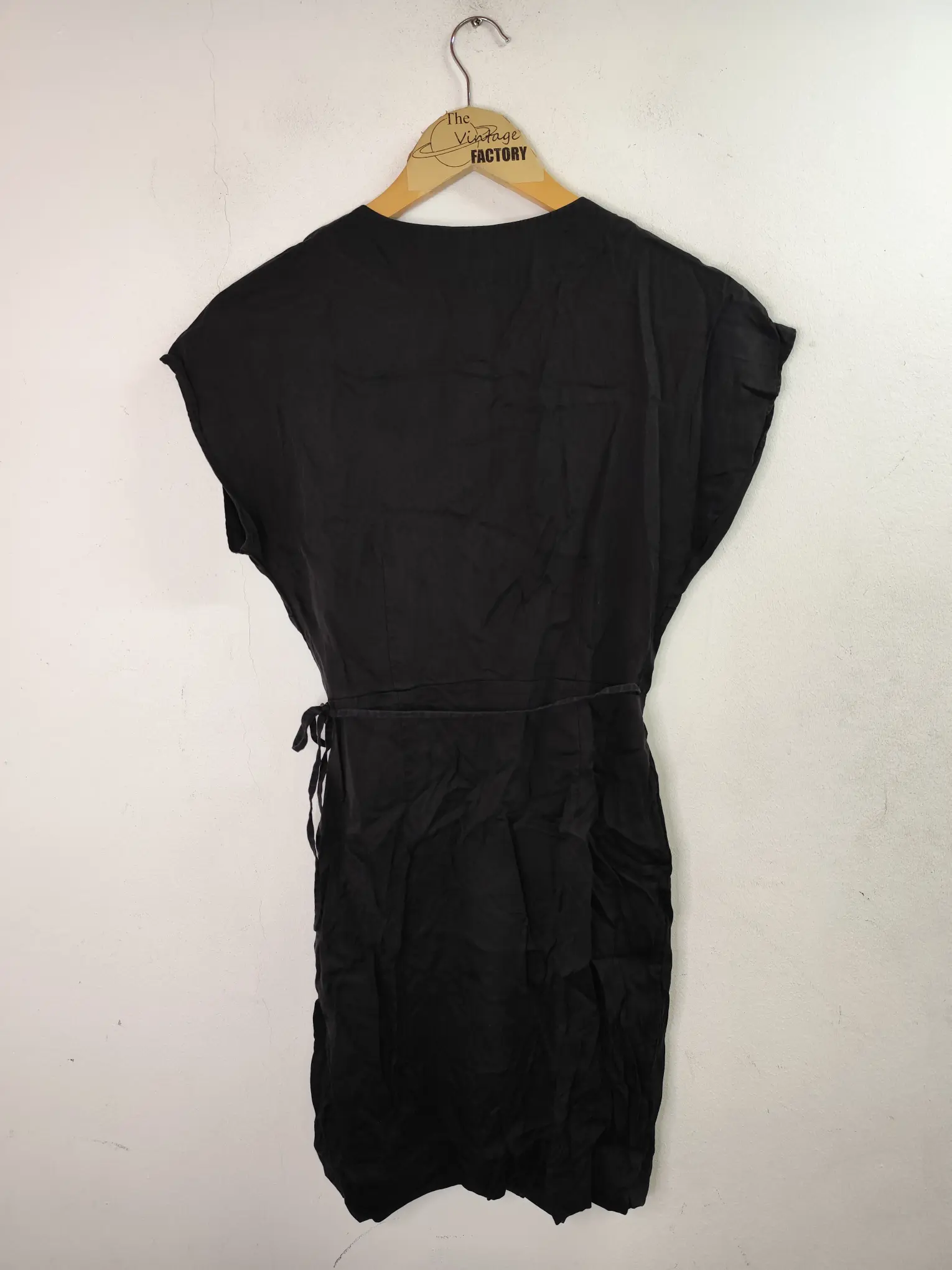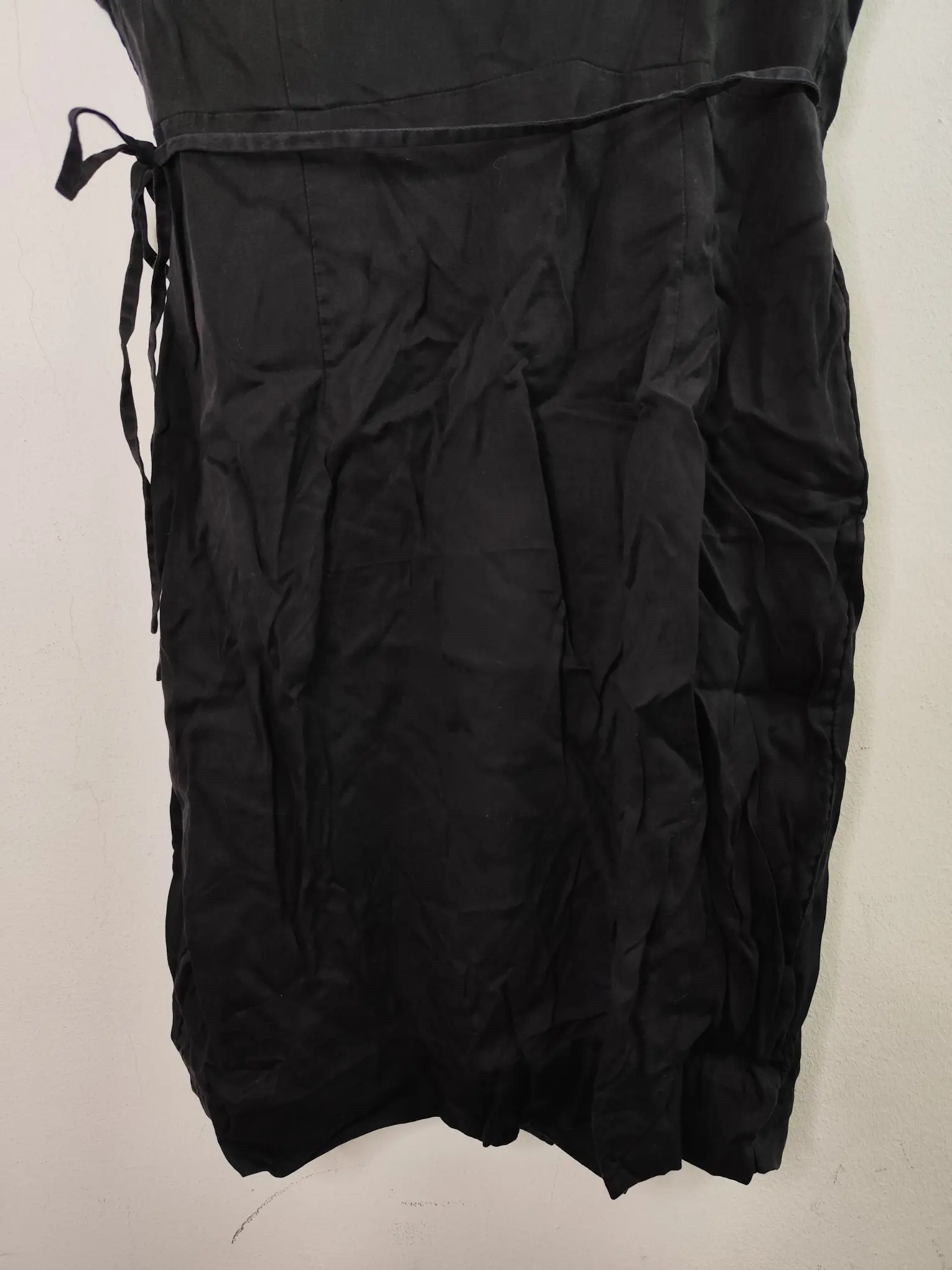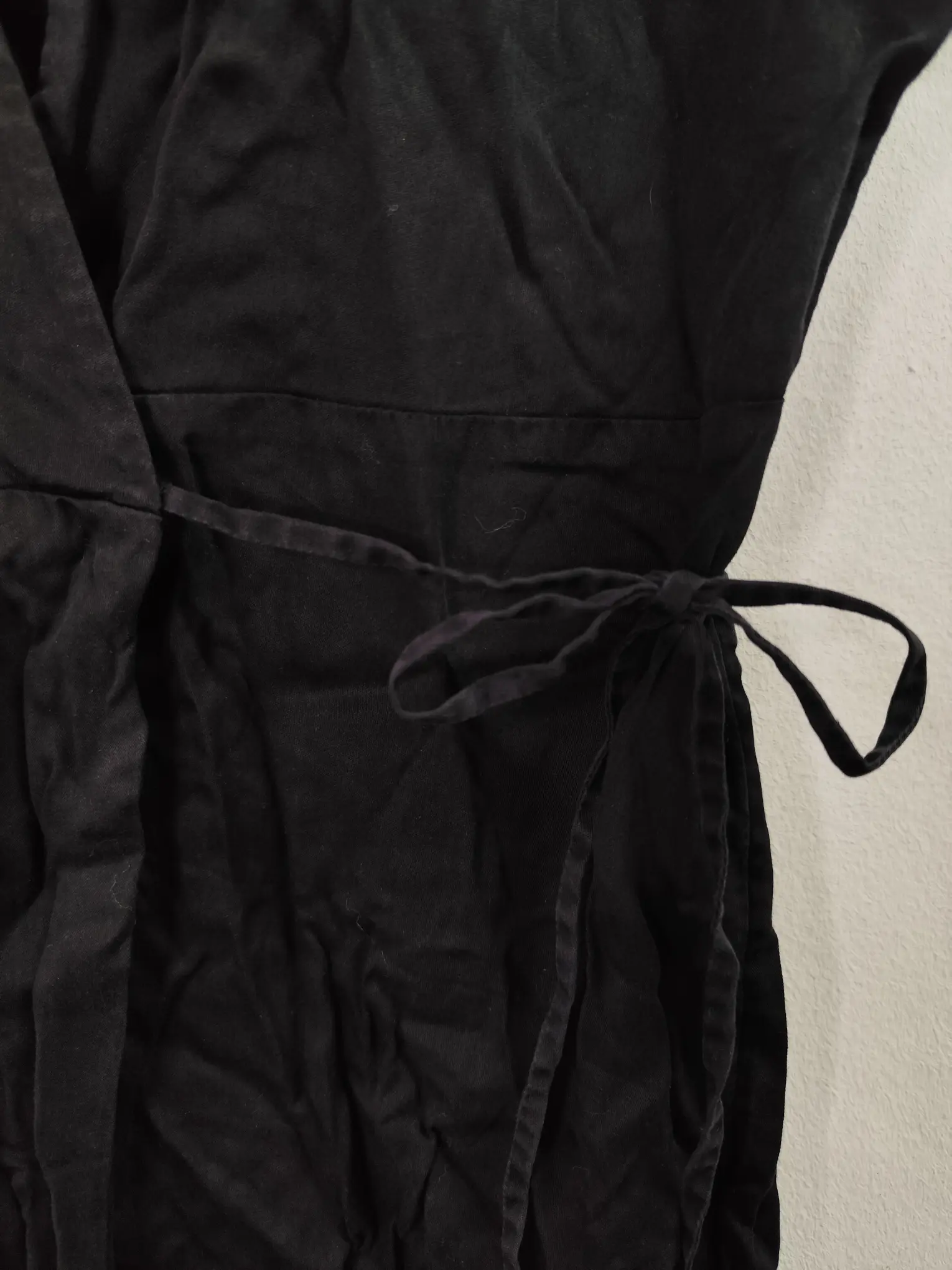 Vestido de primavera verano en color negro de manga corta con el cuello de pico y lazo, corto por la rodilla. Ideal para primavera y verano en los días más fresquitos o para invierno para llevarla con alguna americana o chaqueta tipo cazadora.