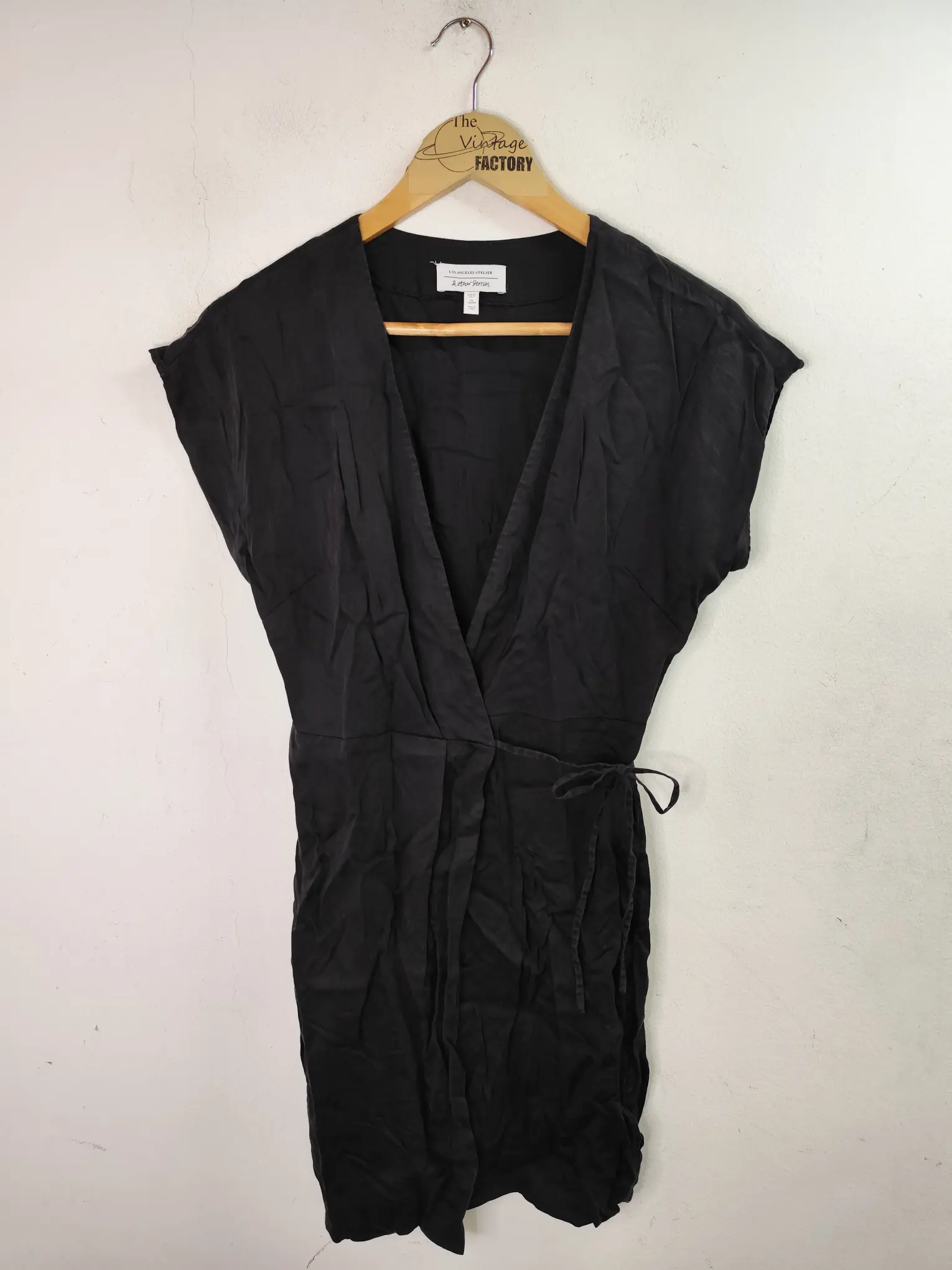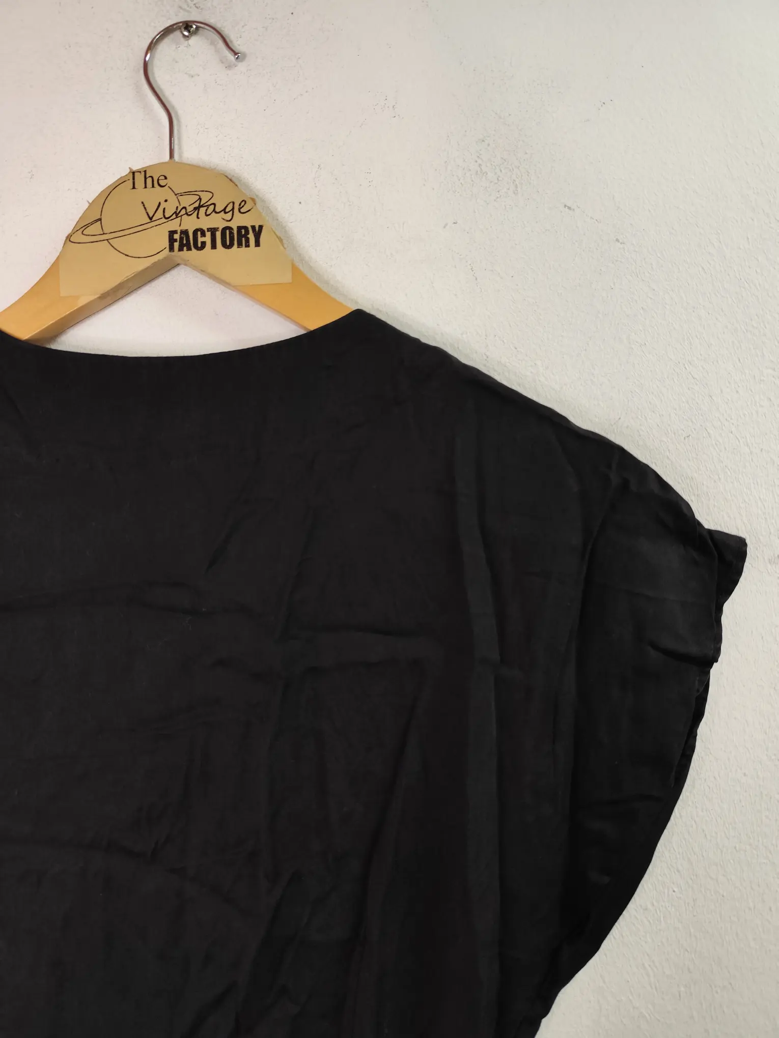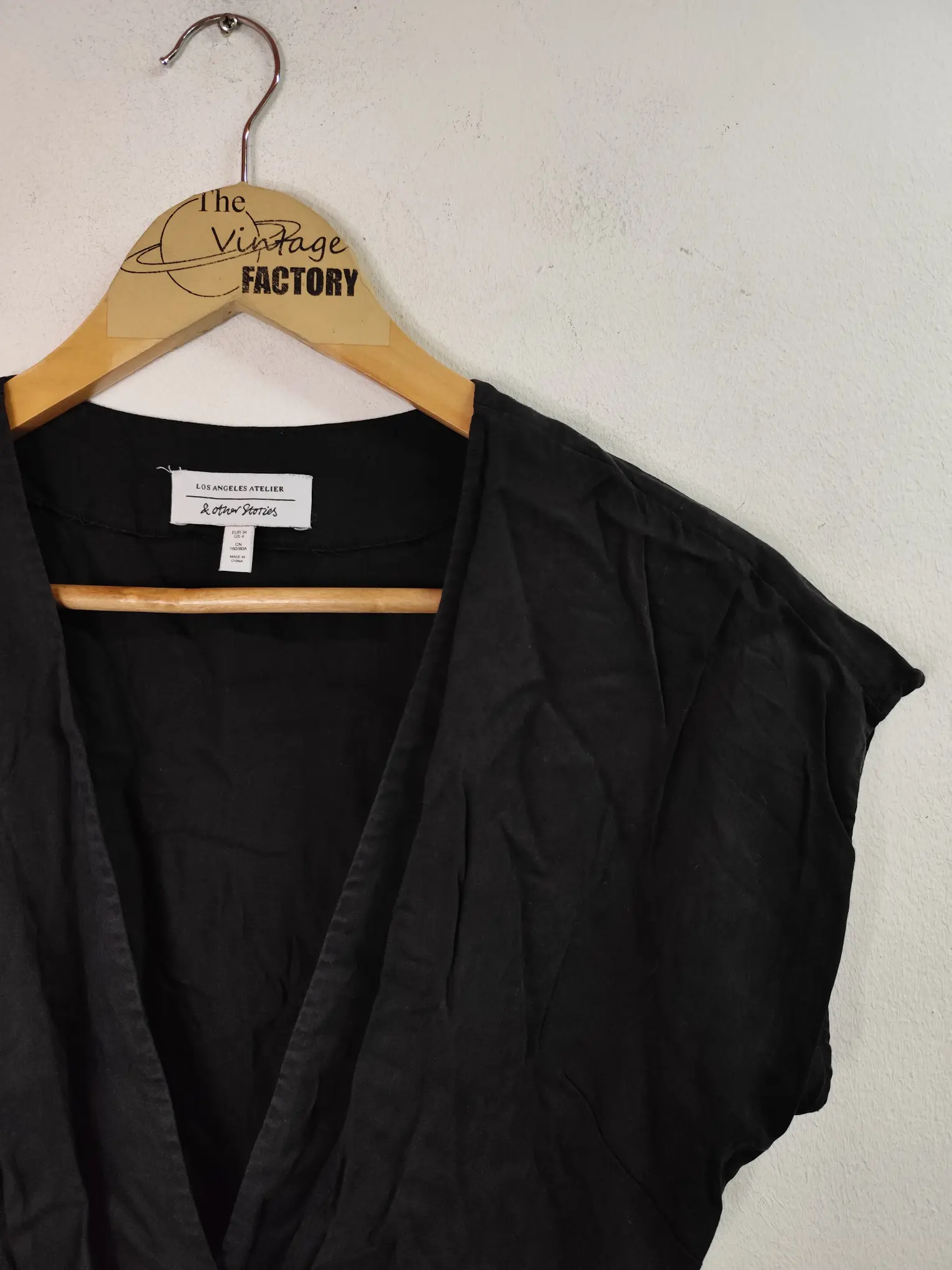 Vestido de primavera verano en color negro de manga corta con el cuello de pico y lazo, corto por la rodilla. Ideal para primavera y verano en los días más fresquitos o para invierno para llevarla con alguna americana o chaqueta tipo cazadora.