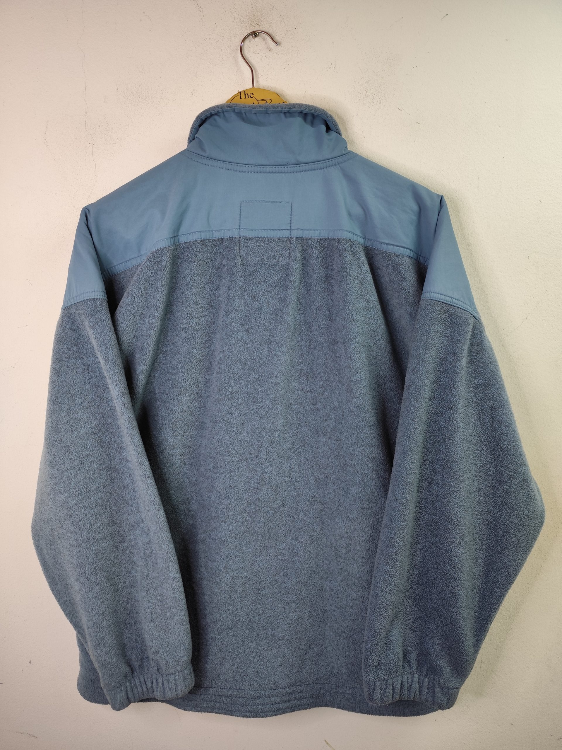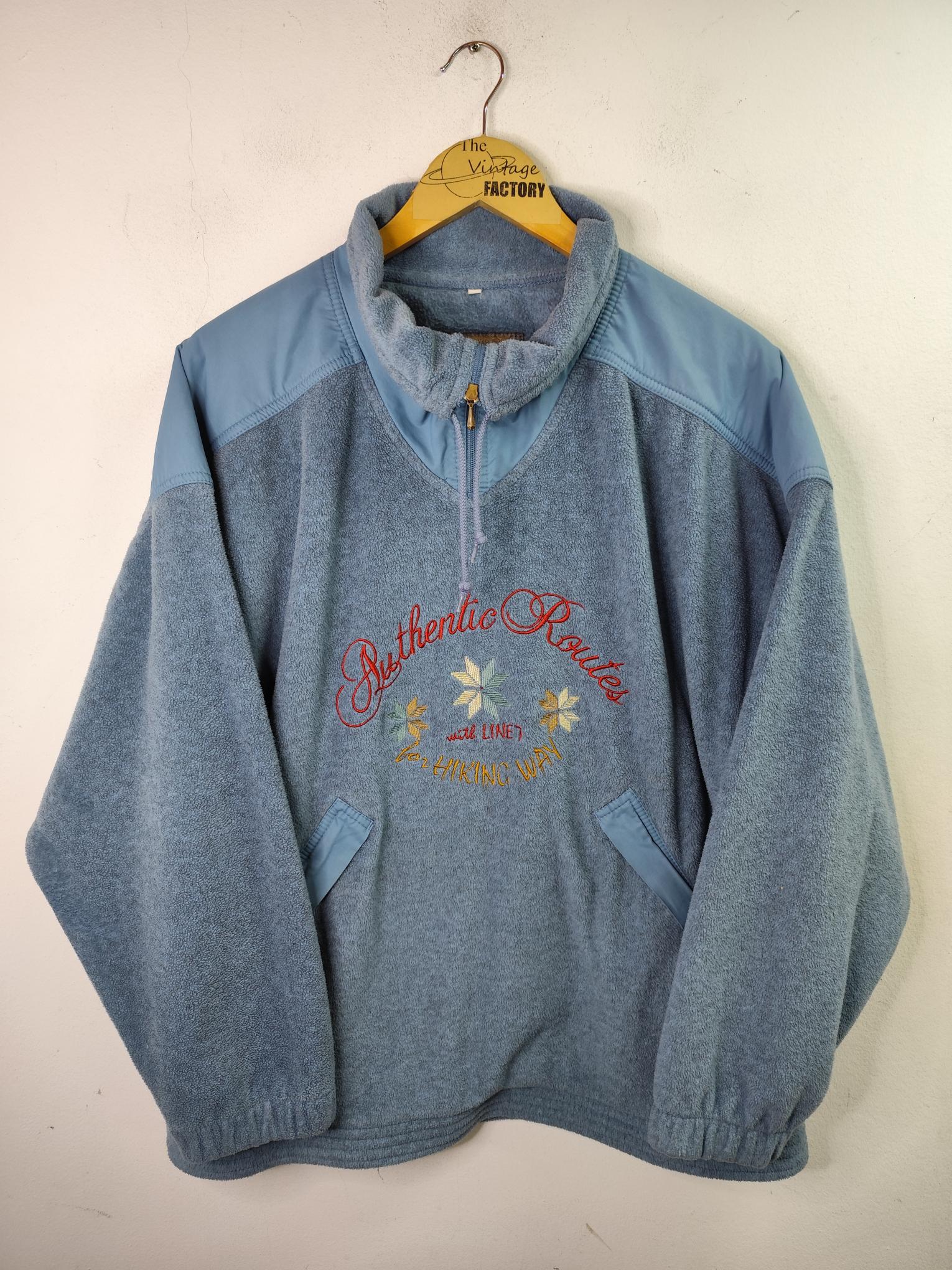 Forro polar azul claro bordado con media cremallera, cuello alto y bolsillos. Ideal para los días más fríos de invierno para usarlo con más capas debajo o encima. Queda genial tanto con pantalones vaqueros como con pantalones deportivos o incluso con una falda si quieres darle un giro a tu outfit de diario sin dejar de ir cómoda y calentita.