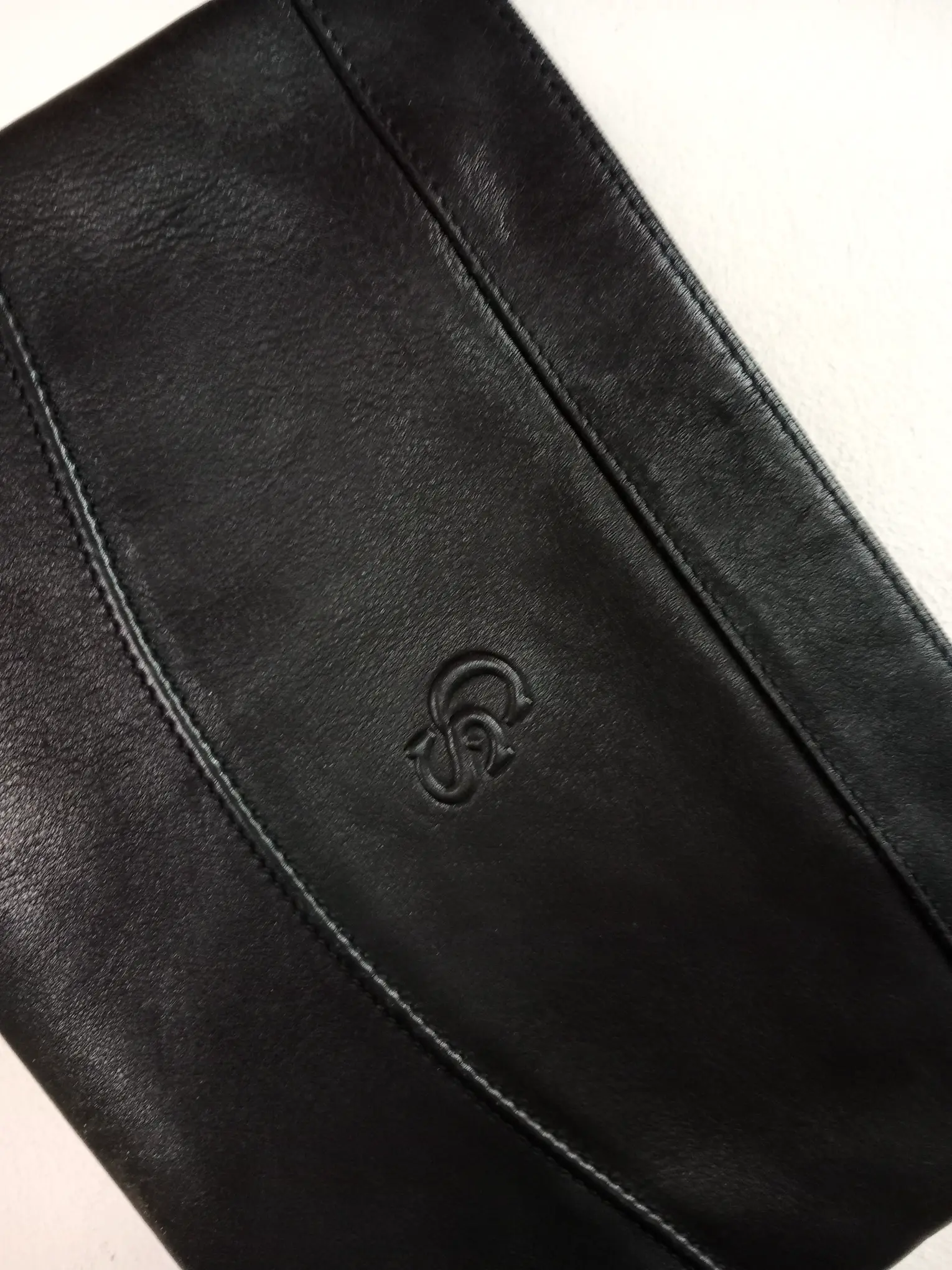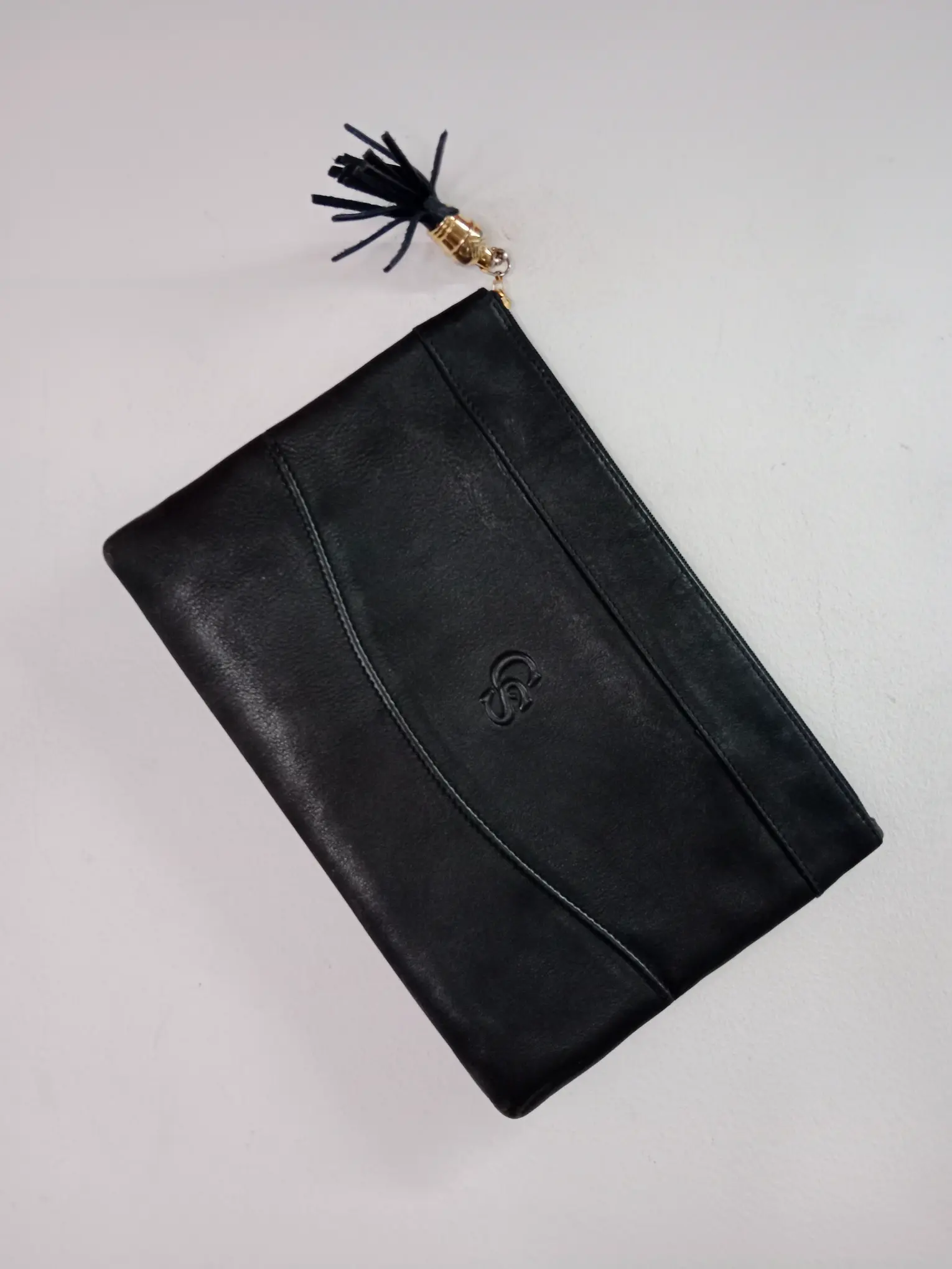 Bolso de piel vintage tipo neceser de mano portadocumentos en color azul marino con detalles grabados en relieve. Tiene cremallera y detalles en dorado.