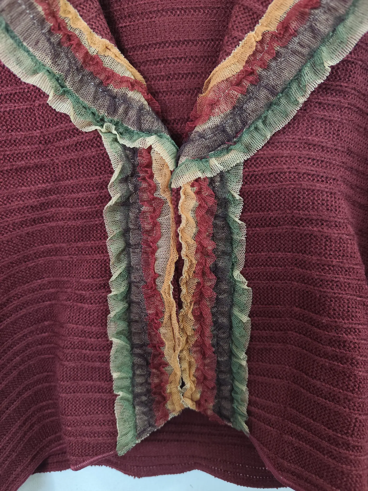Chaquetilla de punto tipo americana abierta en color burdeos granate con volantes en el cuello en color verde y amarillo mostaza. Ideal para primavera y verano en los días más fresquitos o para invierno para usarla debajo del abrigo. Queda genial tanto con pantalones vaqueros como con pantalones de pinzas o incluso con una falda para darle un rollo moderno y diferente a tu look.