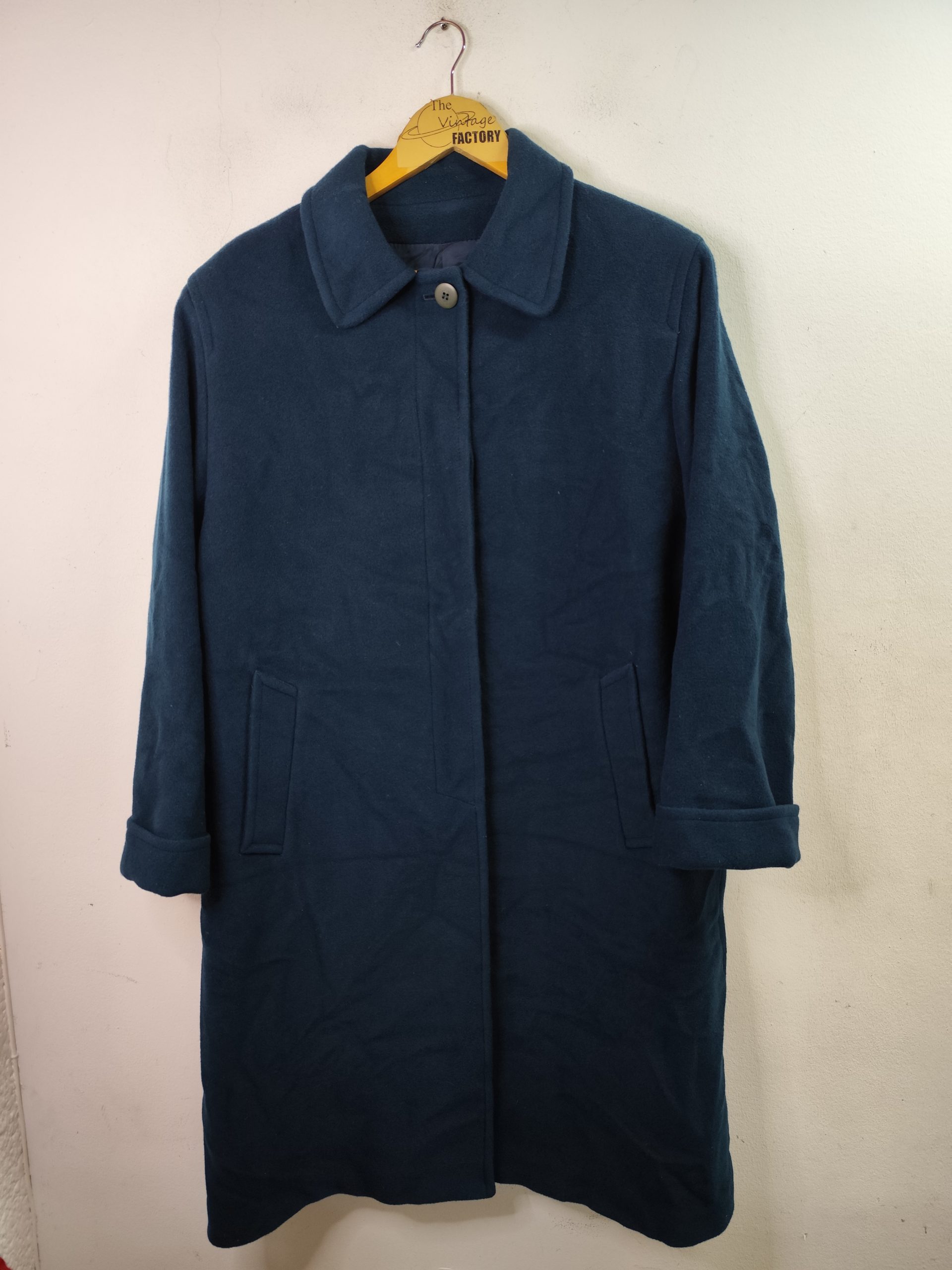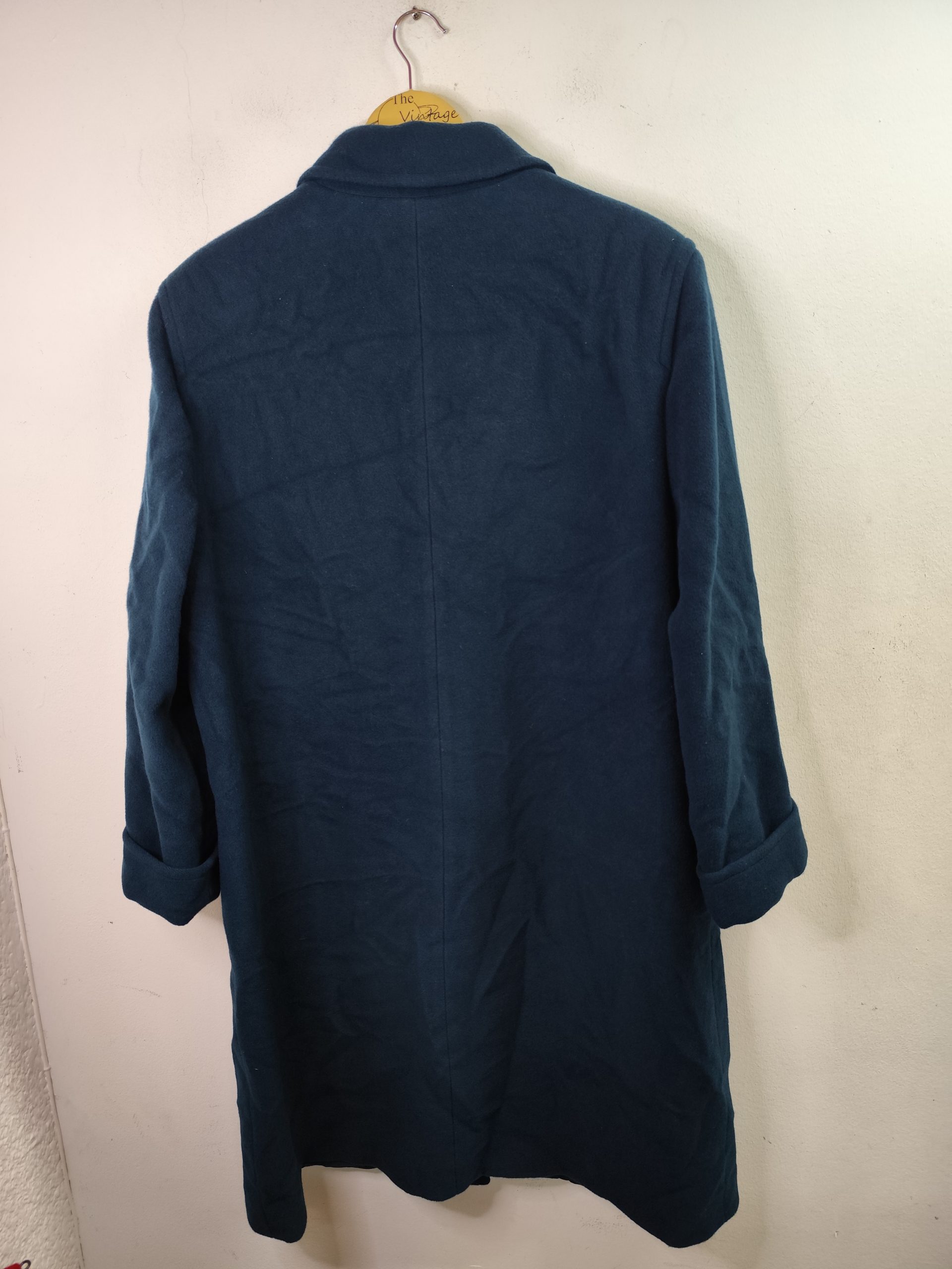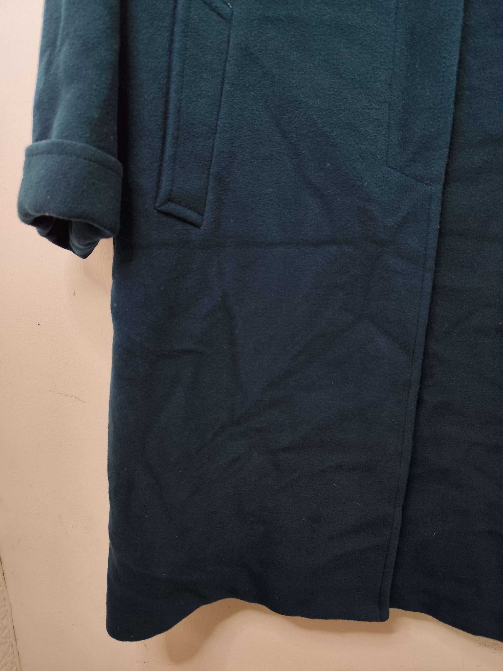 Abrigo largo con botones, bolsillos y dobladillo en las mangas. Color verde azulado aqua oscuro. Ideal para los días más fríos de invierno para usarla con más capas debajo del abrigo, como una sudadera o jersey de punto. Queda genial tanto con pantalones vaqueros como con pantalones tipo chinos o de pinzas, o incluso con una falda.