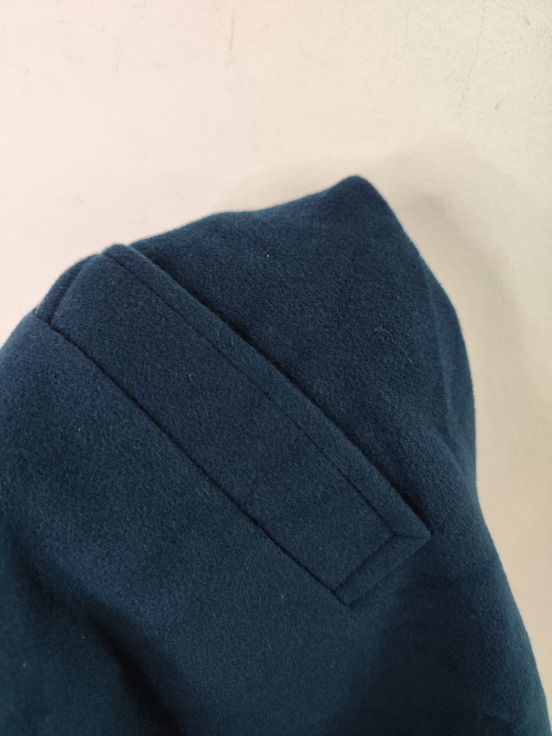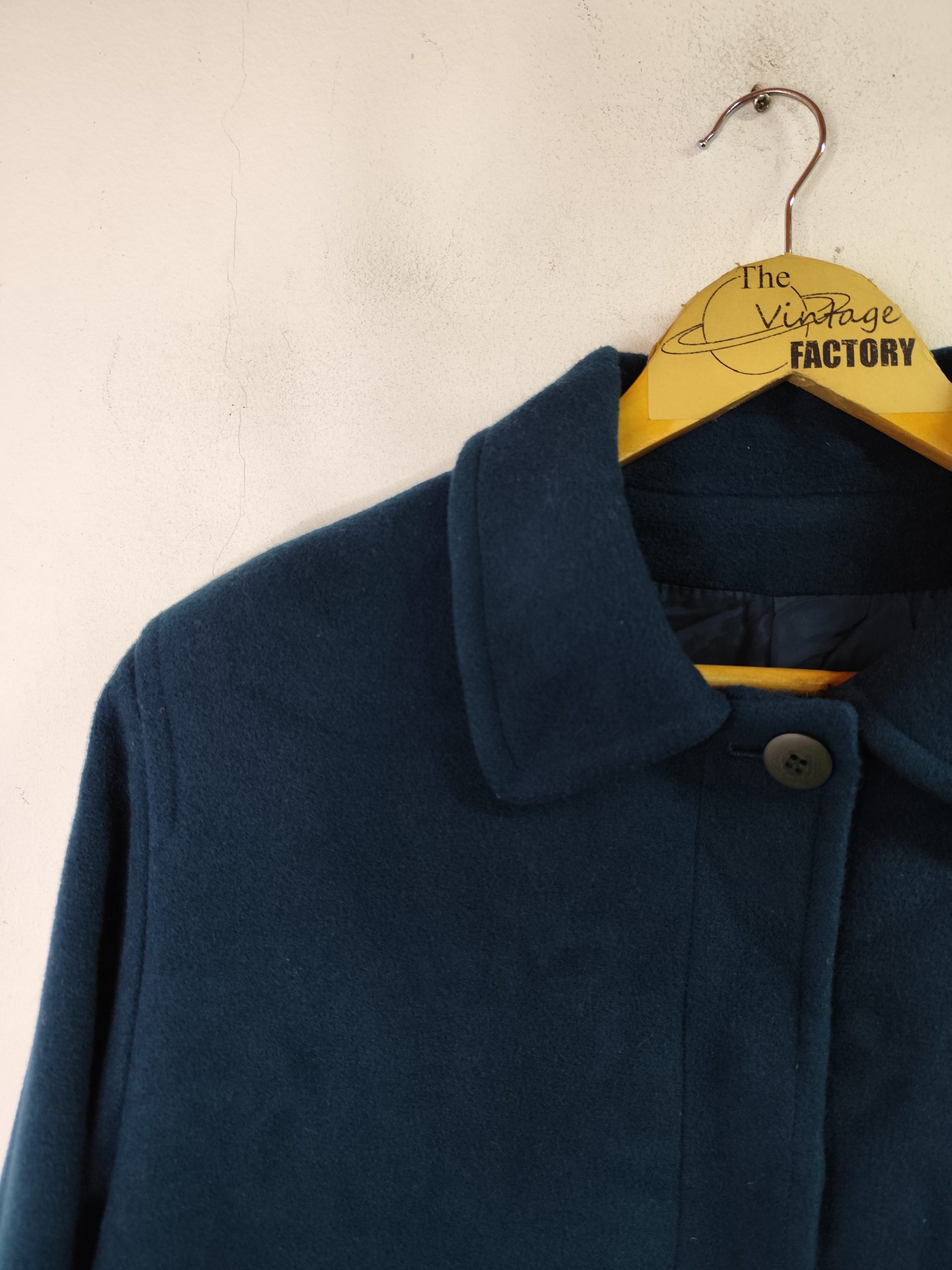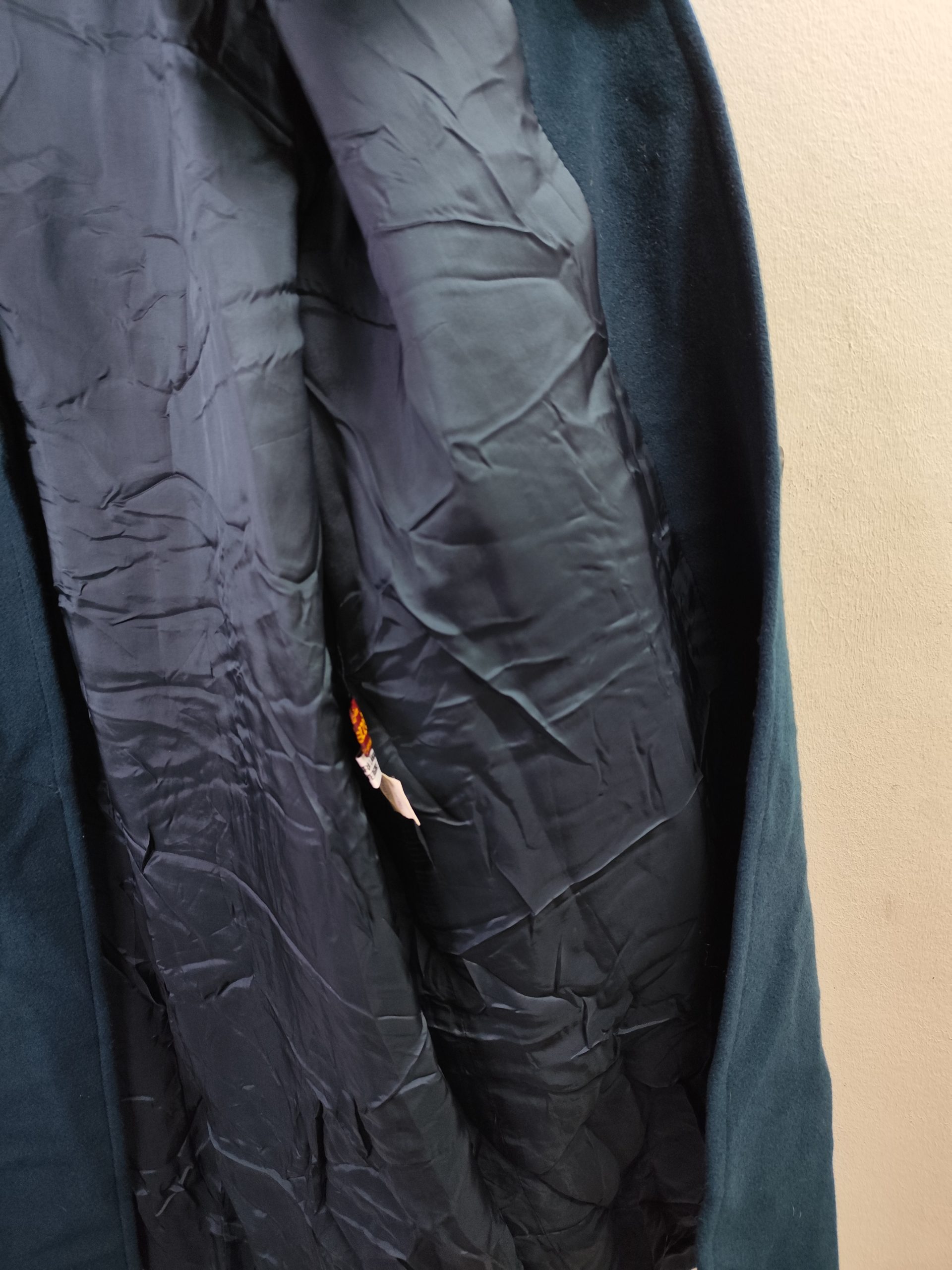 Abrigo largo con botones, bolsillos y dobladillo en las mangas. Color verde azulado aqua oscuro. Ideal para los días más fríos de invierno para usarla con más capas debajo del abrigo, como una sudadera o jersey de punto. Queda genial tanto con pantalones vaqueros como con pantalones tipo chinos o de pinzas, o incluso con una falda.
