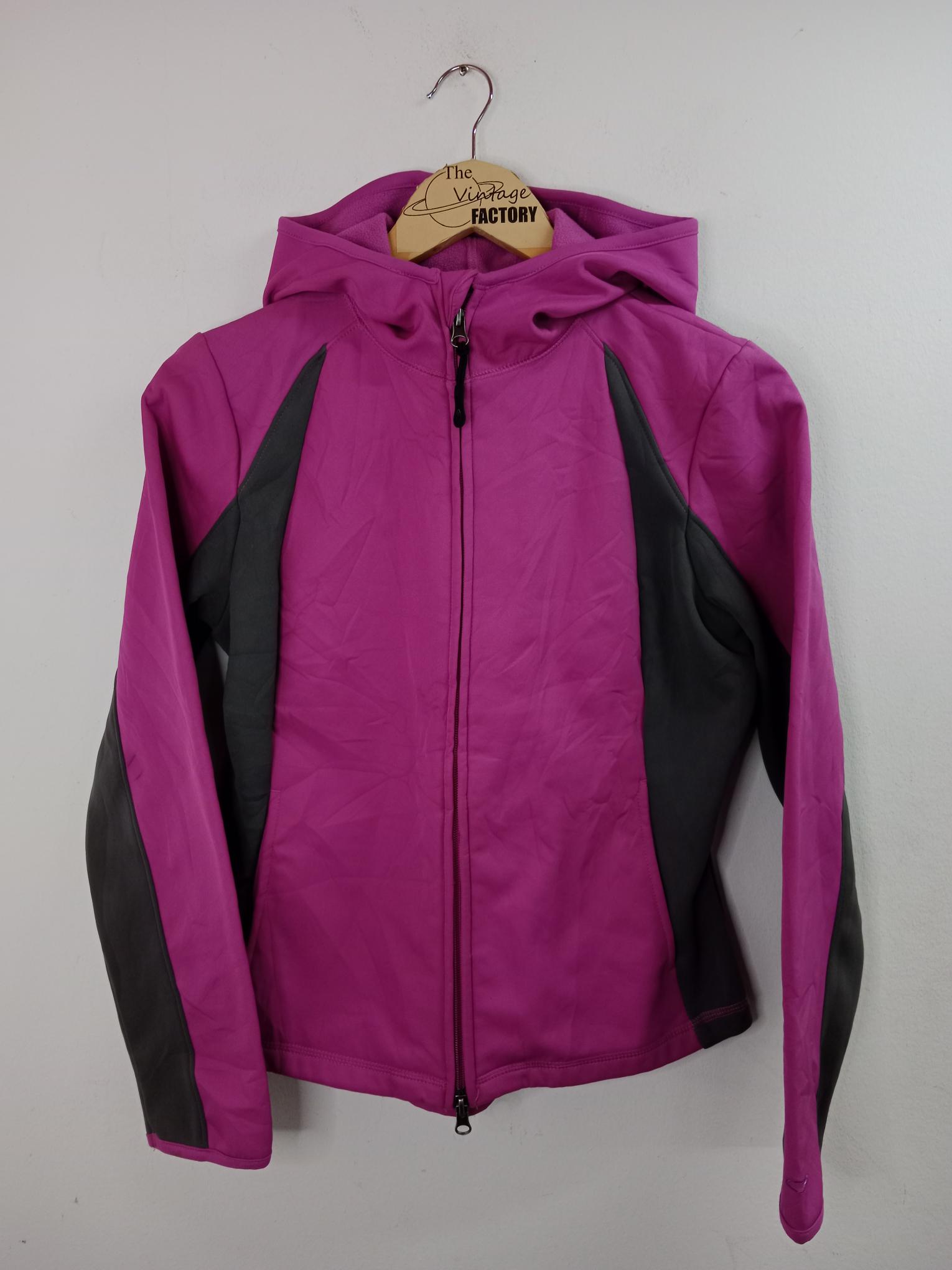 Chaqueta deportiva con capucha y bolsillos en color rosa y gris oscuro con cremallera. Preloved and preworn.