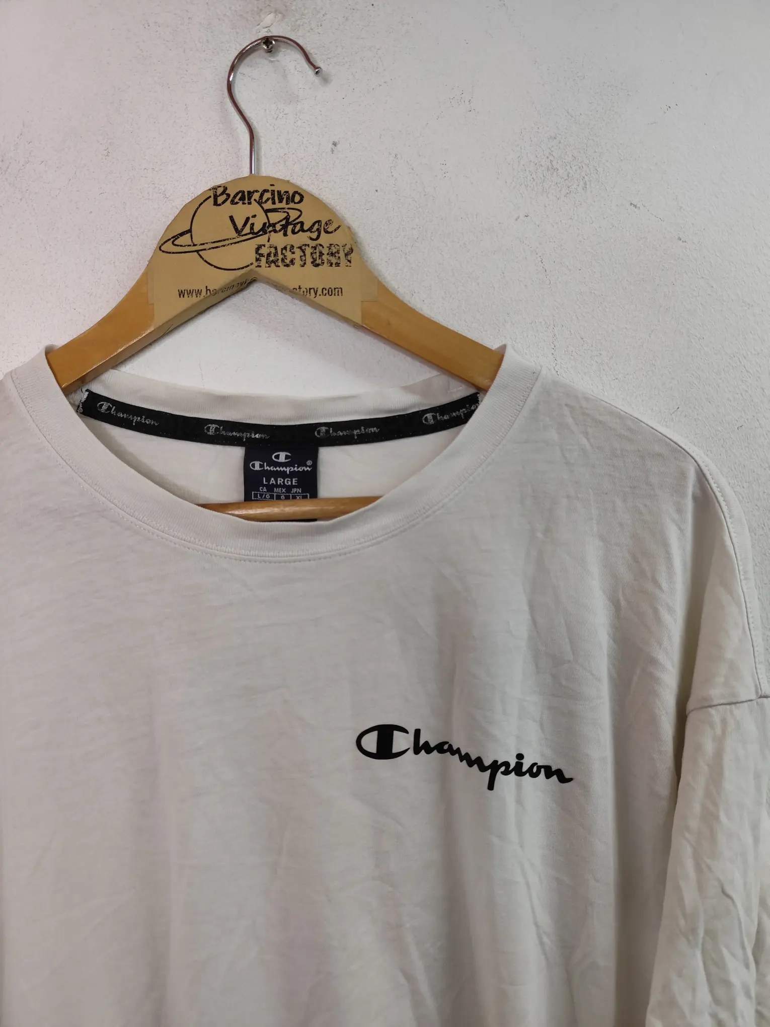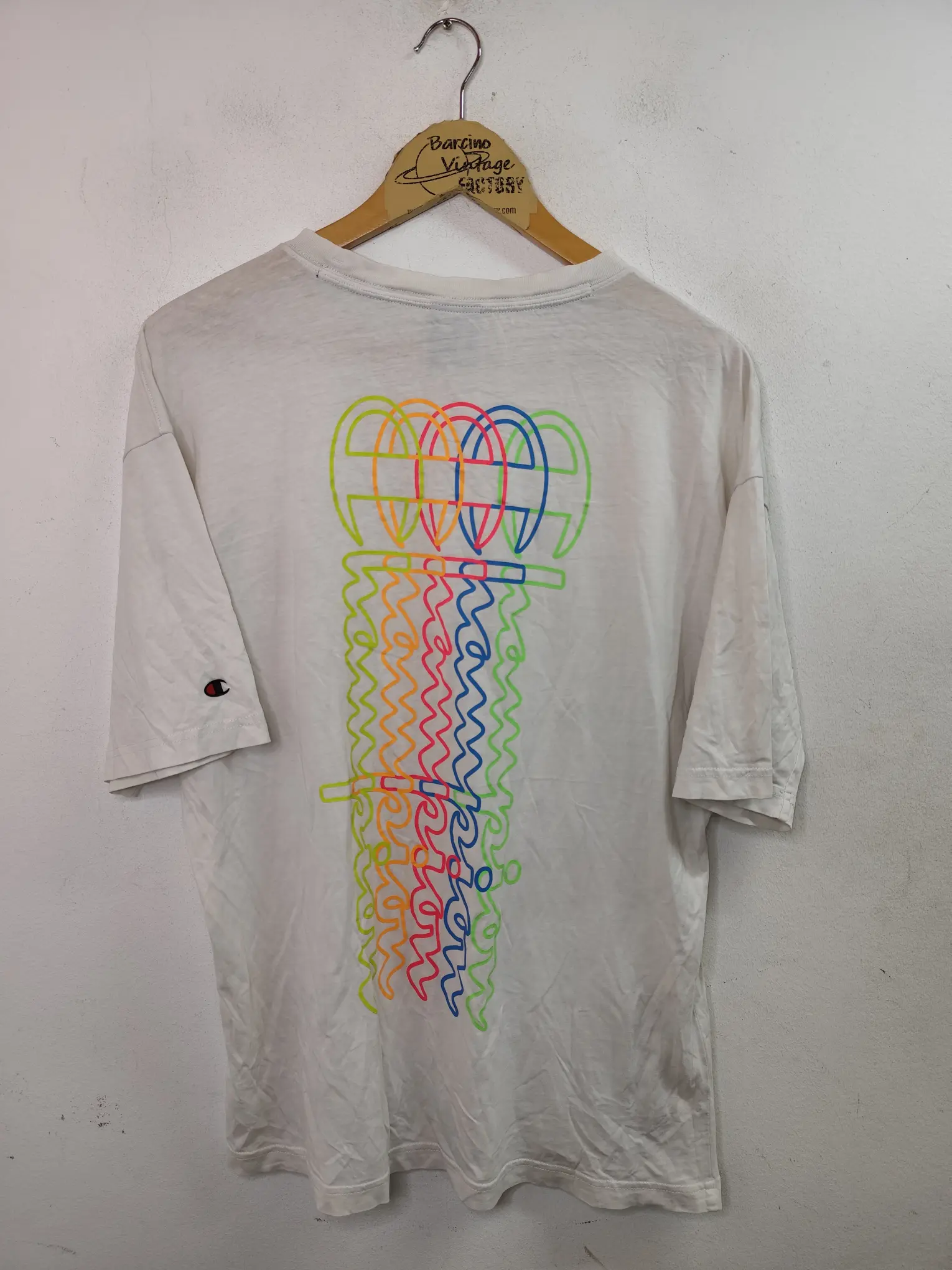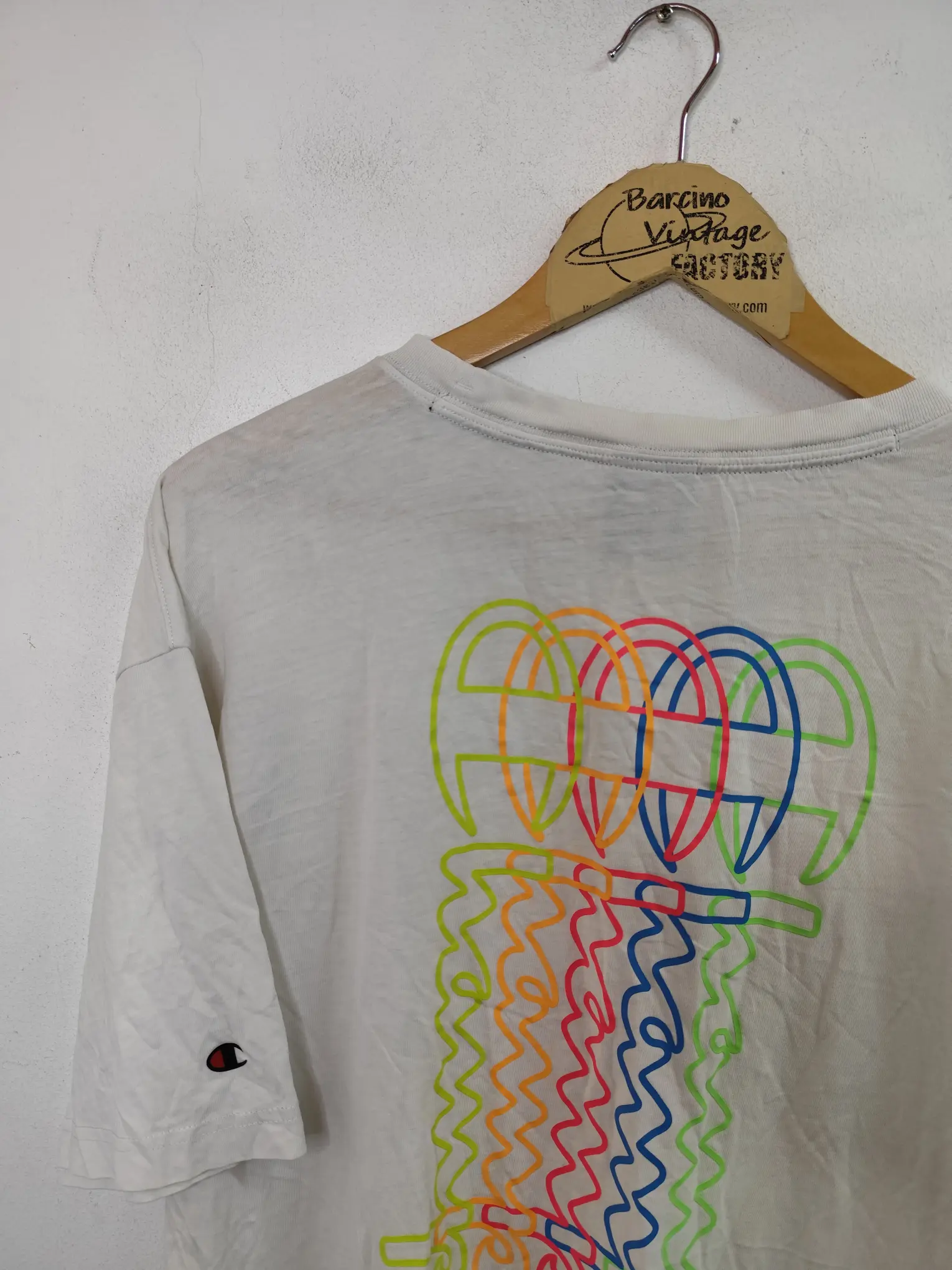 Camiseta Champion deportiva de algodón de manga corta en color blanco con estampado trasero del logo en varios colores fosforito neón. Ideal para primavera y verano o para invierno para llevarla con alguna camisa, cazadora vaquera o track jacket abierta. Queda genial tanto con pantalones vaqueros como con pantalones deportivos o incluso con una falda si quieres darle un aire diferente a tu look.