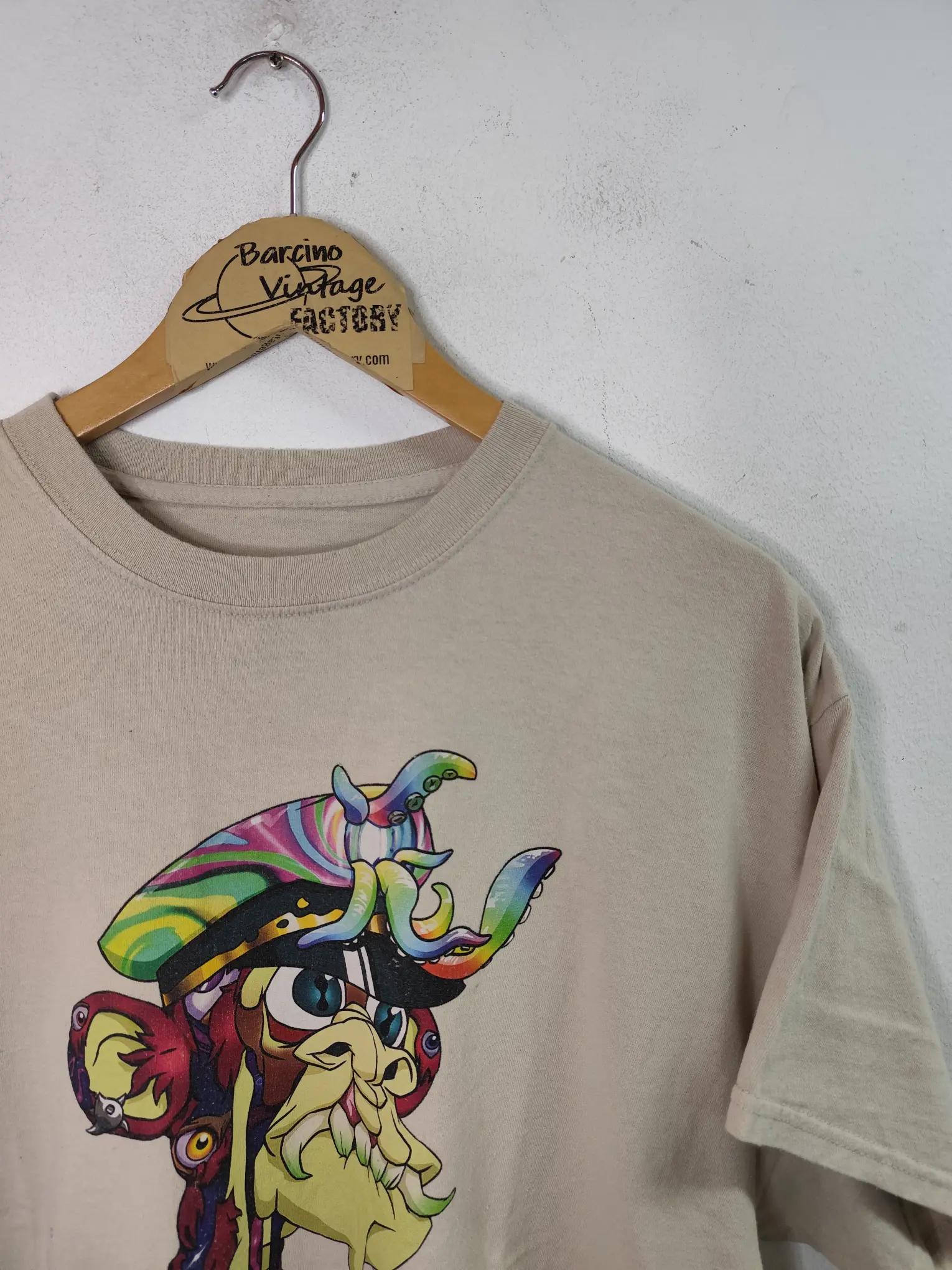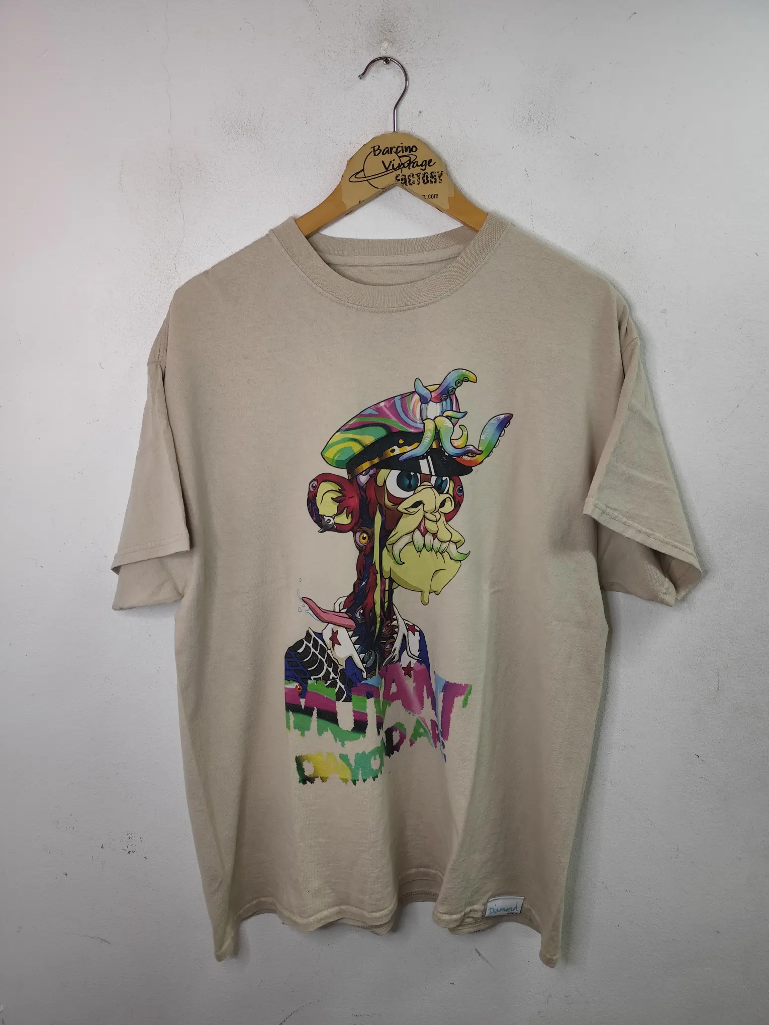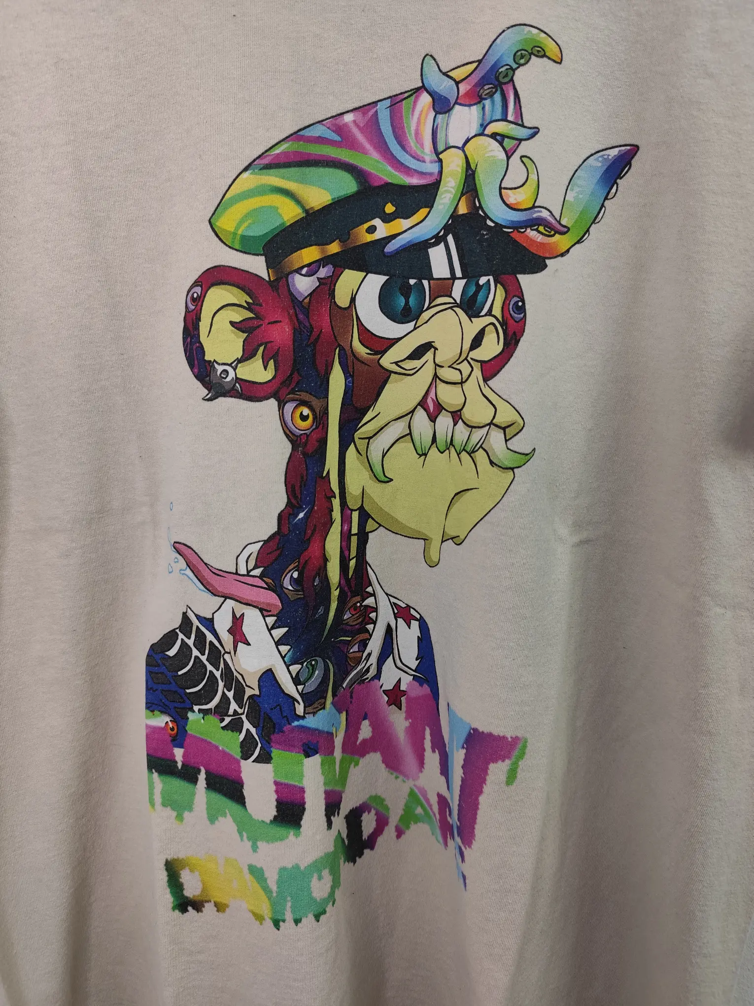 Camiseta de manga corta de algodón en color beige blanco crema con estampado frontal de un mono marinero mutante en varios colores. Ideal para primavera y verano o para invierno para llevarla con alguna camisa, cazadora vaquera o track jacket abierta. Queda genial tanto con pantalones vaqueros como con pantalones deportivos o incluso con una falda si quieres darle un aire diferente a tu look.