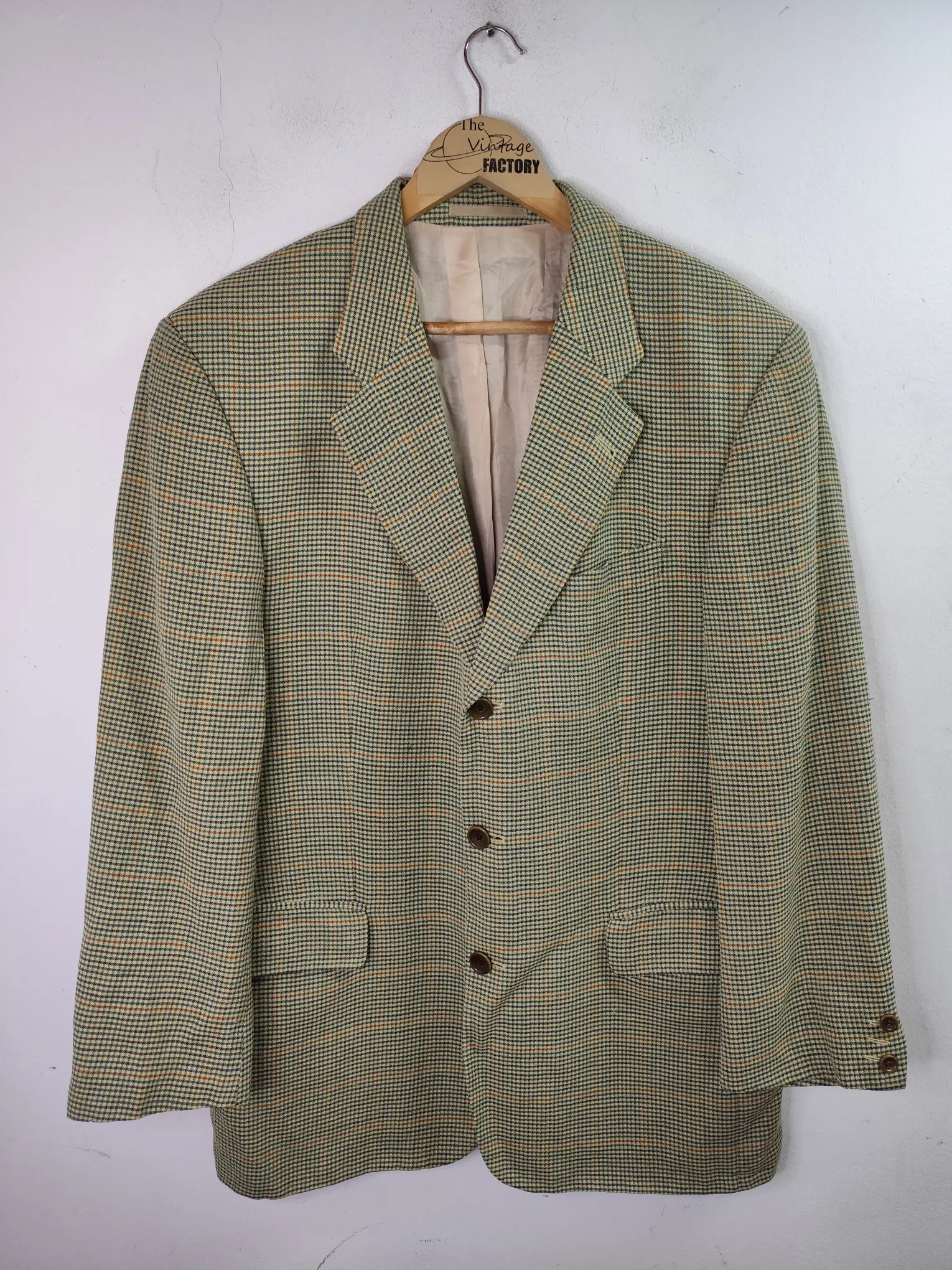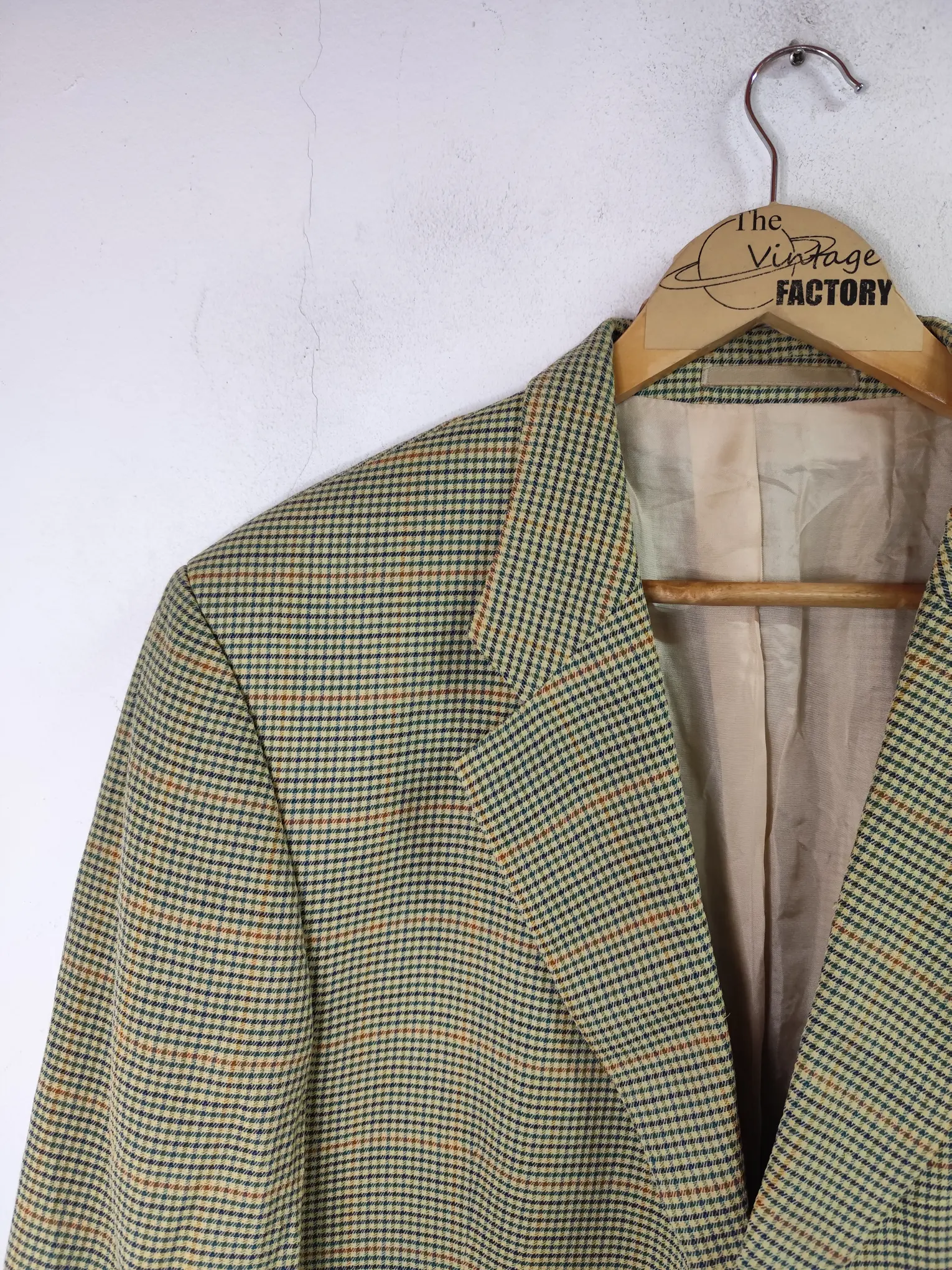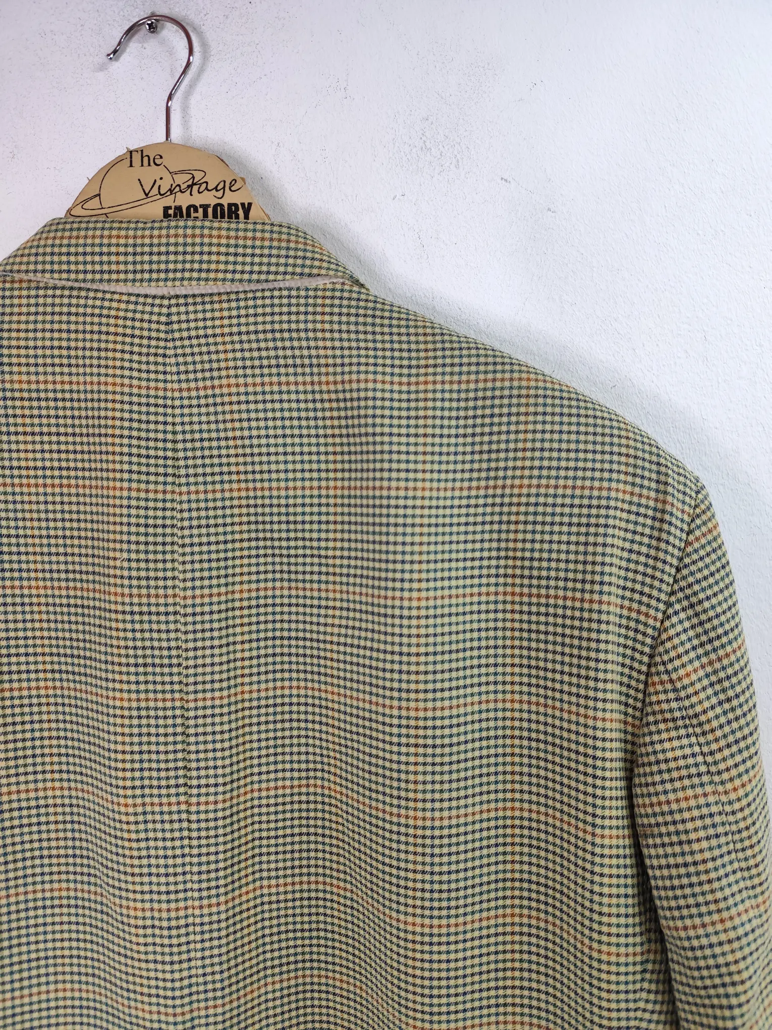 Americana vintage tipo blazer con botones de lana en color verde y amarillo con estampado de cuadros. Ideal para primavera y verano en los días más fresquitos o para invierno para usarla debajo del abrigo. Queda genial tanto con pantalones vaqueros como con pantalones de pinzas o incluso con una falda para darle un rollo moderno y diferente a tu look.