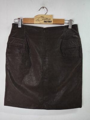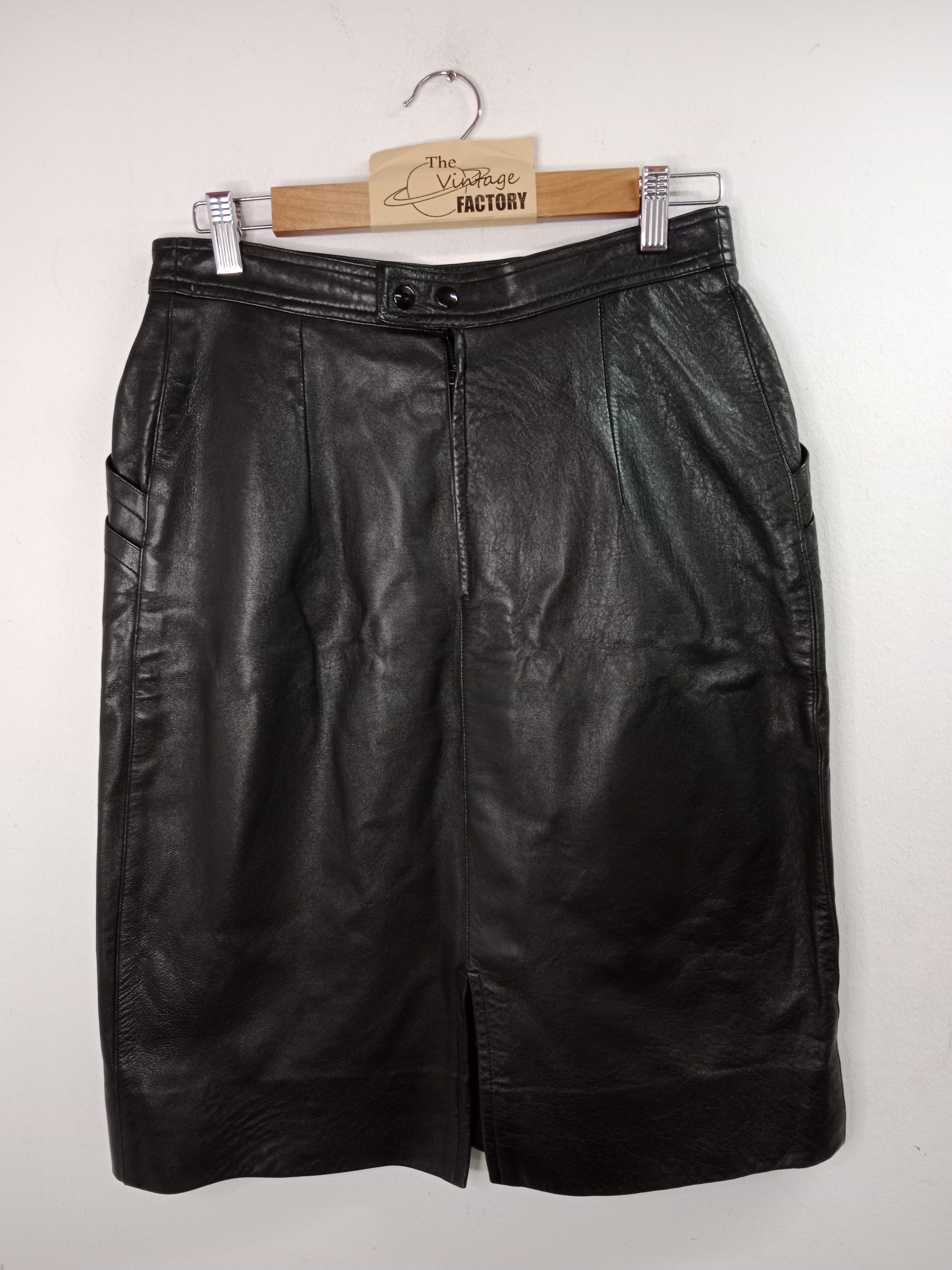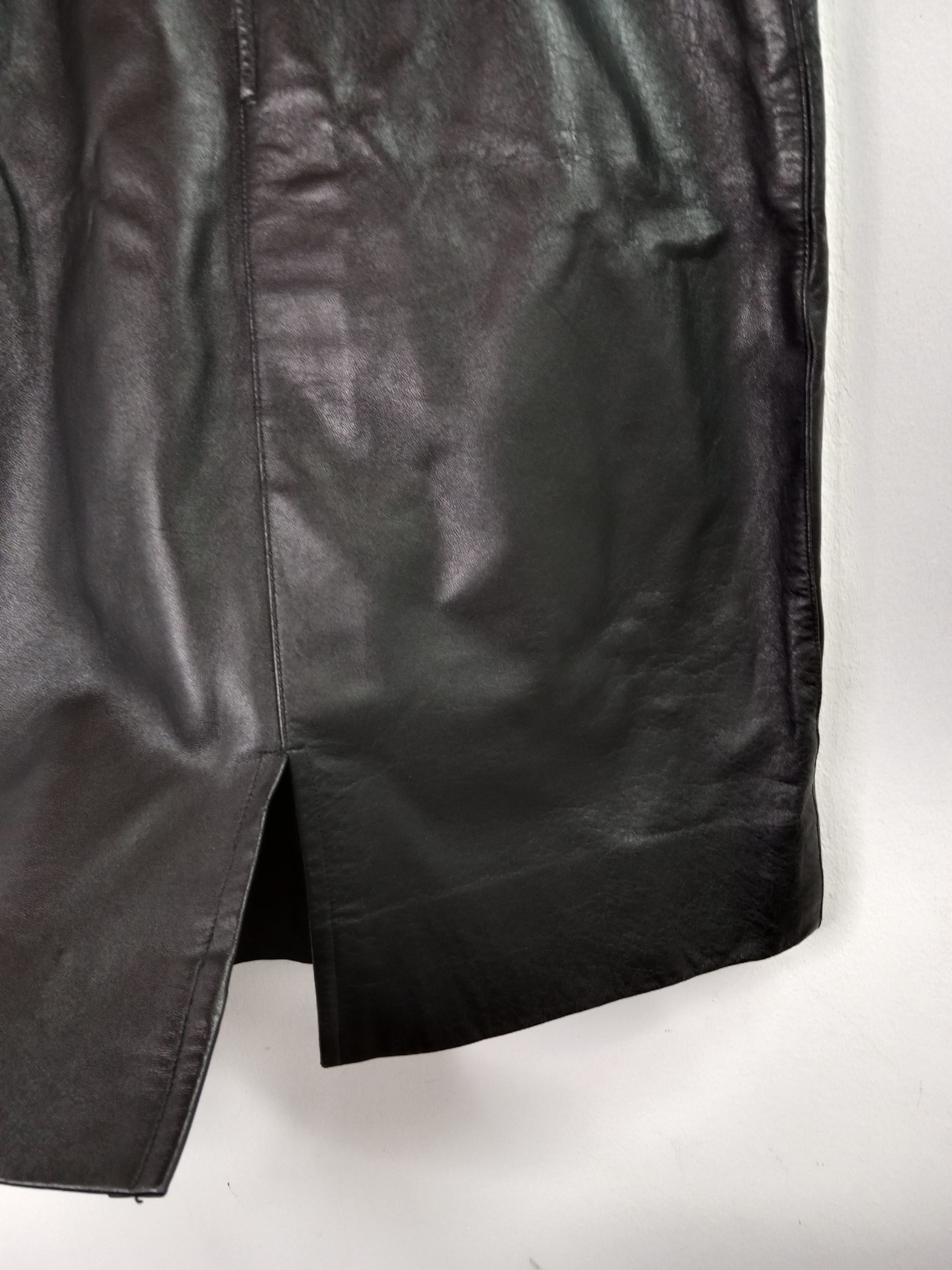 Falda de piel negra por la rodilla con bolsillos a los laterales y abertura trasera. Tiene forro interior, preloved and preworn.