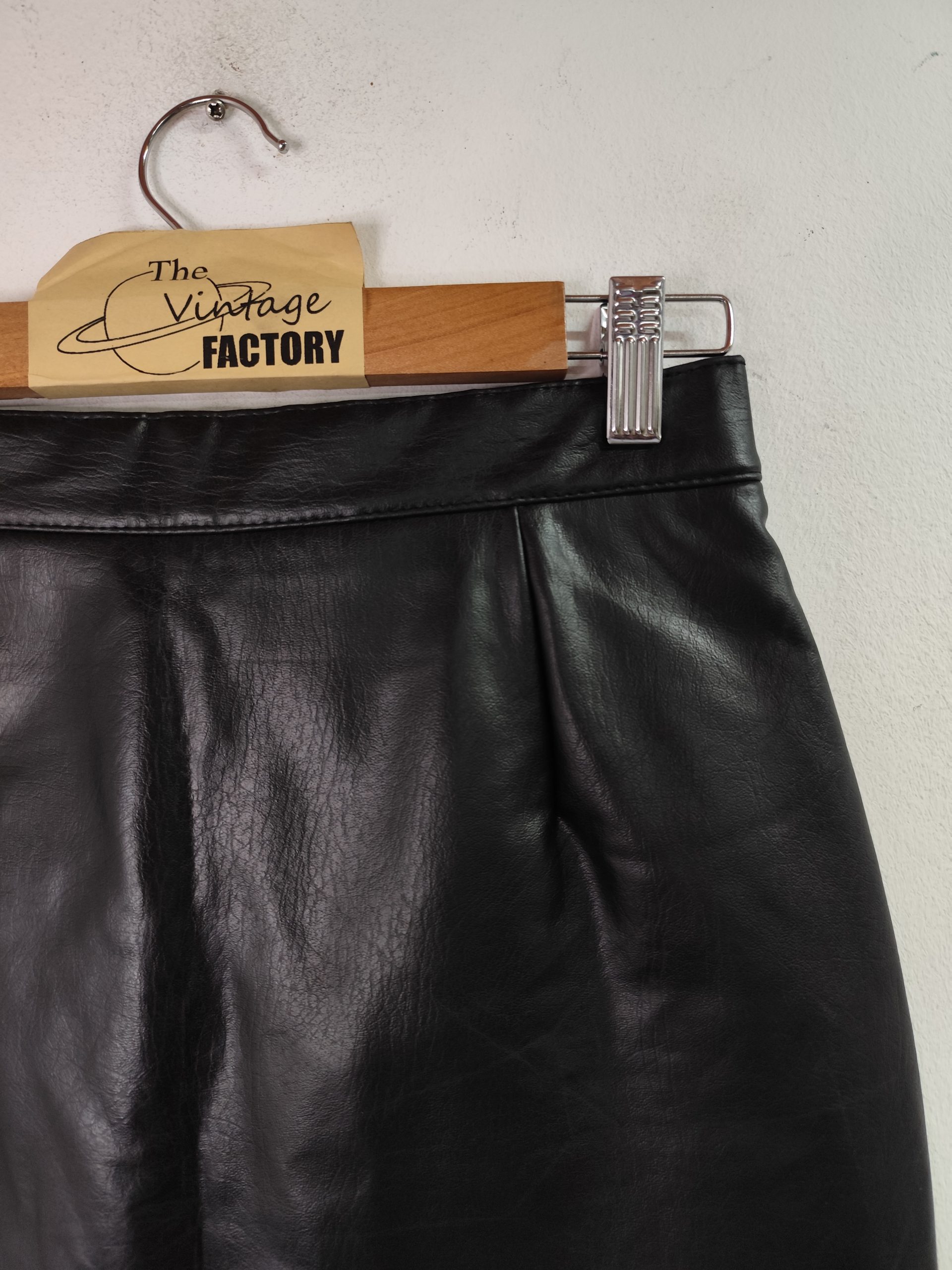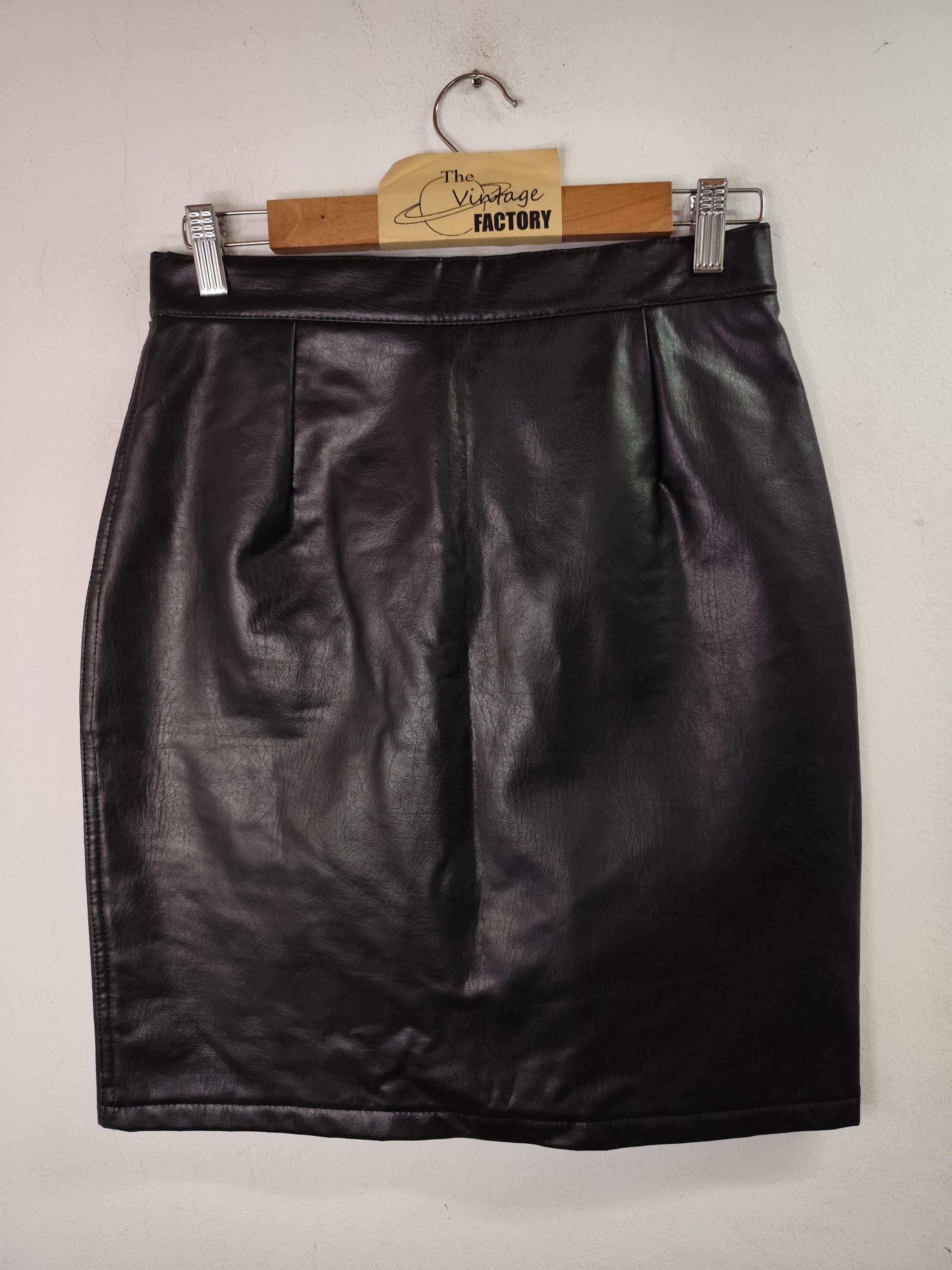 Falda negra de piel sintética corta en negro por la rodilla. Tiene forro interior.