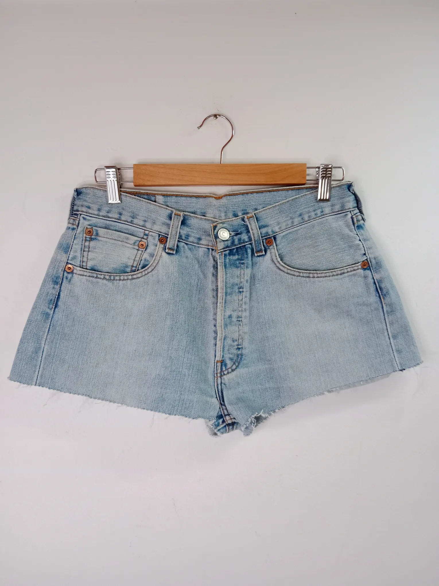 Pantalón vintage Levi’s 501, short vaquero en color azul claro deshilachado.