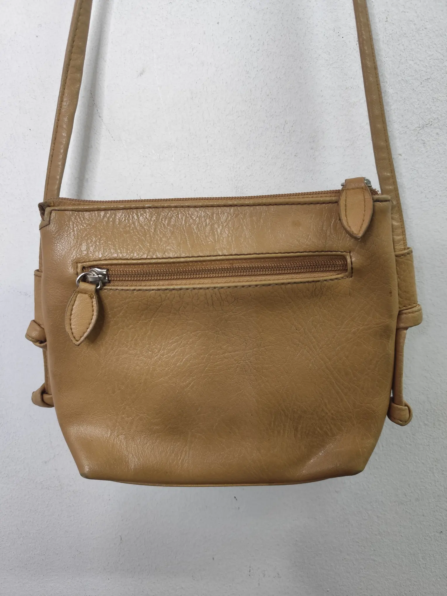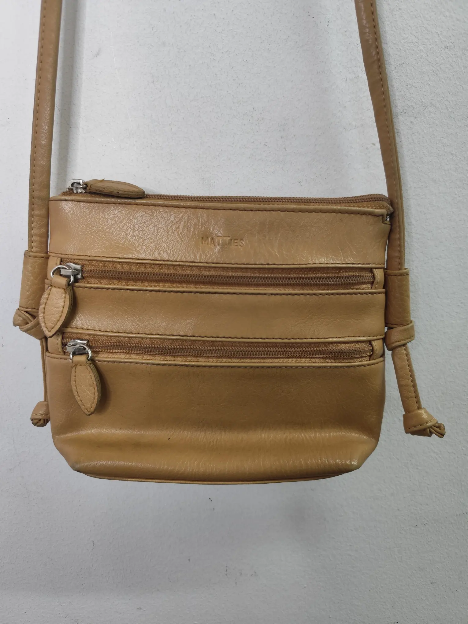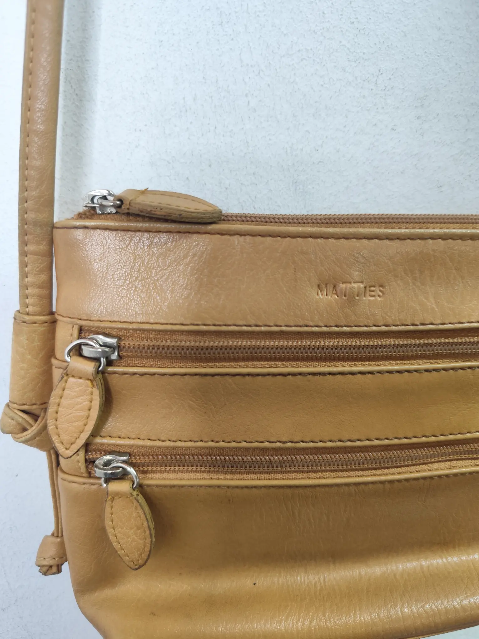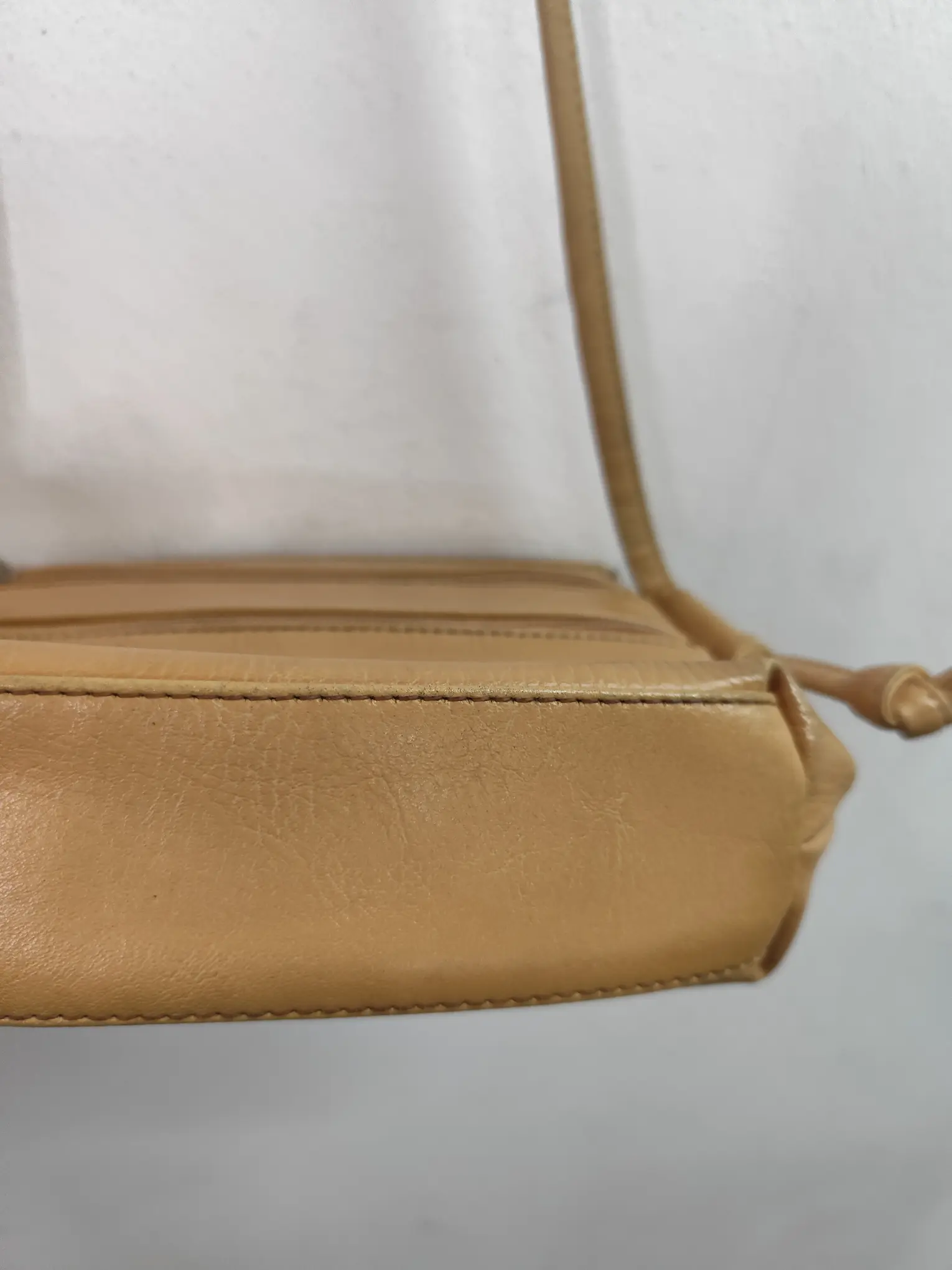 Bolso Matties vintage 90s de piel, cuero en color beige tipo bandolera con varios departamentos con cremalleras. Tiene una tira larga para poder llevarlo cruzado en el torso. Perfecto para los días más otoñales o invernales. Queda ideal con ropa vaquera o con ropa más formal, como unos pantalones de pinzas o una falda. Si quieres darle un toque más atrevido, combínalo con un total look de cuero con chupa de cuero y unos pantalones o falda de piel.