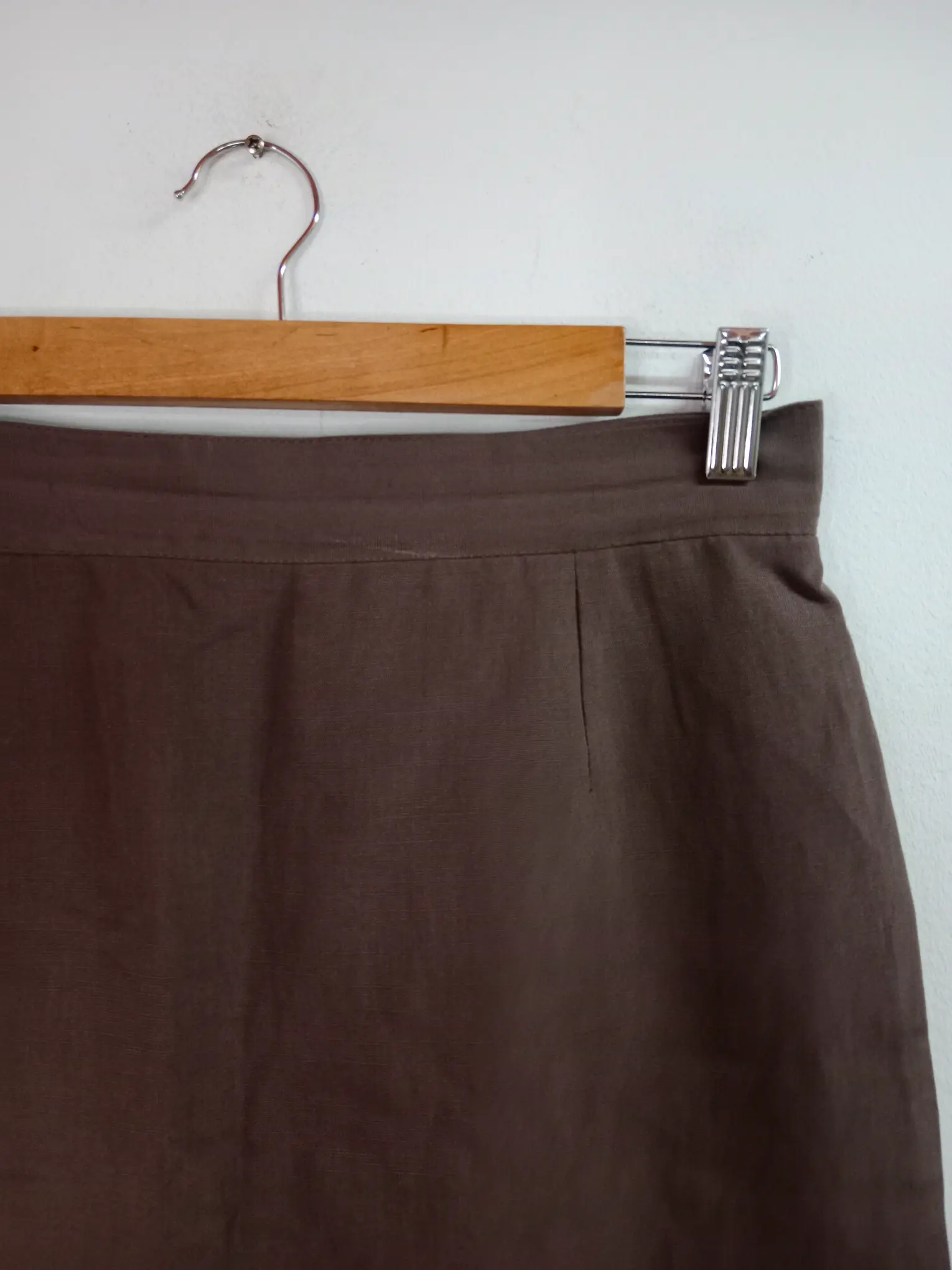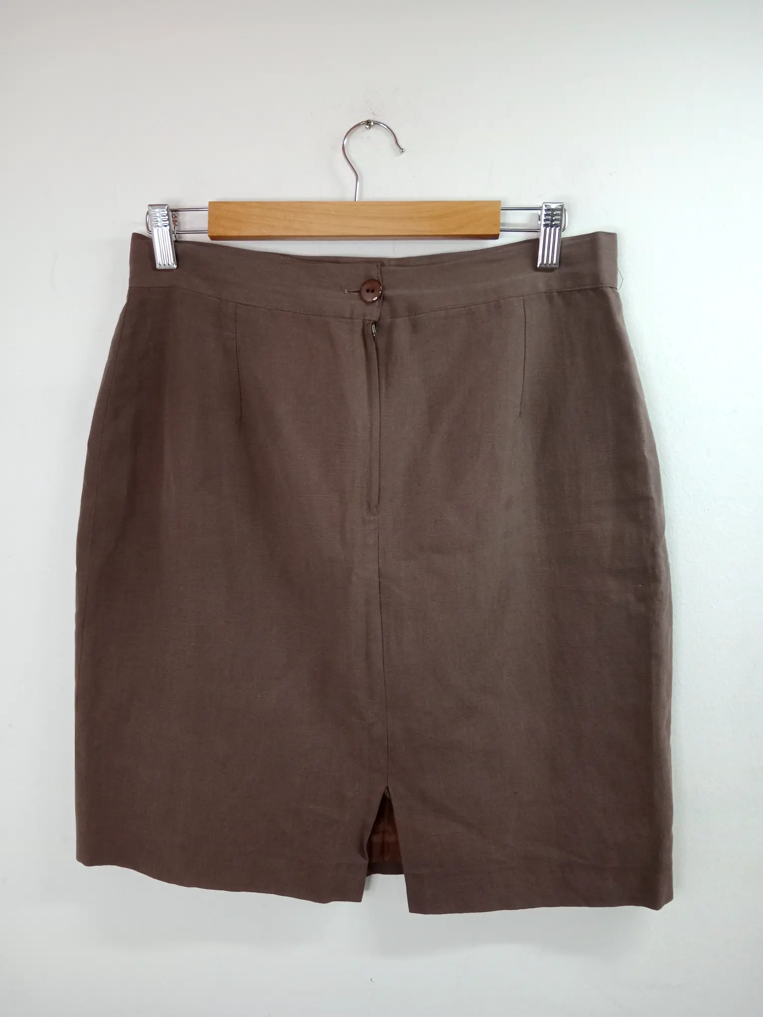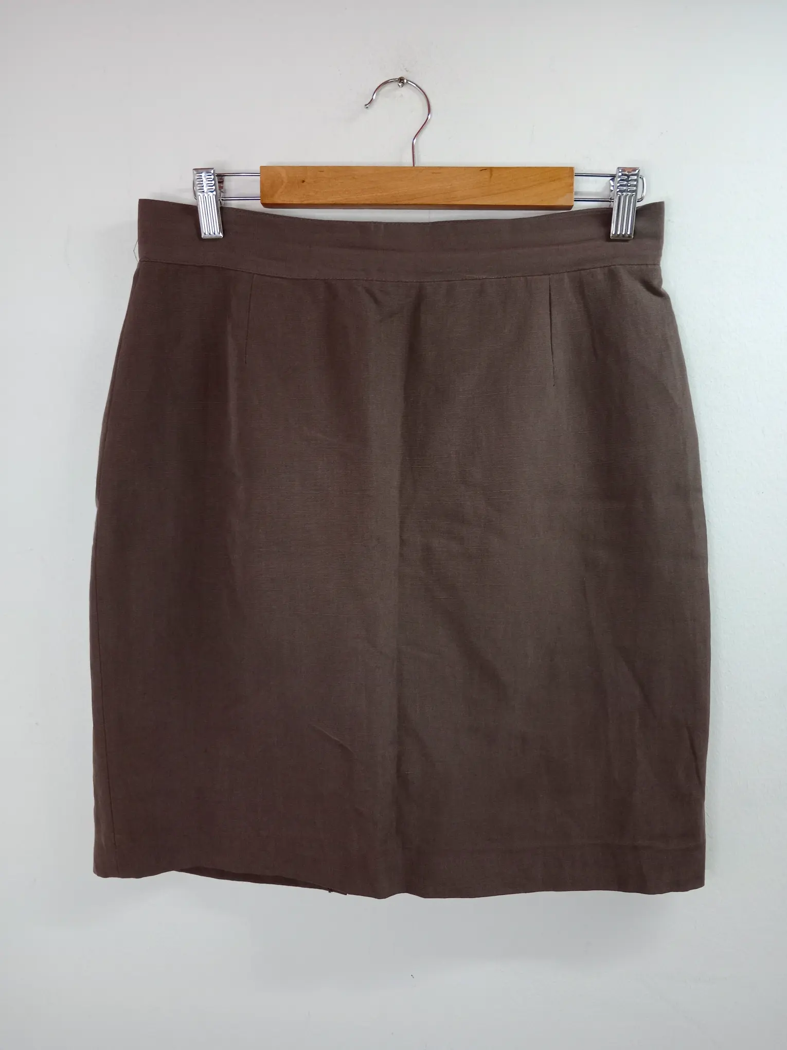 Falda de lino vintage corta en color marrón, por la rodilla. Ideal para primavera y verano en los días más fresquitos o para invierno. Queda genial para combinarlo con alguna blusa o camisa chula o con algún polo para darle un rollo más atrevido a tu look. Puedes combinarla también con un jersey de punto en invierno o con una sudadera para ir a la última y marcar tendencia con un rollo diferente.