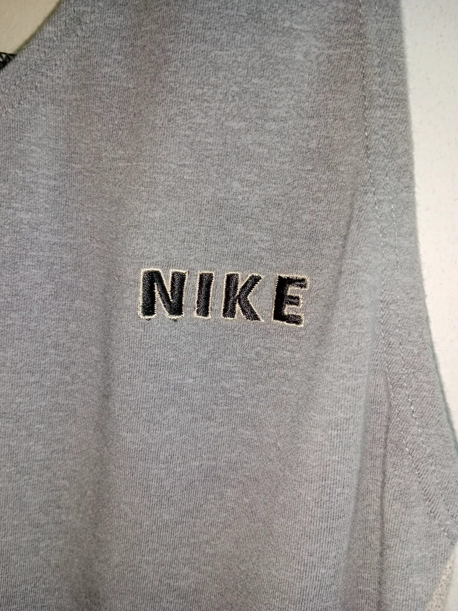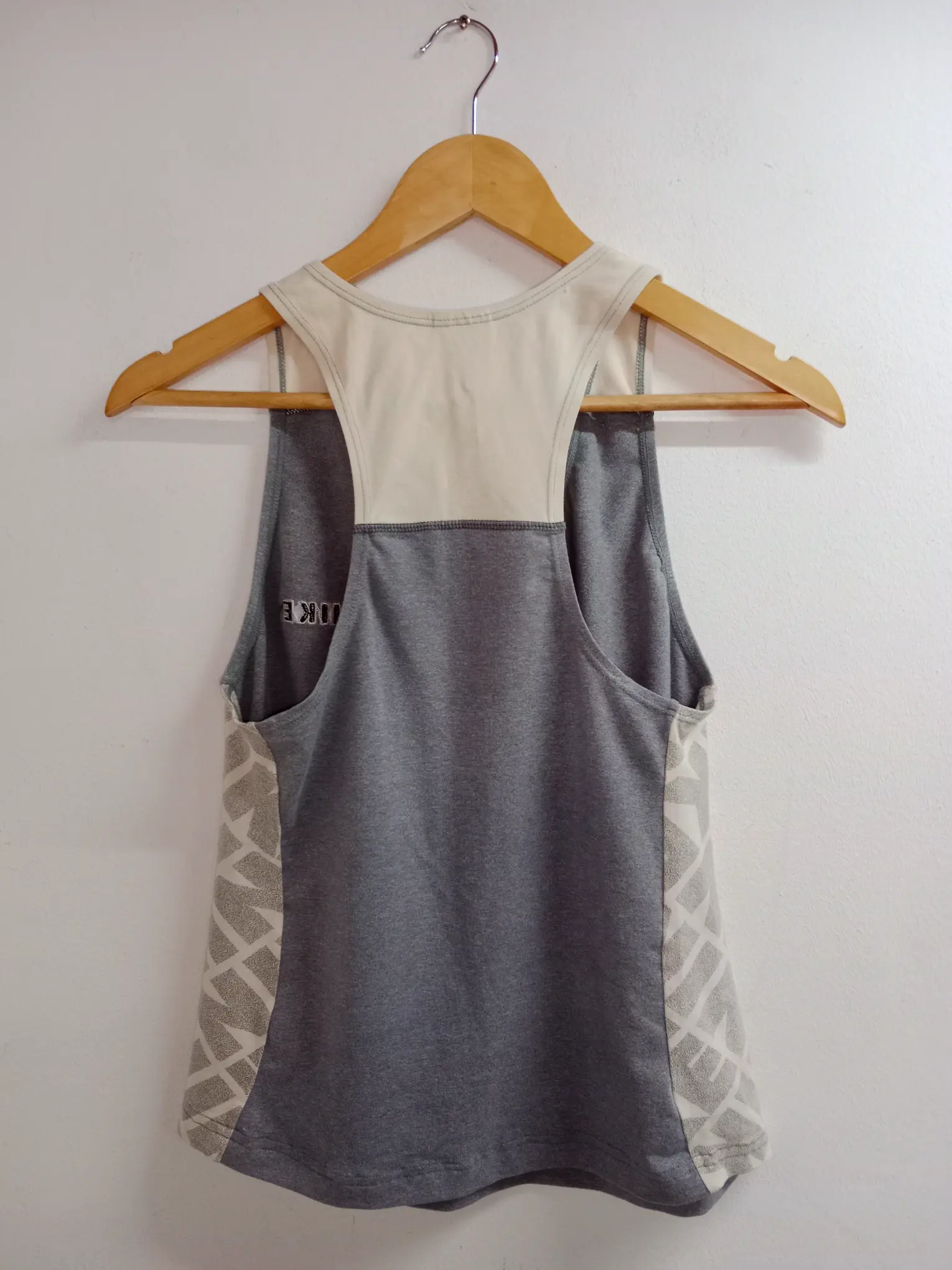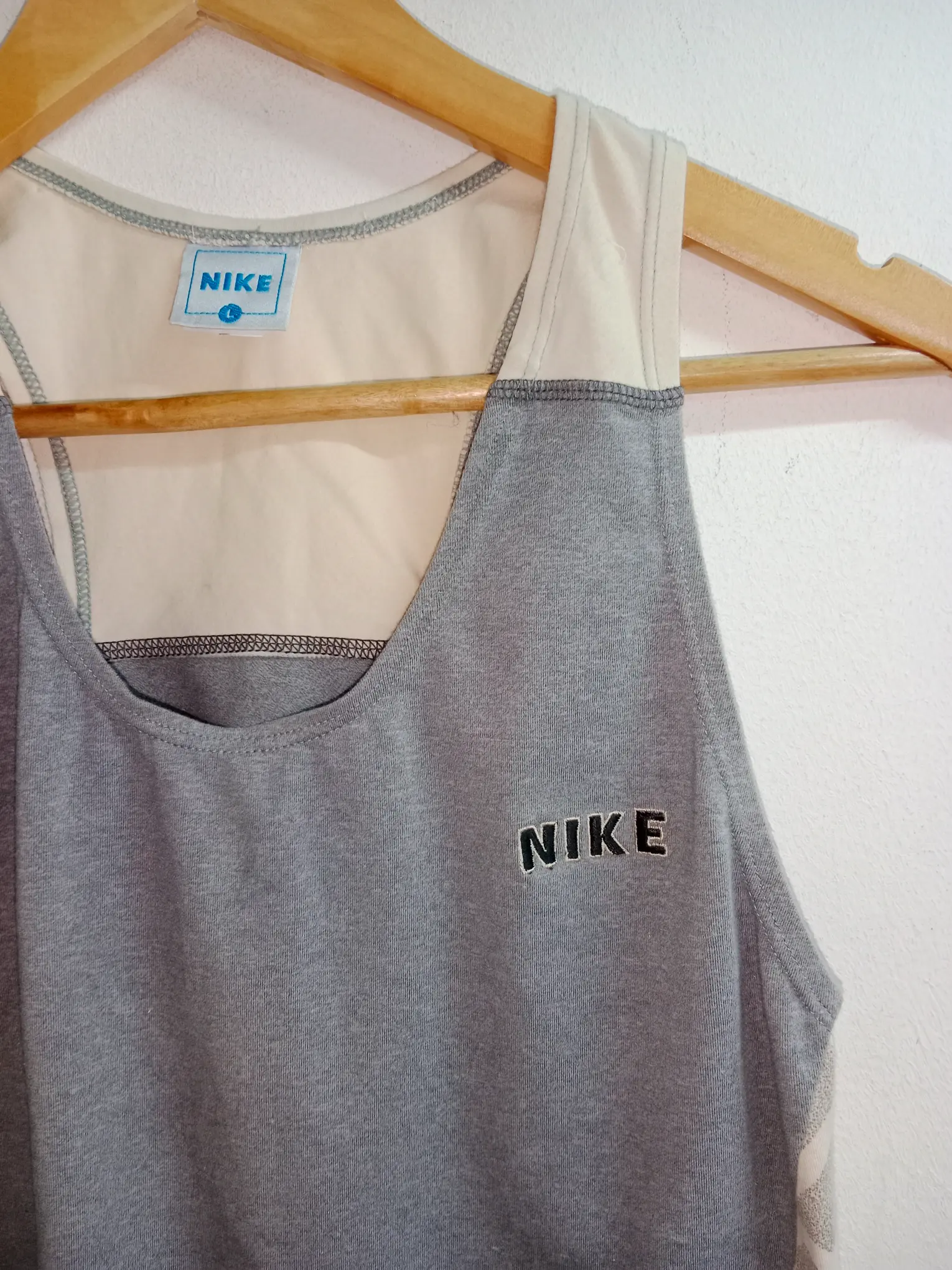 Camiseta deportiva vintage Nike en gris y blanco crema de tirantes. Ideal para primavera y verano o para invierno para ir a entrenar. Queda genial tanto con pantalones deportivos como incluso con una falda si quieres darle un rollo más atrevido a tu look.