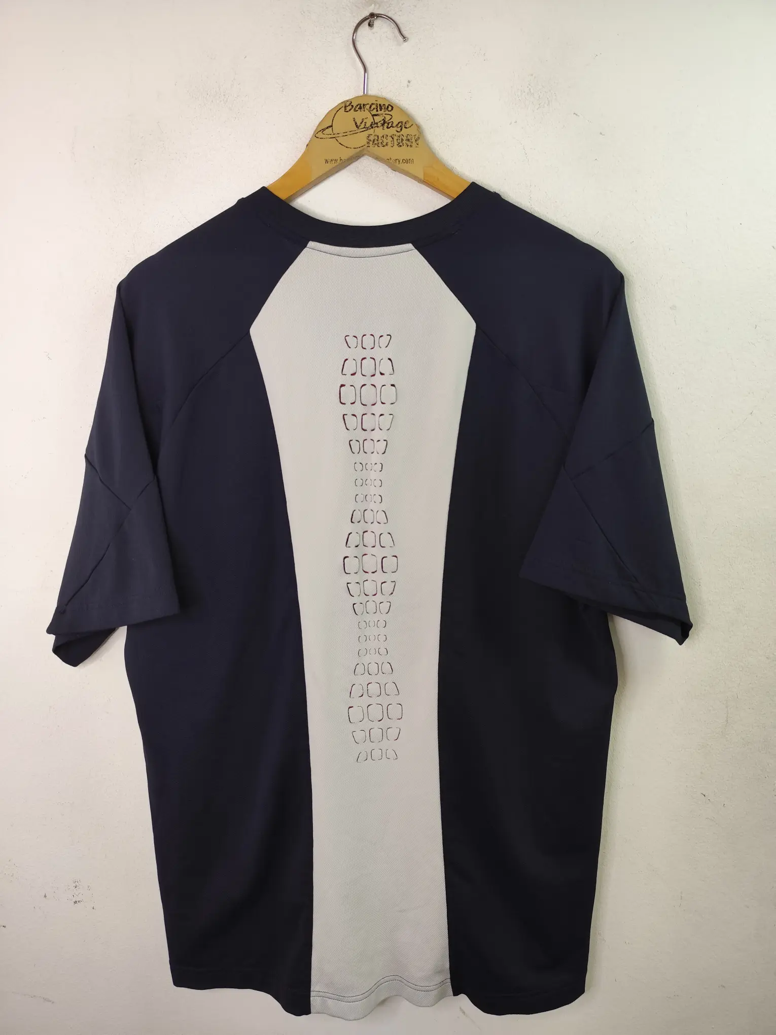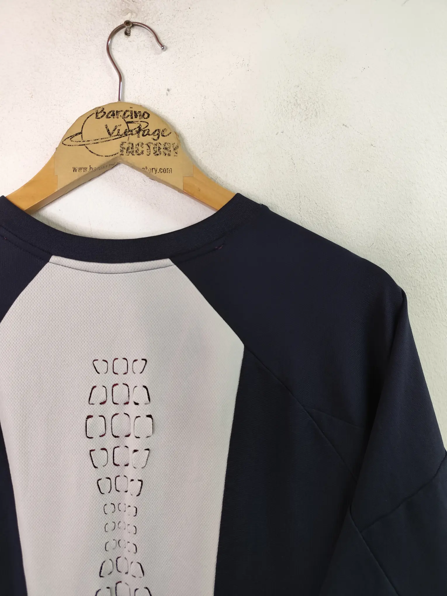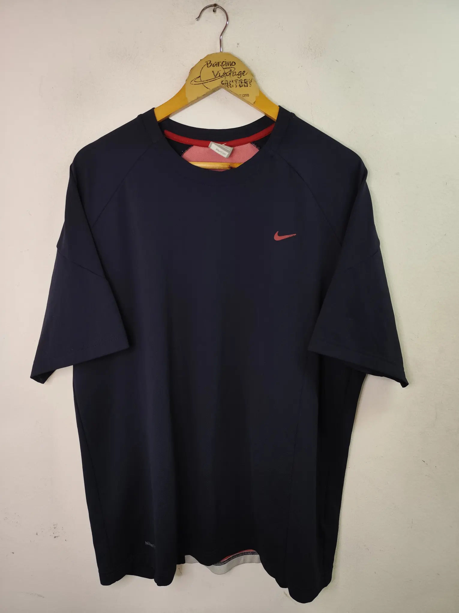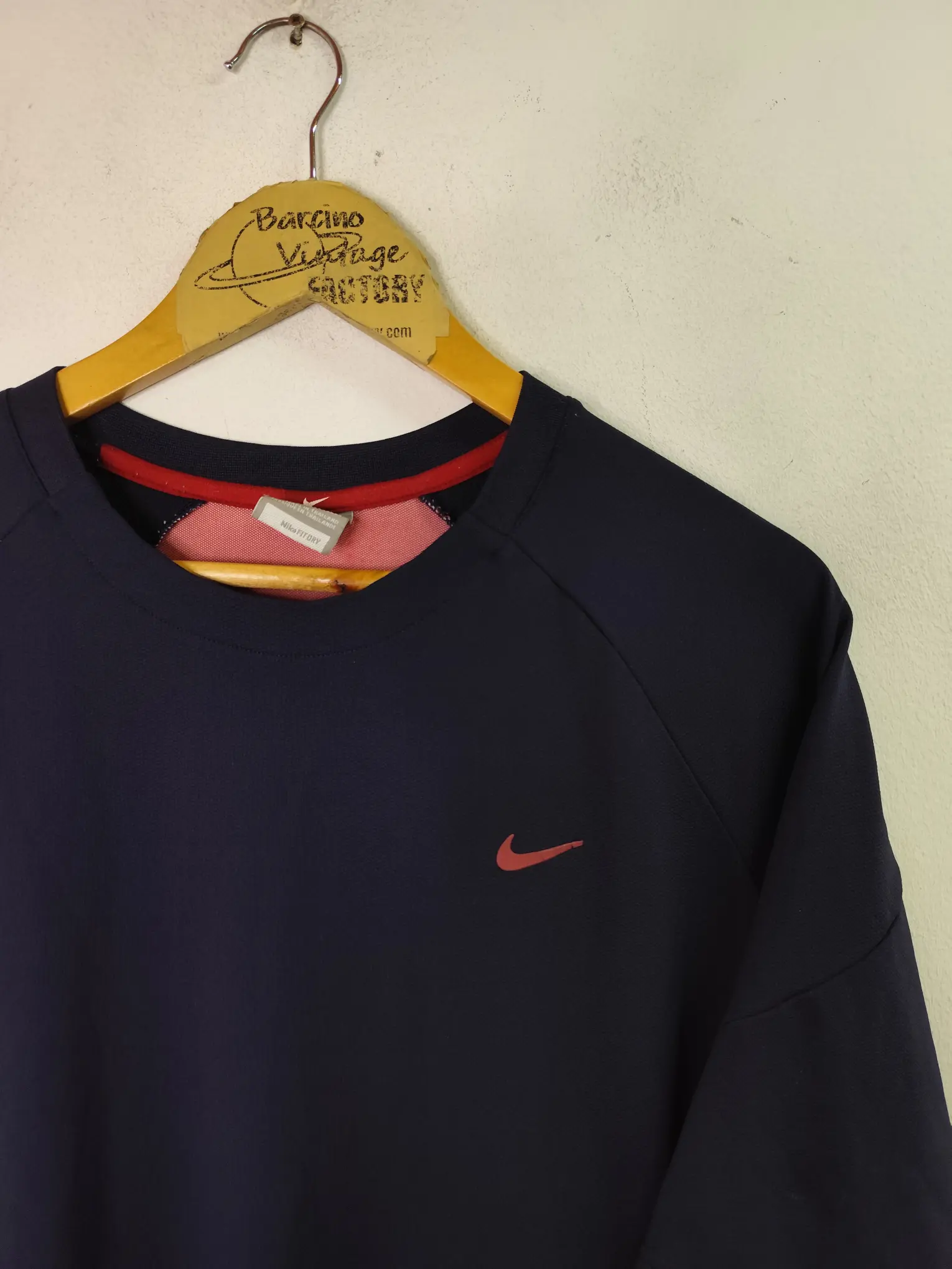 Camiseta Nike vintage Y2K 00s deportiva técnica de manga corta en color azul marino con detalles en blanco. Ideal para primavera y verano o para invierno para llevarla con alguna camisa, cazadora vaquera o track jacket abierta. Queda genial tanto con pantalones vaqueros como con pantalones deportivos o incluso con una falda si quieres darle un aire diferente a tu look.