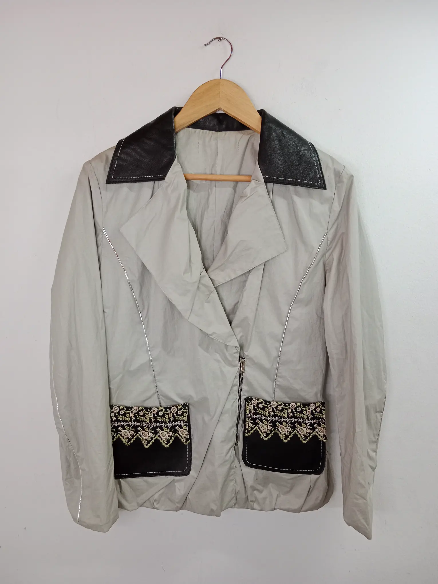 Chaqueta tipo americana, blazer vintage en color beige con cuello de piel en color negro y detalles bordados en los bolsillos. Ideal para primavera y verano en los días más fresquitos o para invierno para usarla debajo del abrigo. Queda genial tanto con pantalones vaqueros como con pantalones de pinzas o incluso con una falda para darle un rollo moderno y diferente a tu look.