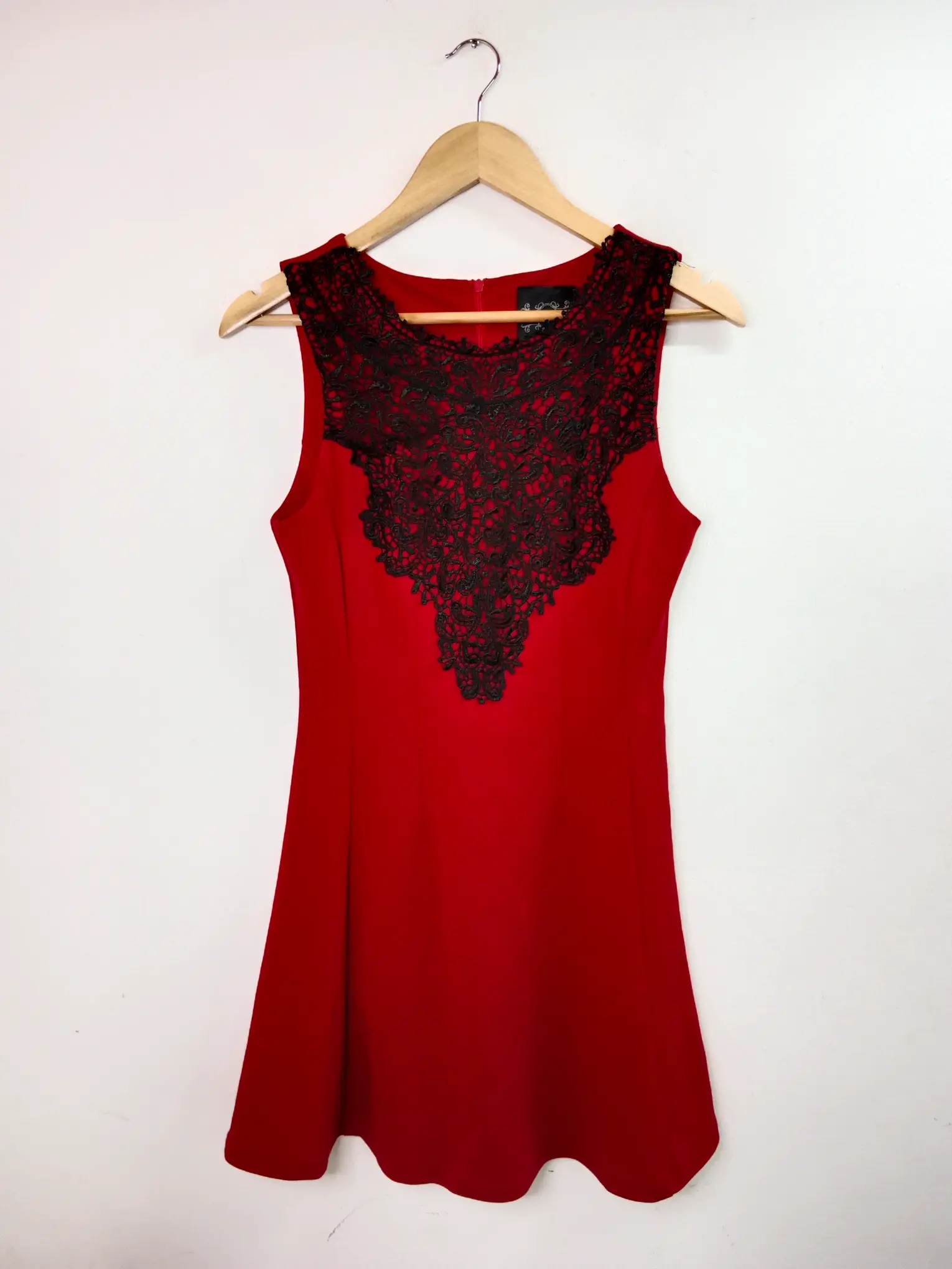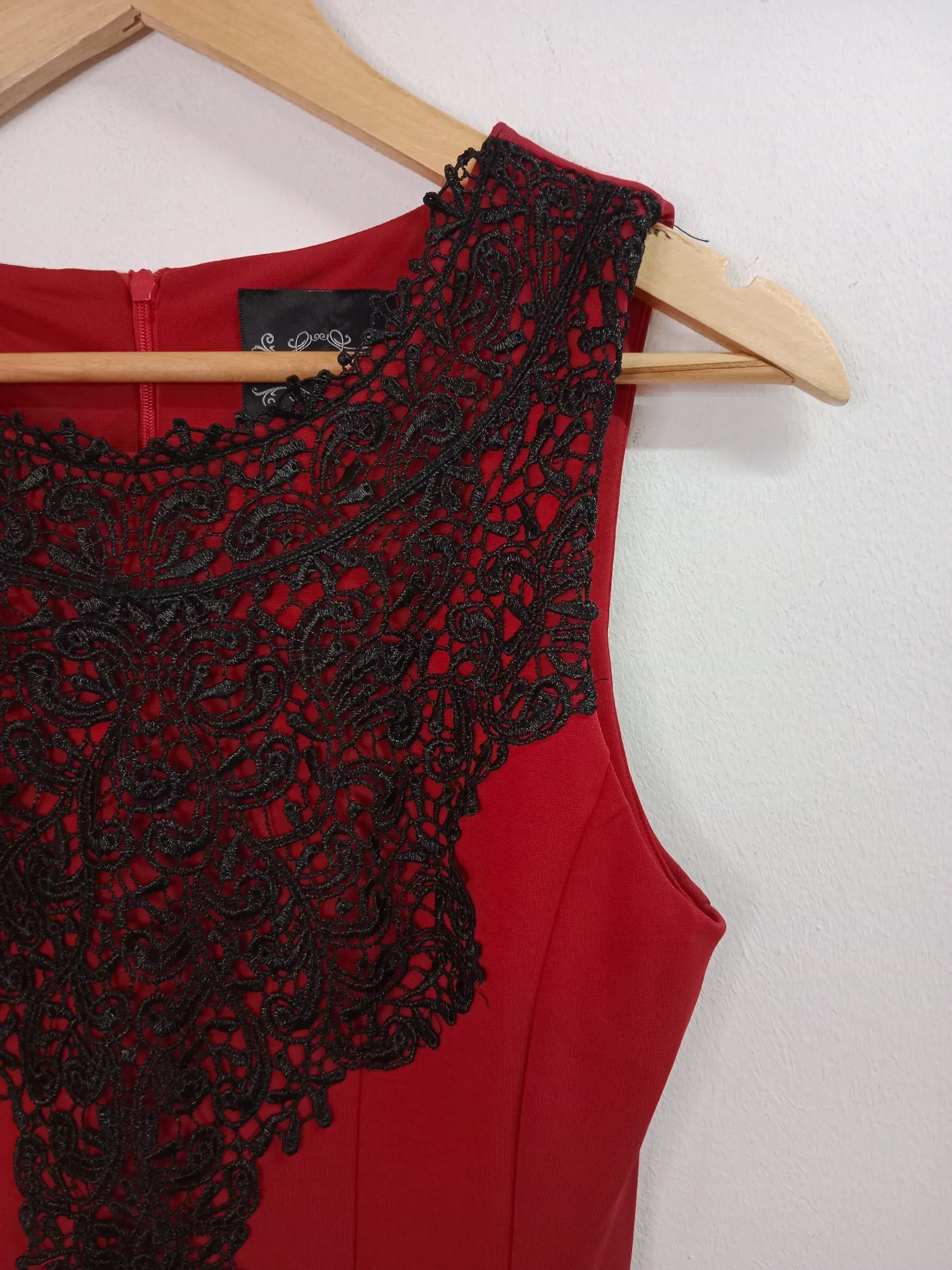 Vestido de invitada, celebración o cóctel de tirantes retro en color rojo con detalle de encaje en negro en el pecho, corto a la altura de la rodilla y vuelo en la falda. Ideal para primavera y verano en los días más fresquitos o para invierno para llevarla con alguna americana o chaqueta tipo cazadora.