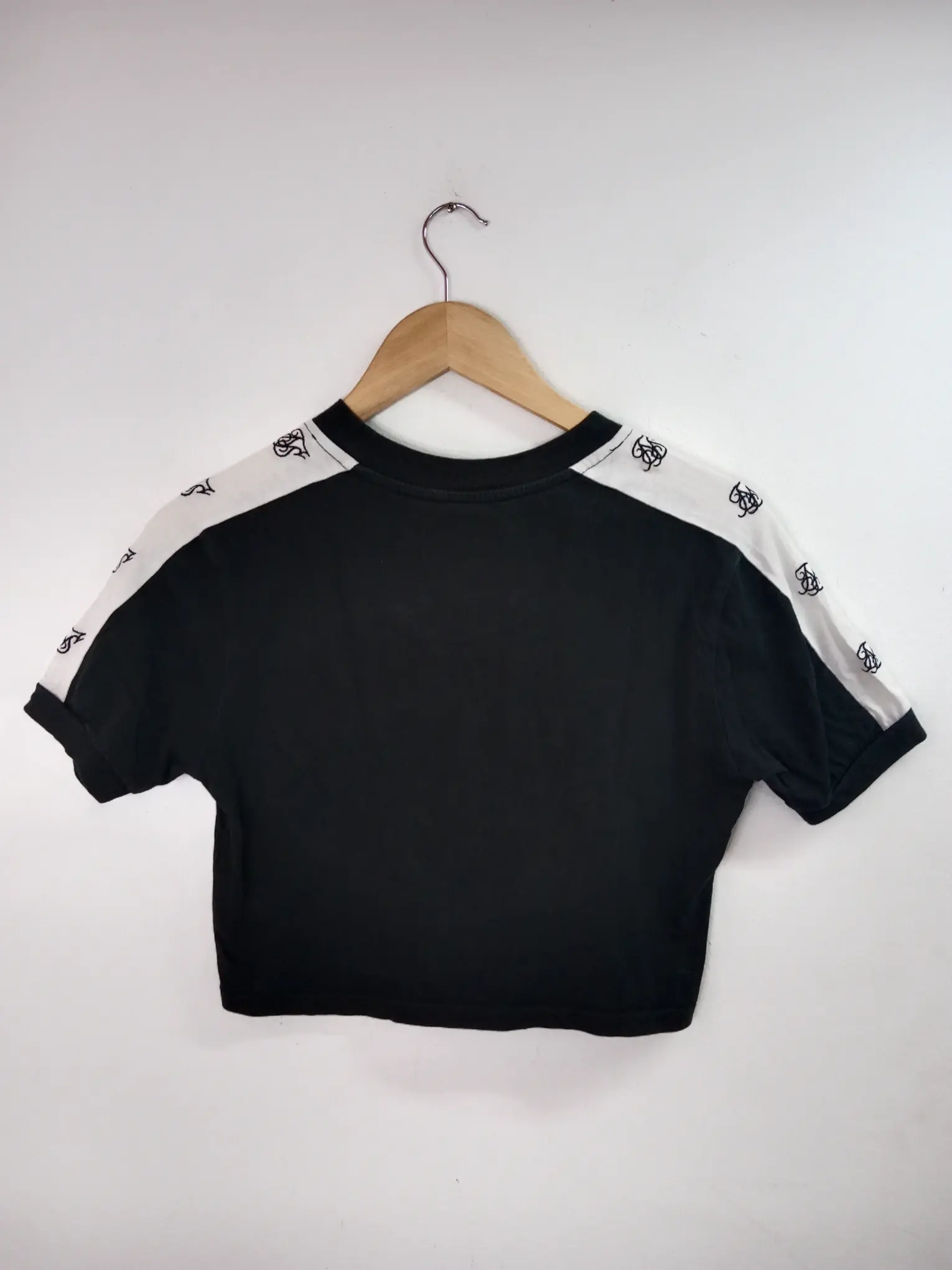 Camiseta corta de manga corta en color negro con detalles en blanco tipo crop top. Ideal para primavera y verano o para invierno para llevarlos con alguna cazadora vaquera o camisa por encima abierta. Queda genial tanto con pantalones vaqueros como con pantalones deportivos o incluso con una falda si quieres darle un aire diferente a tu look.
