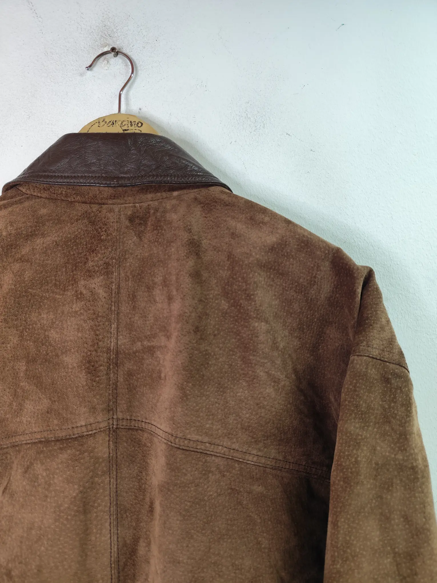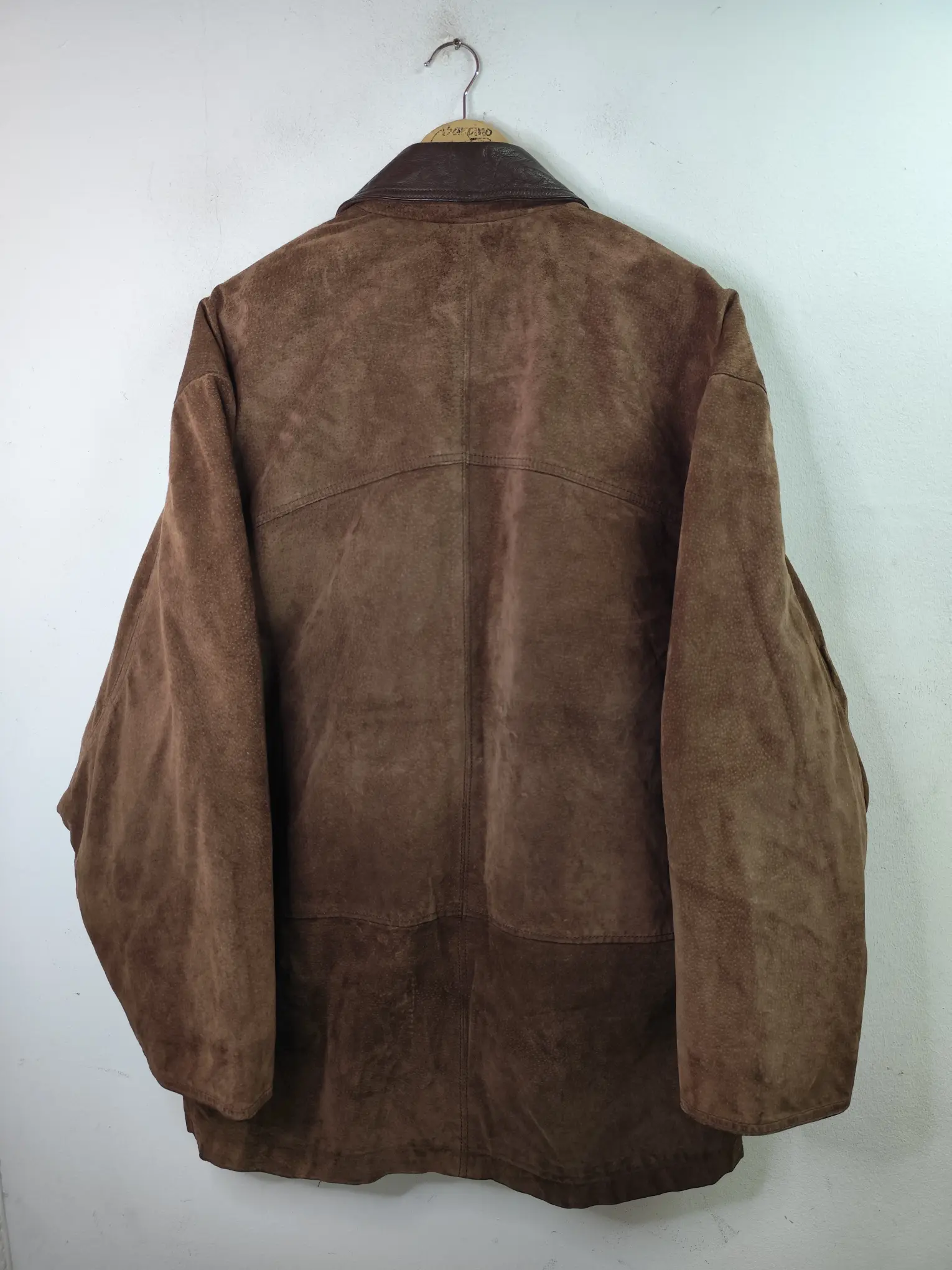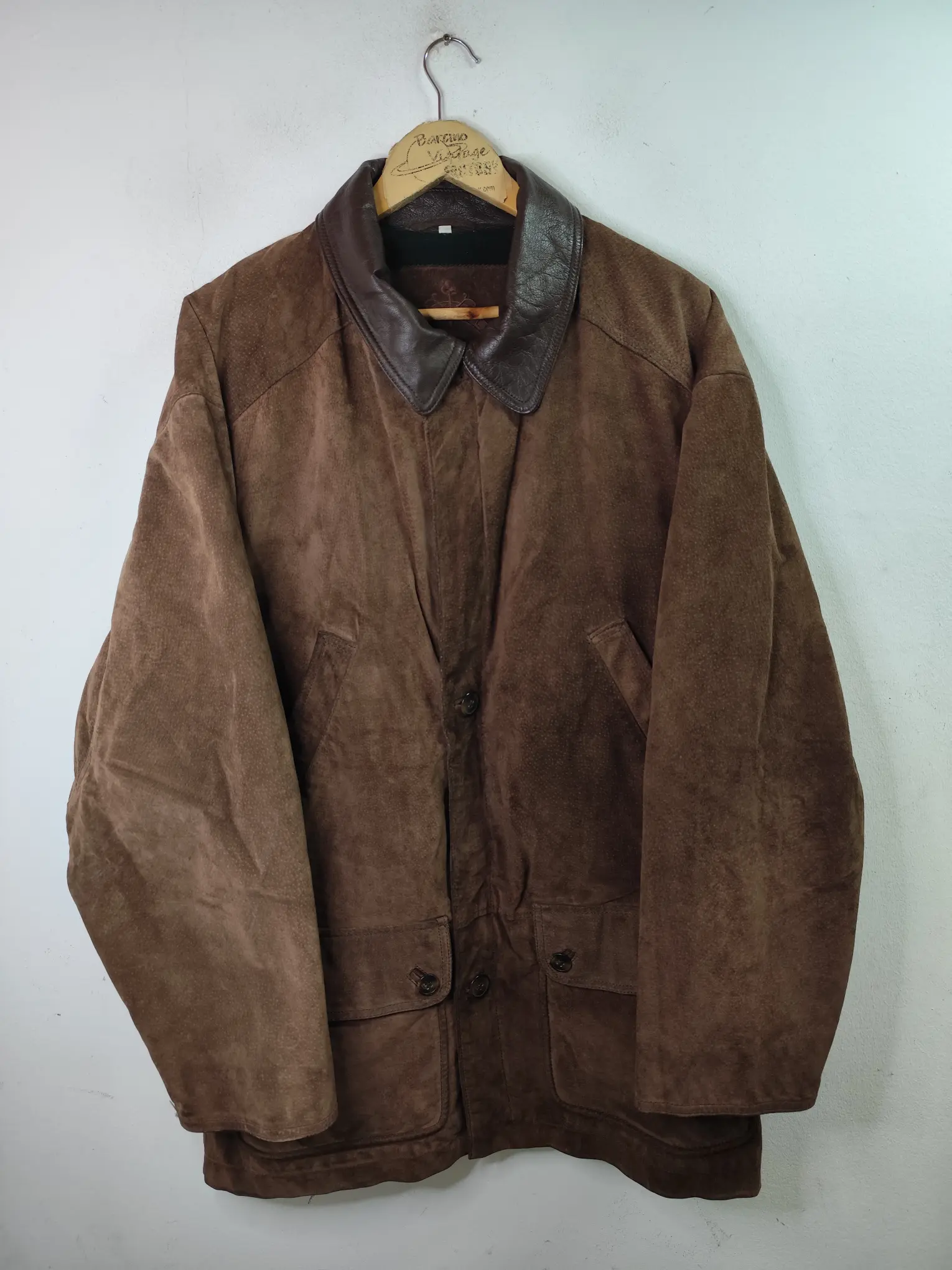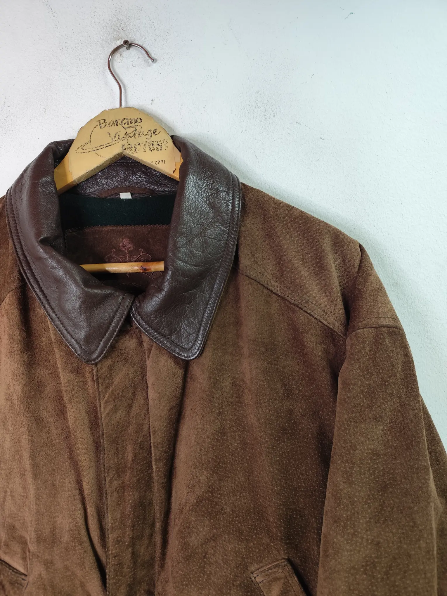 Chaqueta de ante y piel, cuero vintage 80s tipo biker en color marrón oscuro. Ideal para los días más fríos de invierno para usarla con una sudadera o más capas debajo del abrigo, como un jersey o cárdigan de punto. Queda genial tanto con pantalones vaqueros como con pantalones tipo chinos o de pinzas o incluso con una falda.