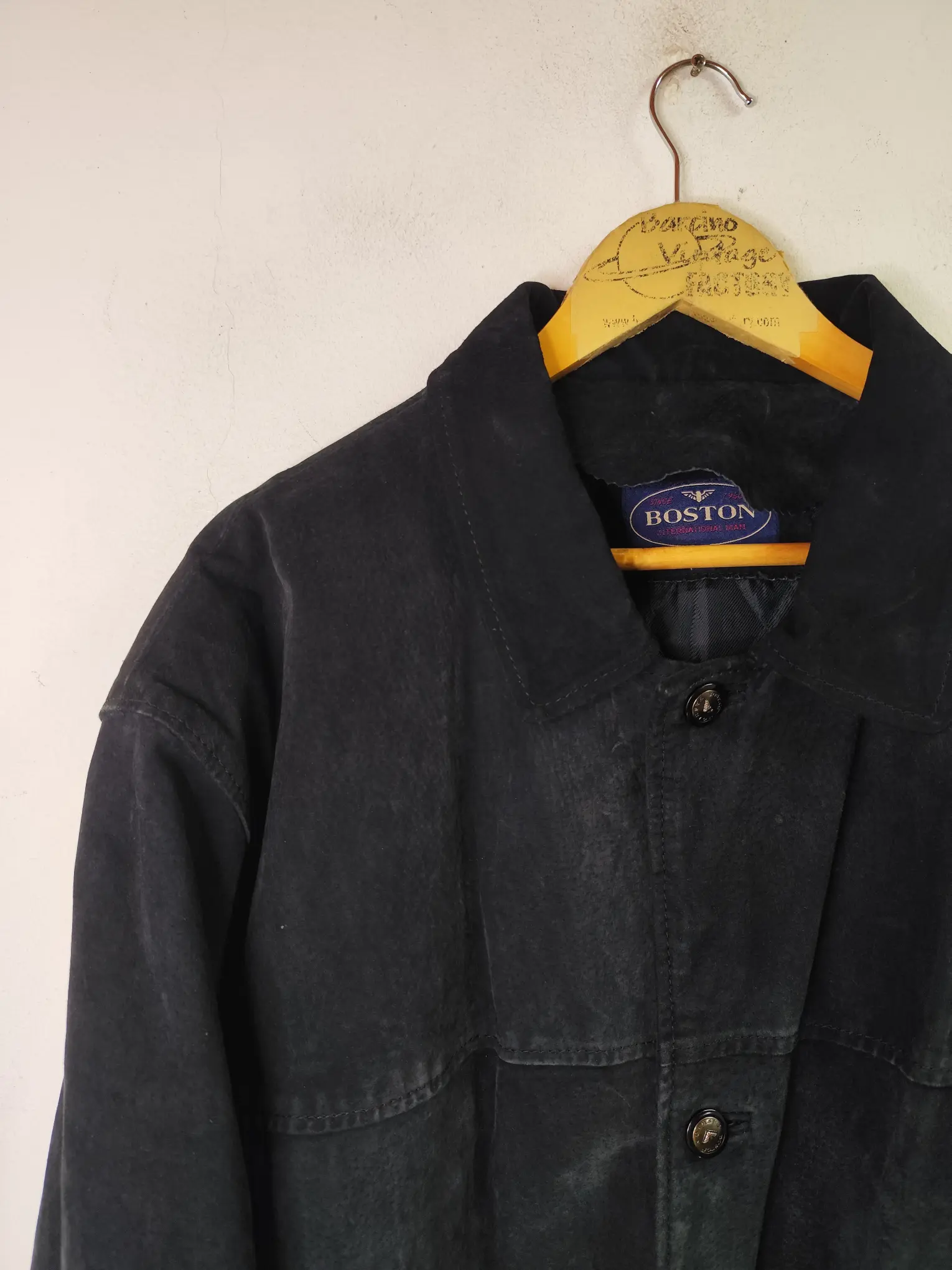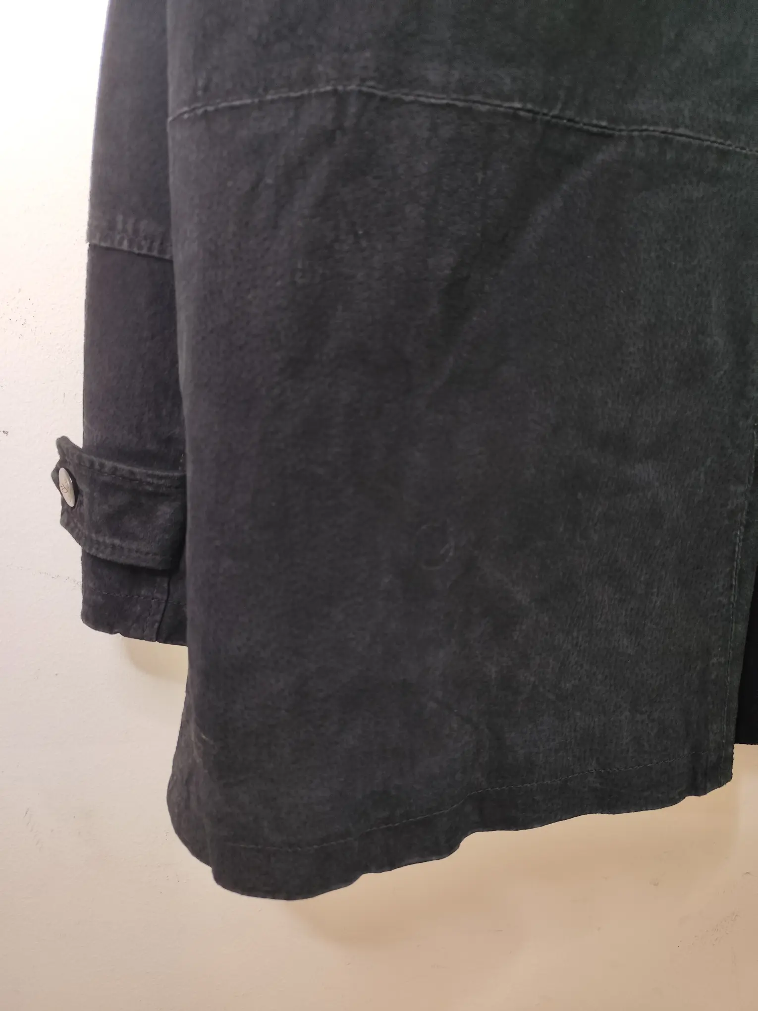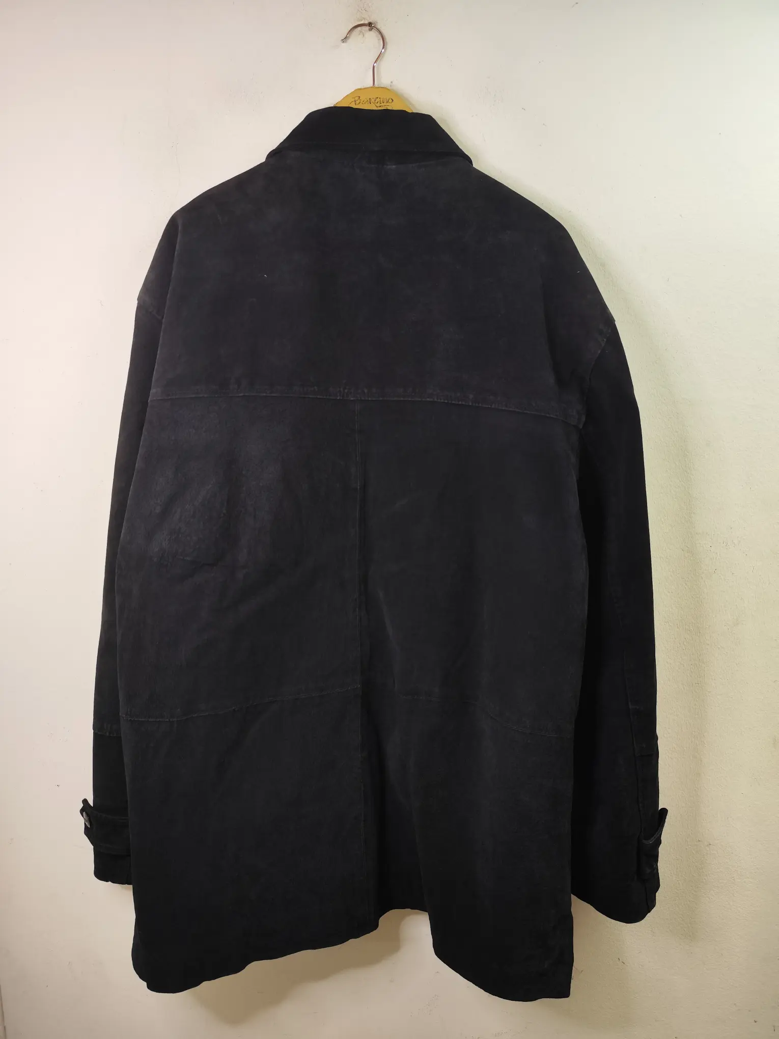 Chaqueta de ante vintage 90s tipo chaquetón marinero en color negro, con botones. Ideal para los días más fríos de invierno para usarla con una sudadera o jersey o más capas debajo del abrigo. Queda genial tanto con pantalones vaqueros como con pantalones tipo chinos o de pinzas o incluso con una falda.