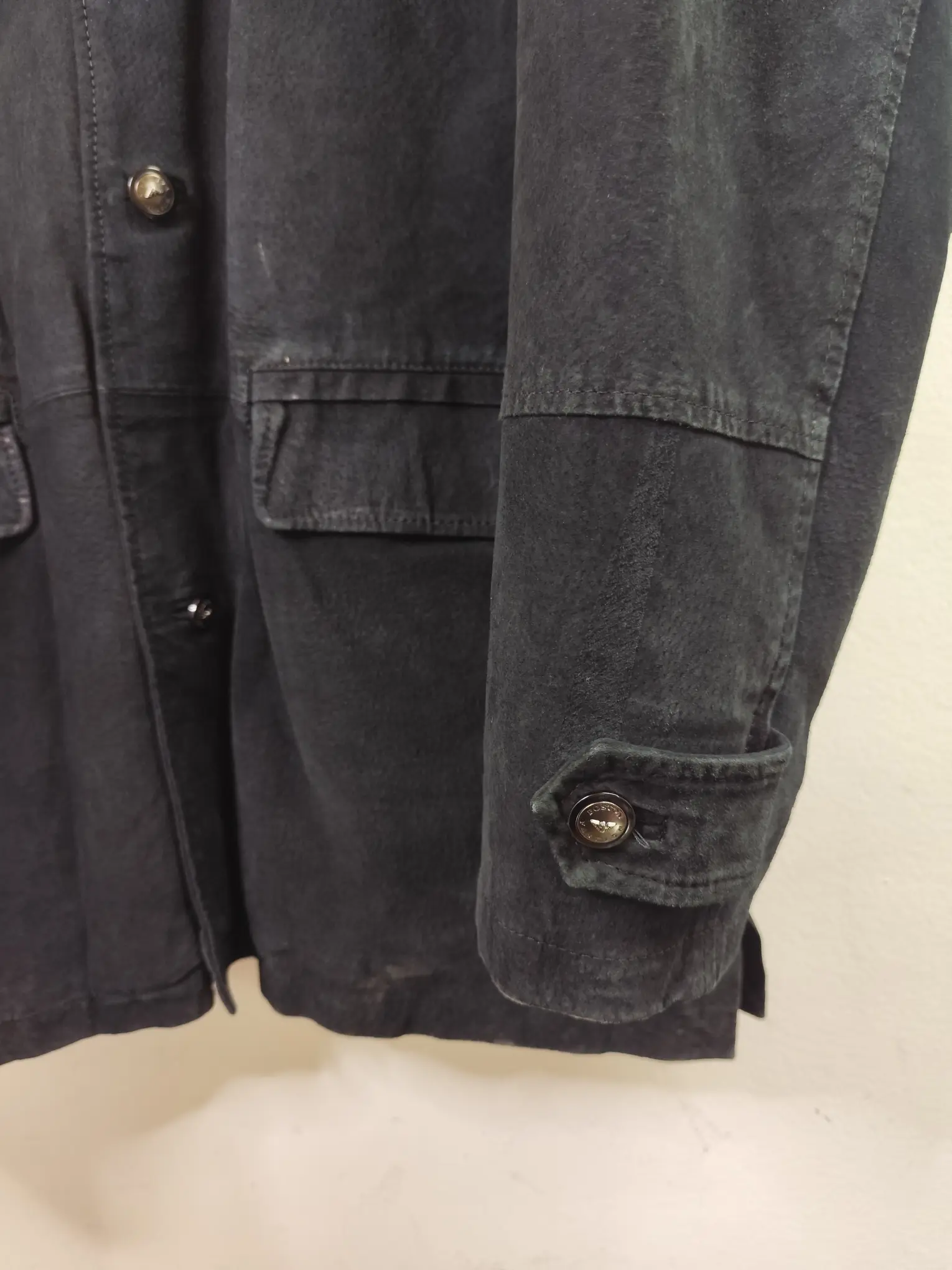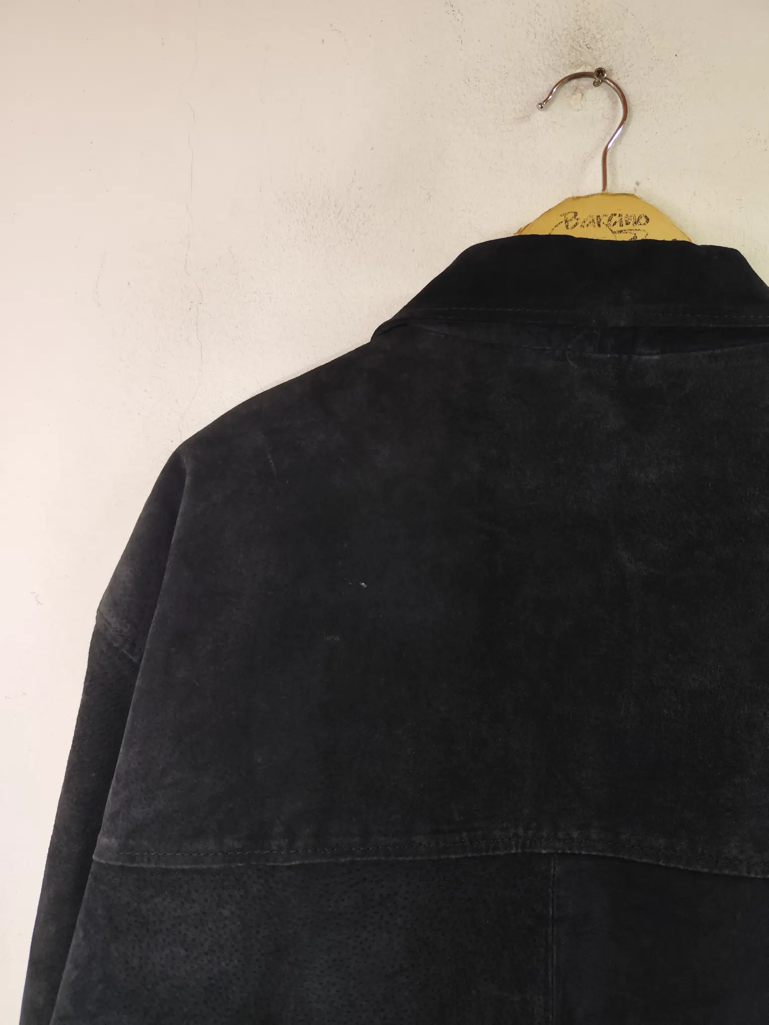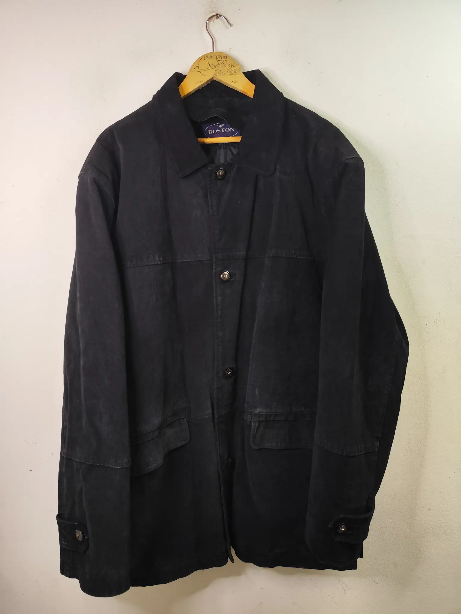 Chaqueta de ante vintage 90s tipo chaquetón marinero en color negro, con botones. Ideal para los días más fríos de invierno para usarla con una sudadera o jersey o más capas debajo del abrigo. Queda genial tanto con pantalones vaqueros como con pantalones tipo chinos o de pinzas o incluso con una falda.