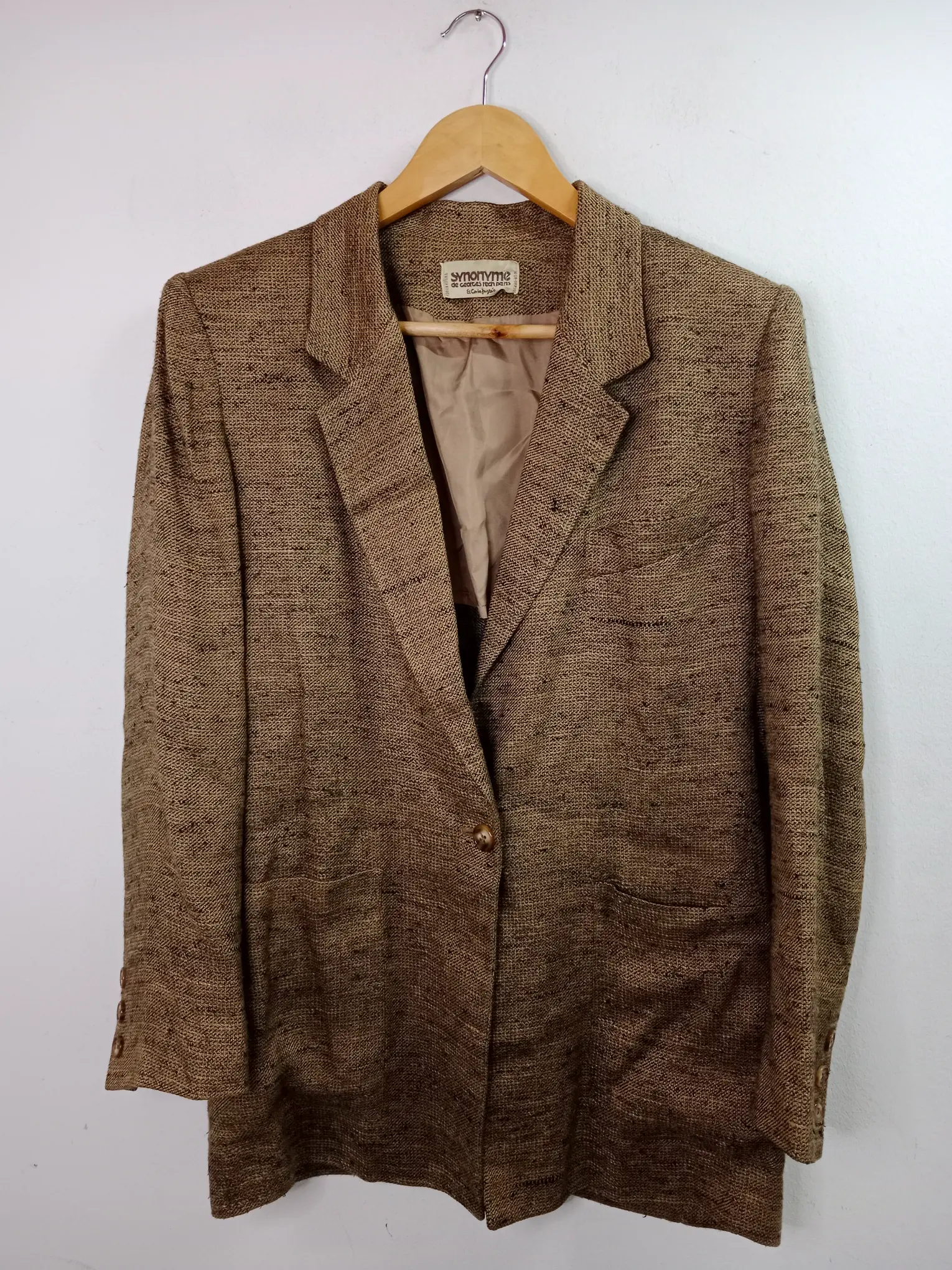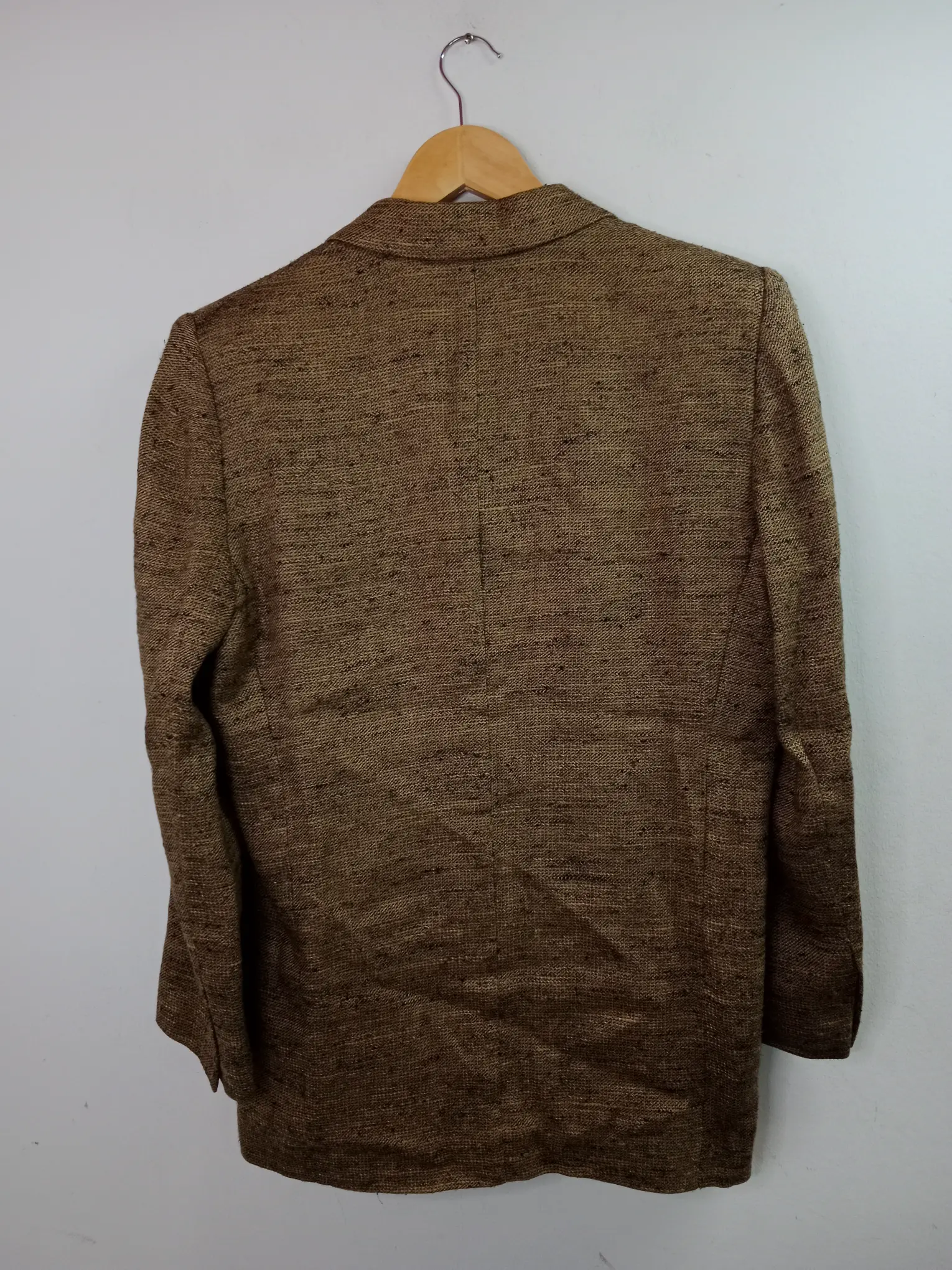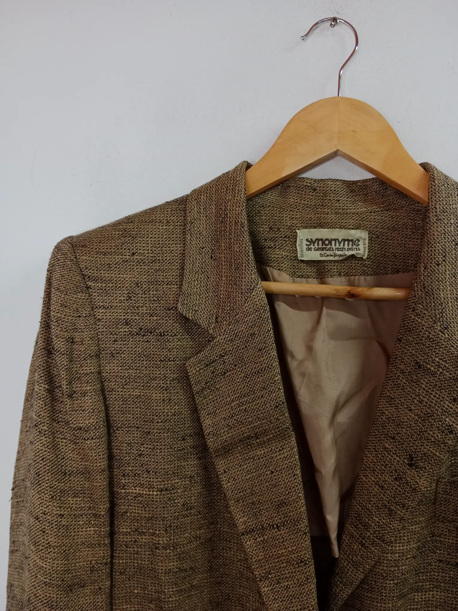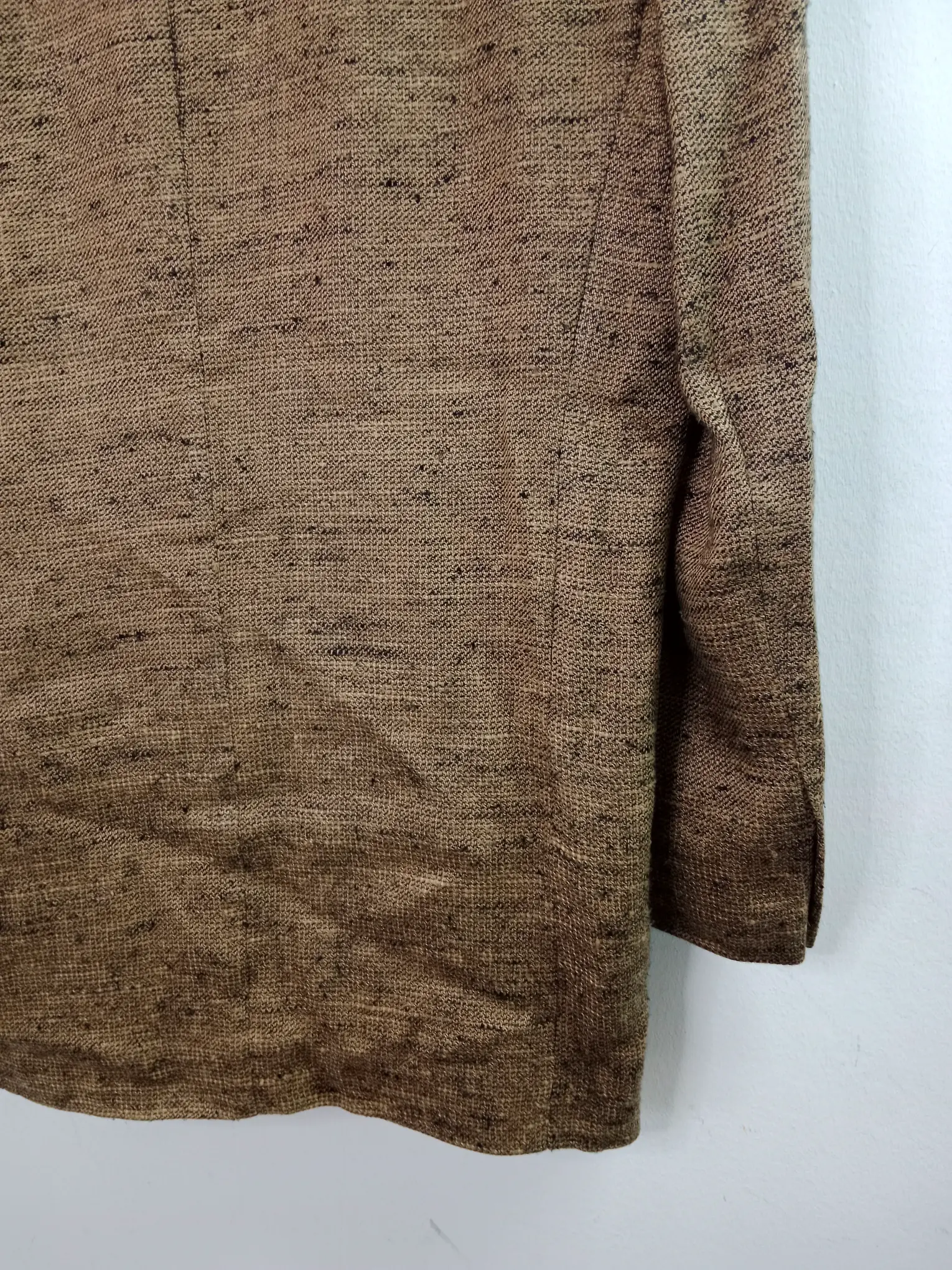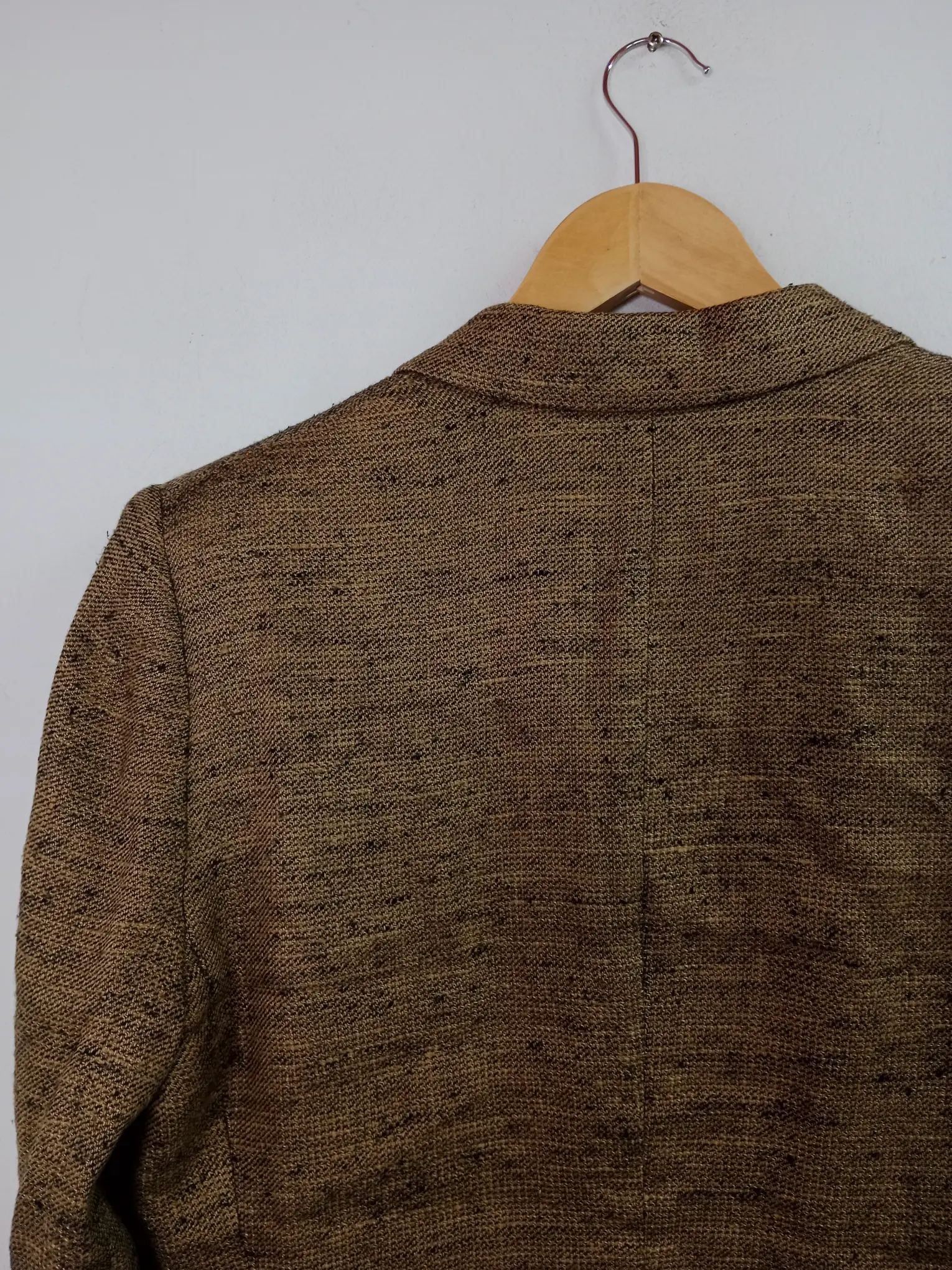 Chaqueta tipo americana blazer de lino vintage en marrón camel jaspeado y negro de entretiempo. Ideal para primavera y verano en los días más fresquitos o para invierno para usarla debajo del abrigo. Queda genial tanto con pantalones vaqueros como con pantalones de pinzas o incluso con una falda para darle un rollo moderno y diferente a tu look.