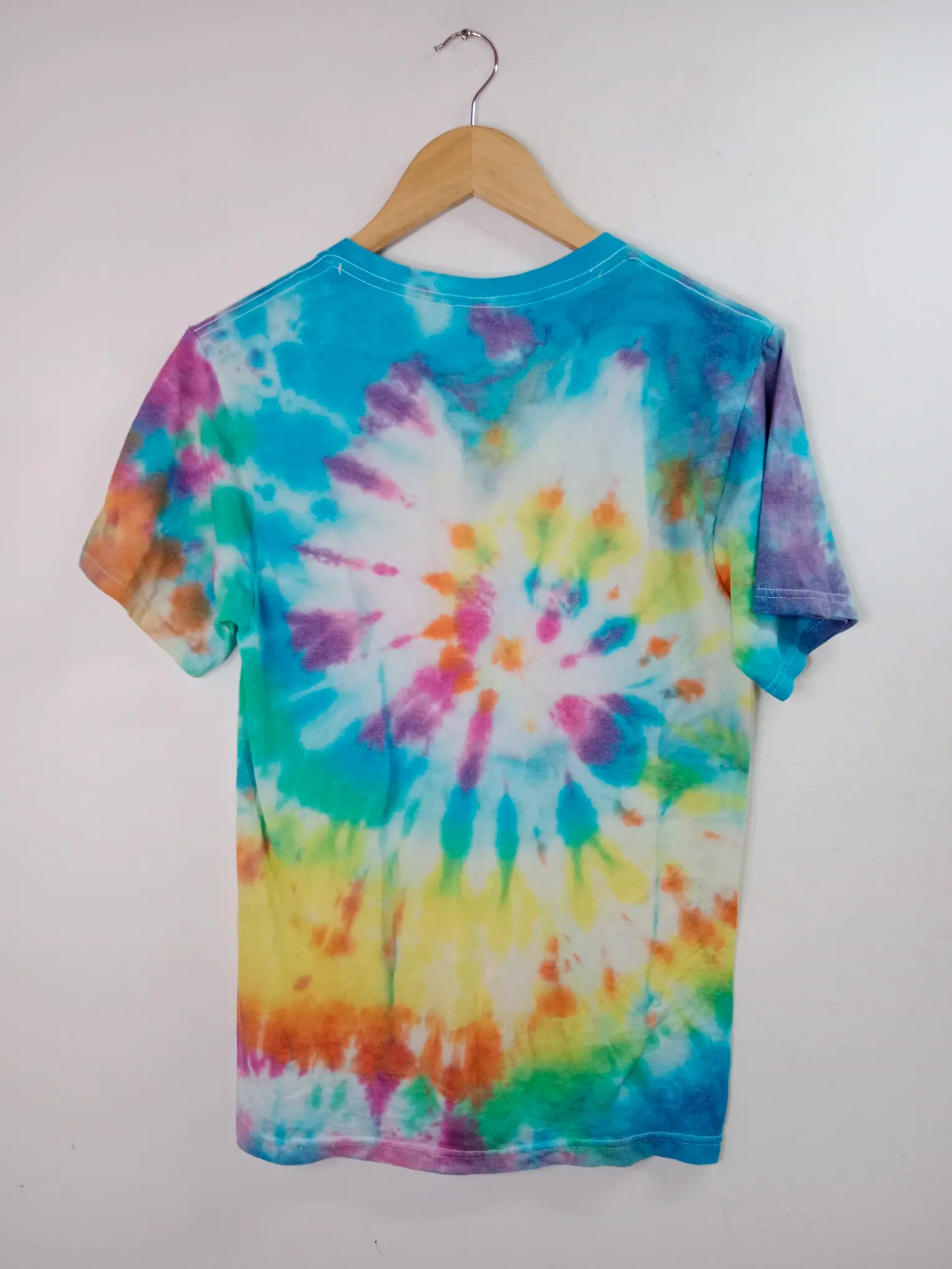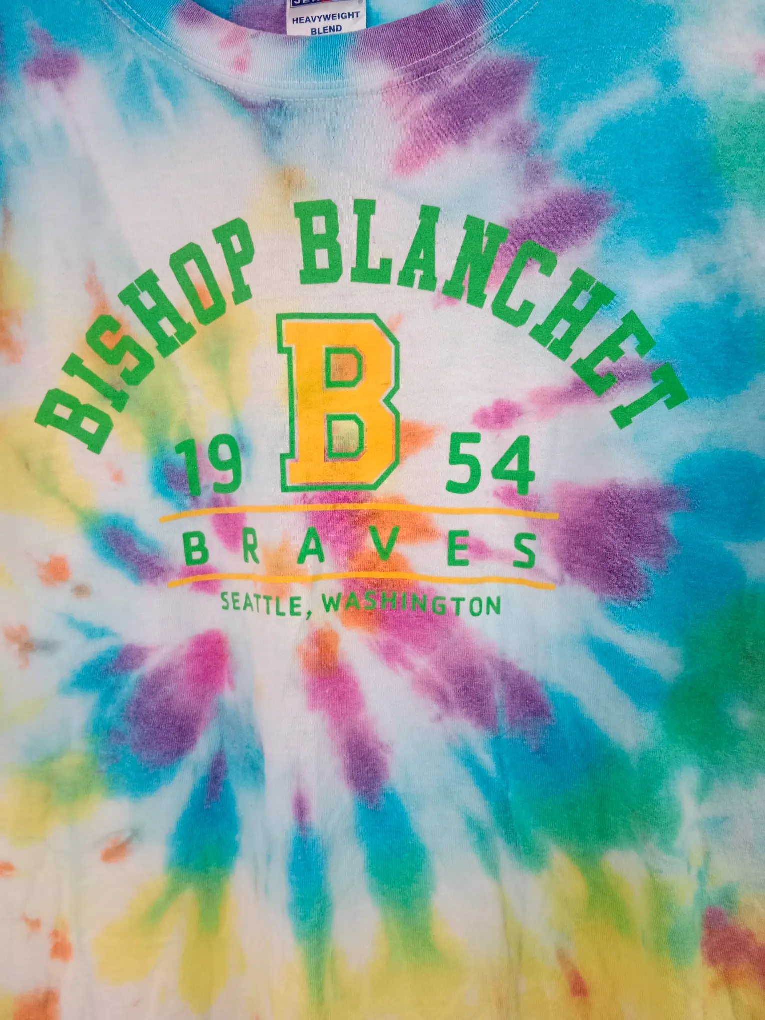 Camiseta de manga corta de algodón tie dye en color azul claro y amarillo con toques multicolor y las letras estampadas «Bishop Blanchet Braves 1954″. Ideal para primavera y verano o para invierno para llevarla con alguna camisa, cazadora vaquera o track jacket abierta. Queda genial tanto con pantalones vaqueros como con pantalones deportivos o incluso con una falda si quieres darle un aire diferente a tu look.