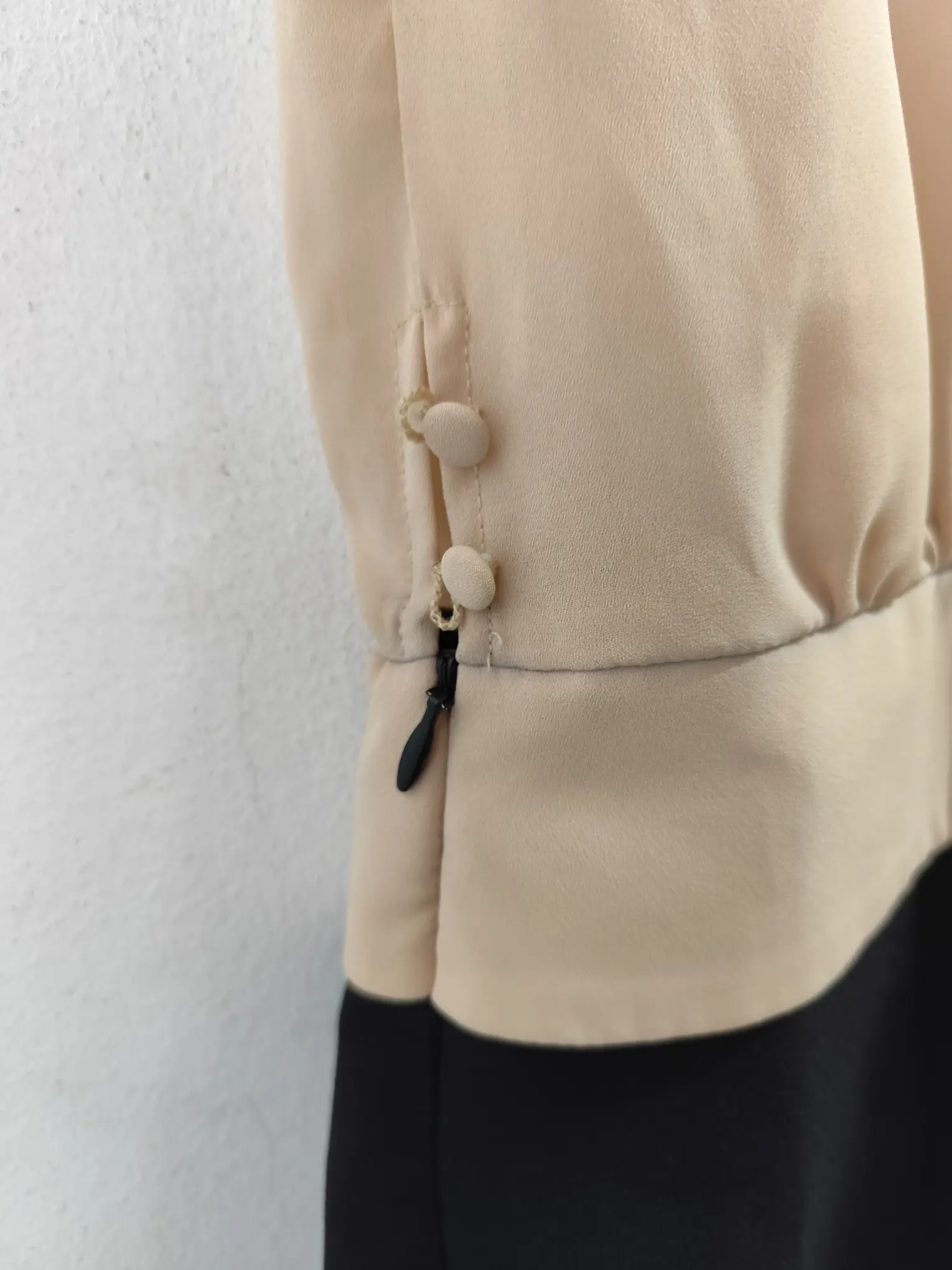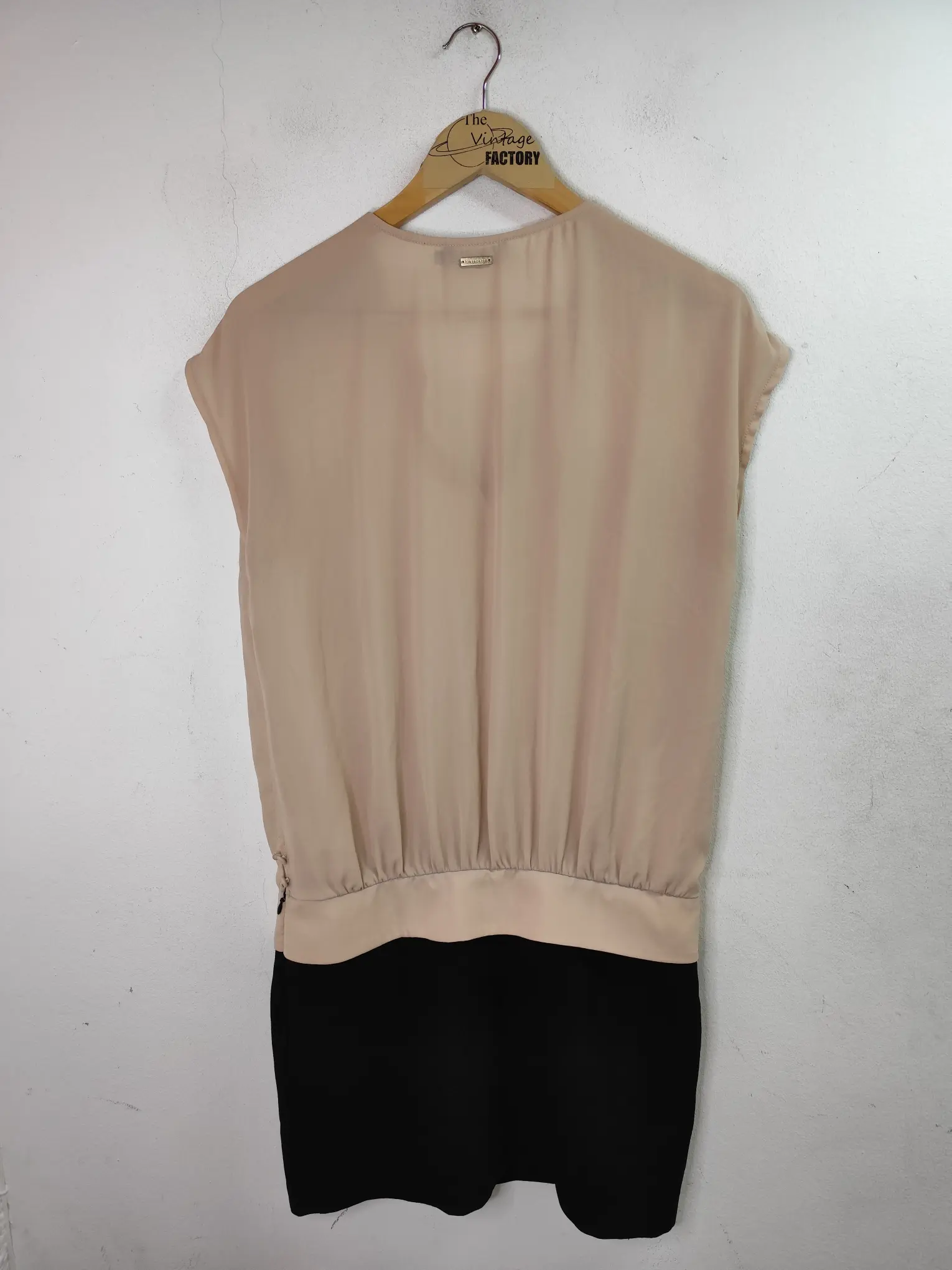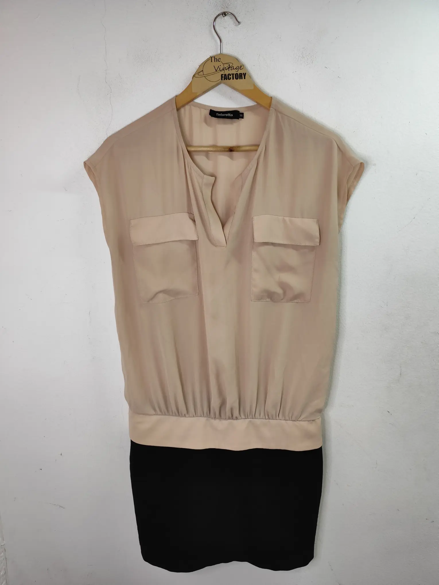 Vestido de primavera verano de manga corta en color beige y negro, corto por la rodilla con bolsillos y el cuello con medio pico. Ideal para primavera y verano en los días más fresquitos o para invierno para llevarla con alguna americana o chaqueta tipo cazadora.
