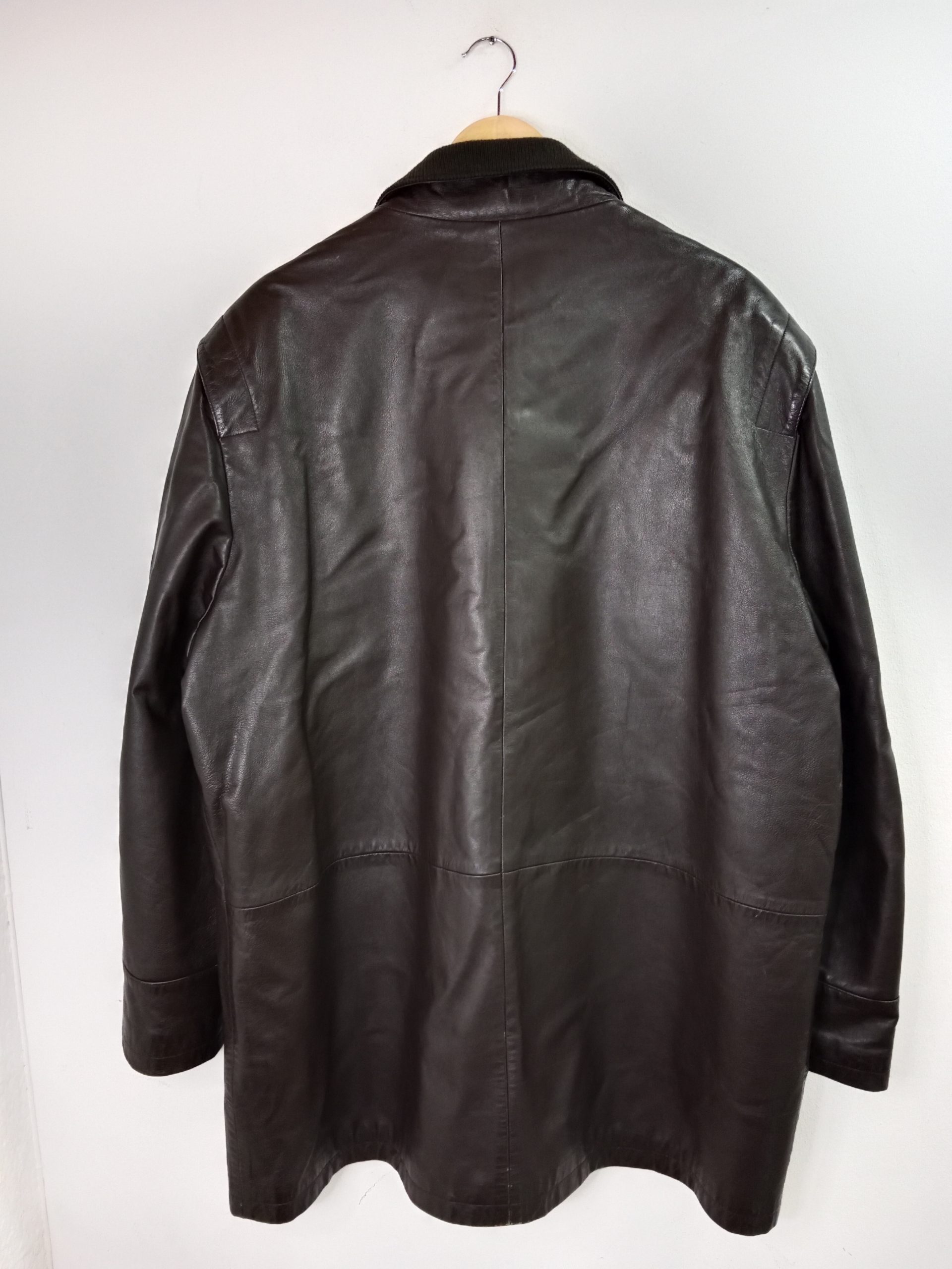 Chaquetón de piel largo en color marrón oscuro con bolsillos y cuello de punto. Preloved and preworn.