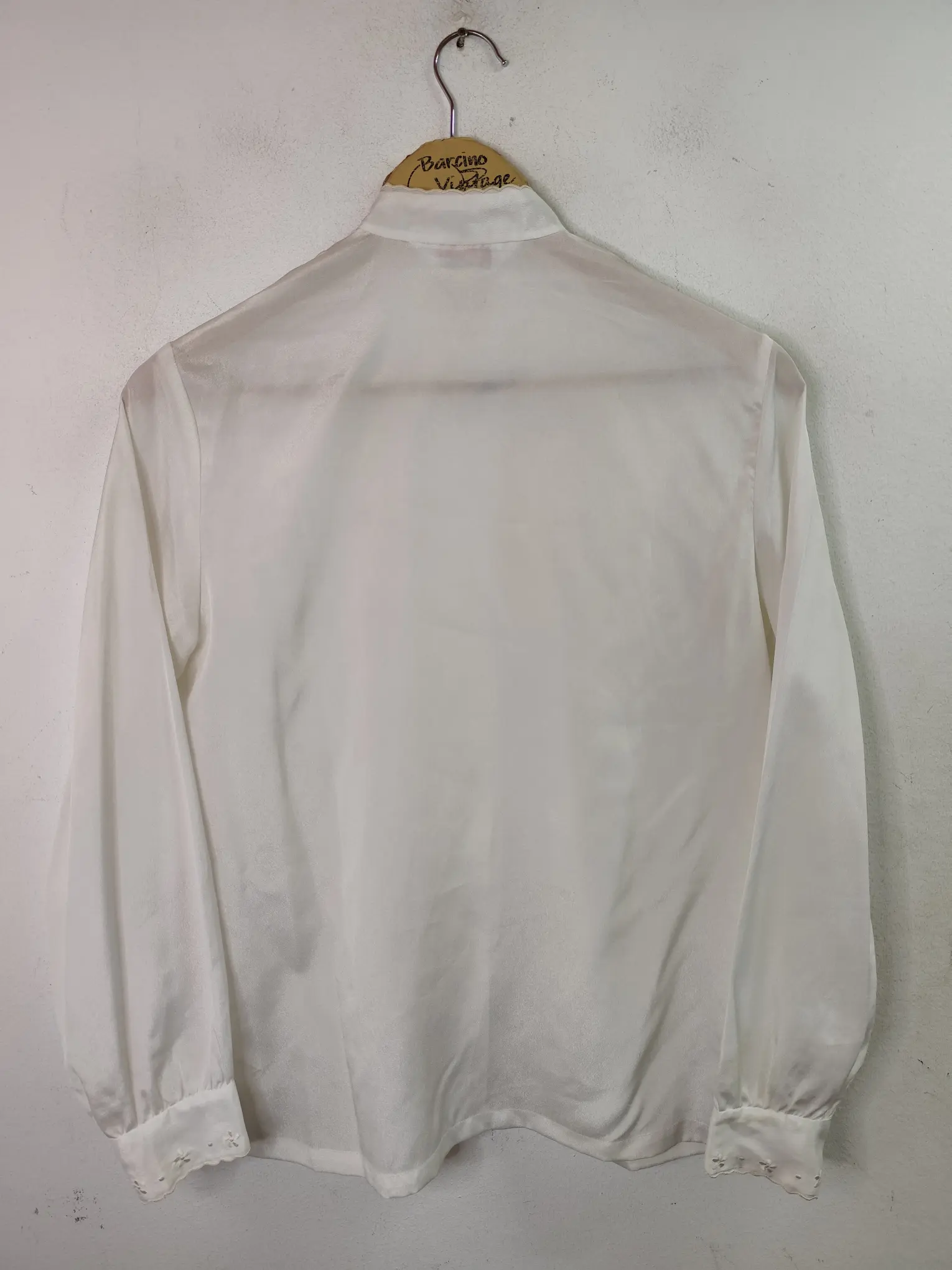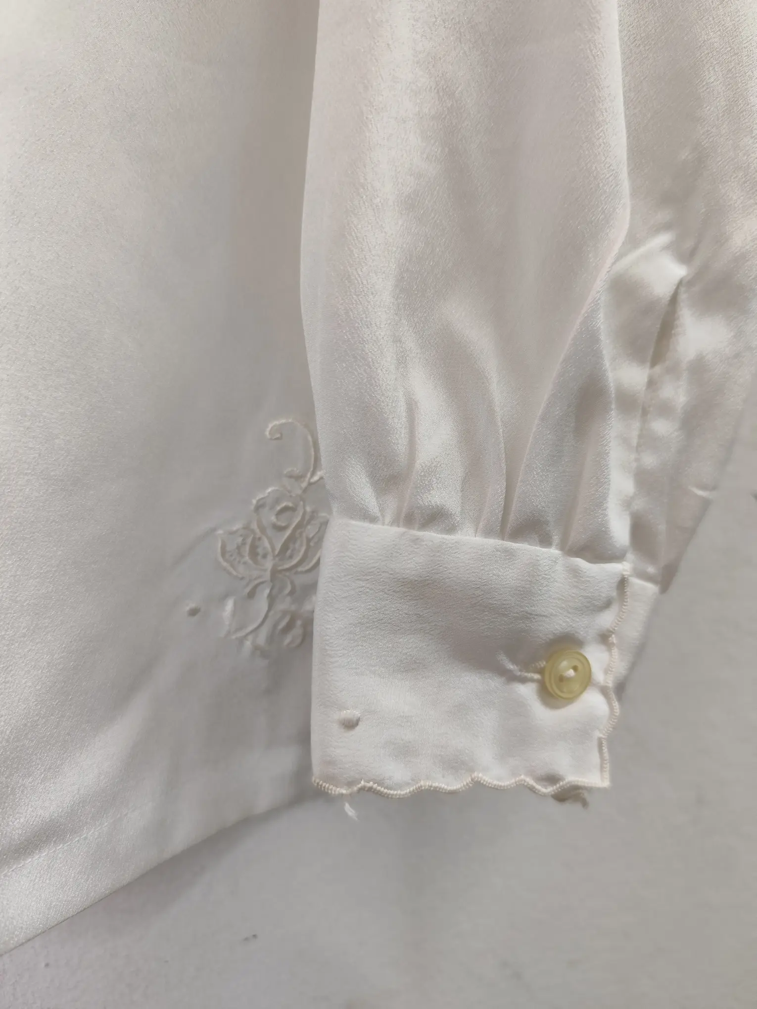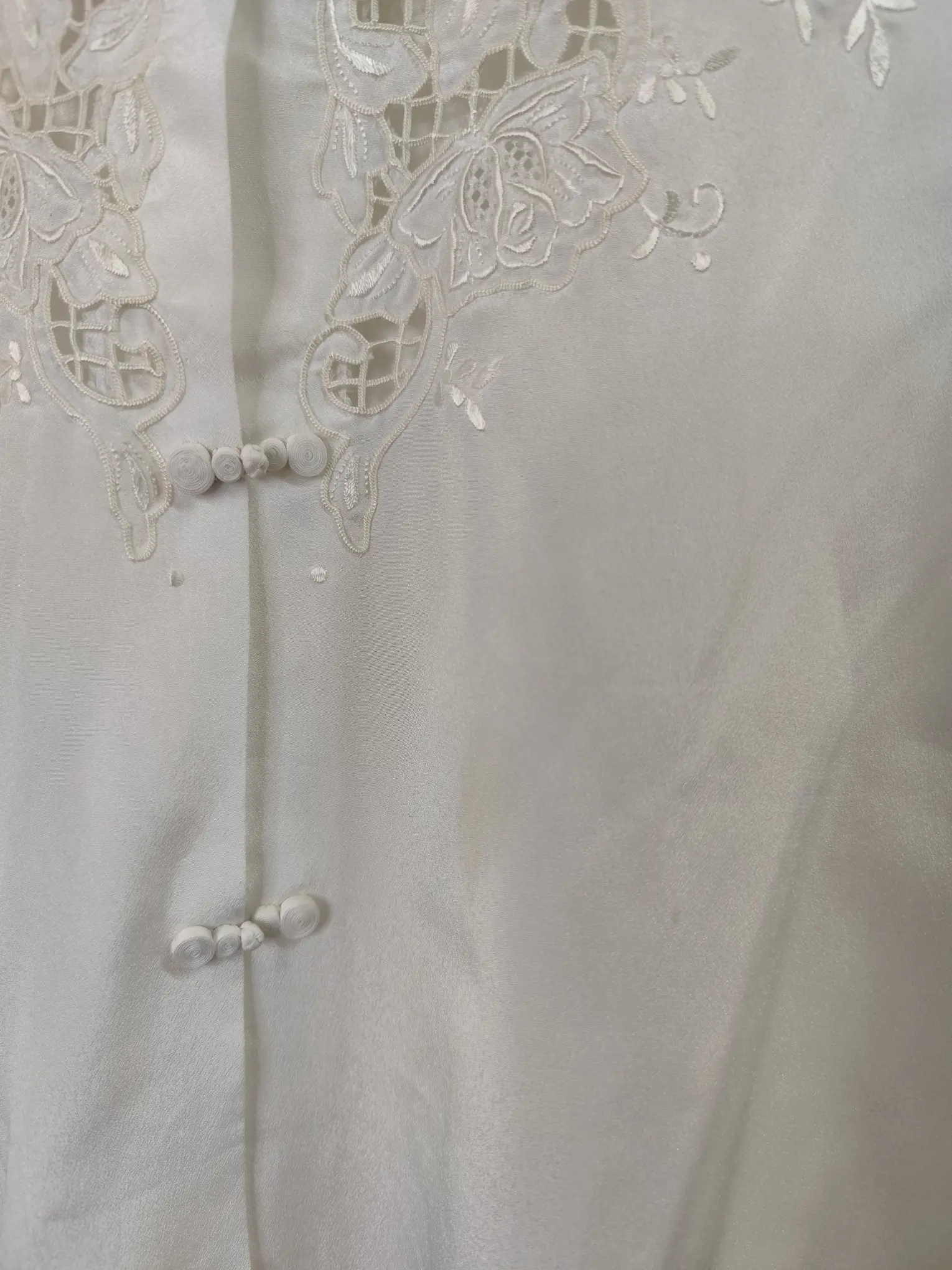 Camisa tradicional china vintage 70s de manga larga en color blanco con encaje y flores bordadas. Los botones son los típicos tradicionales chinos. Ideal para primavera y verano, para llevarla así en los días de más calor o como sobrecamisa, abierta con una camiseta o top debajo en los días más fresquitos. Queda genial tanto con pantalones largos, como con una falda vaquera o unos shorts.