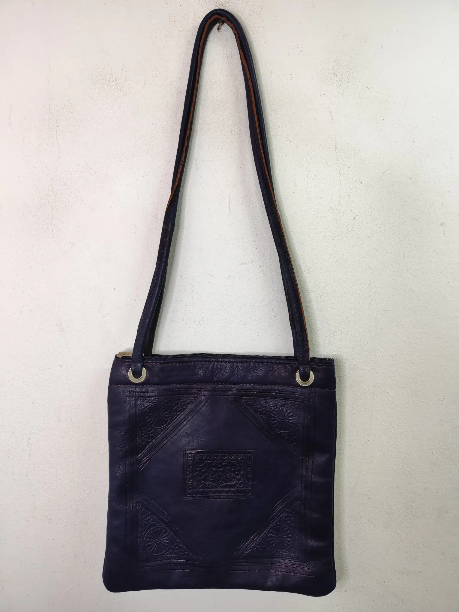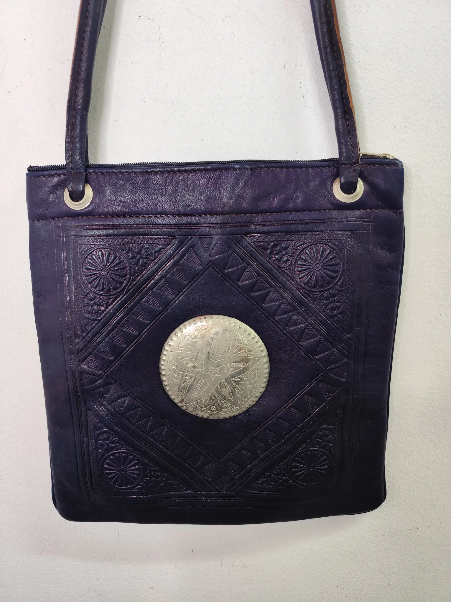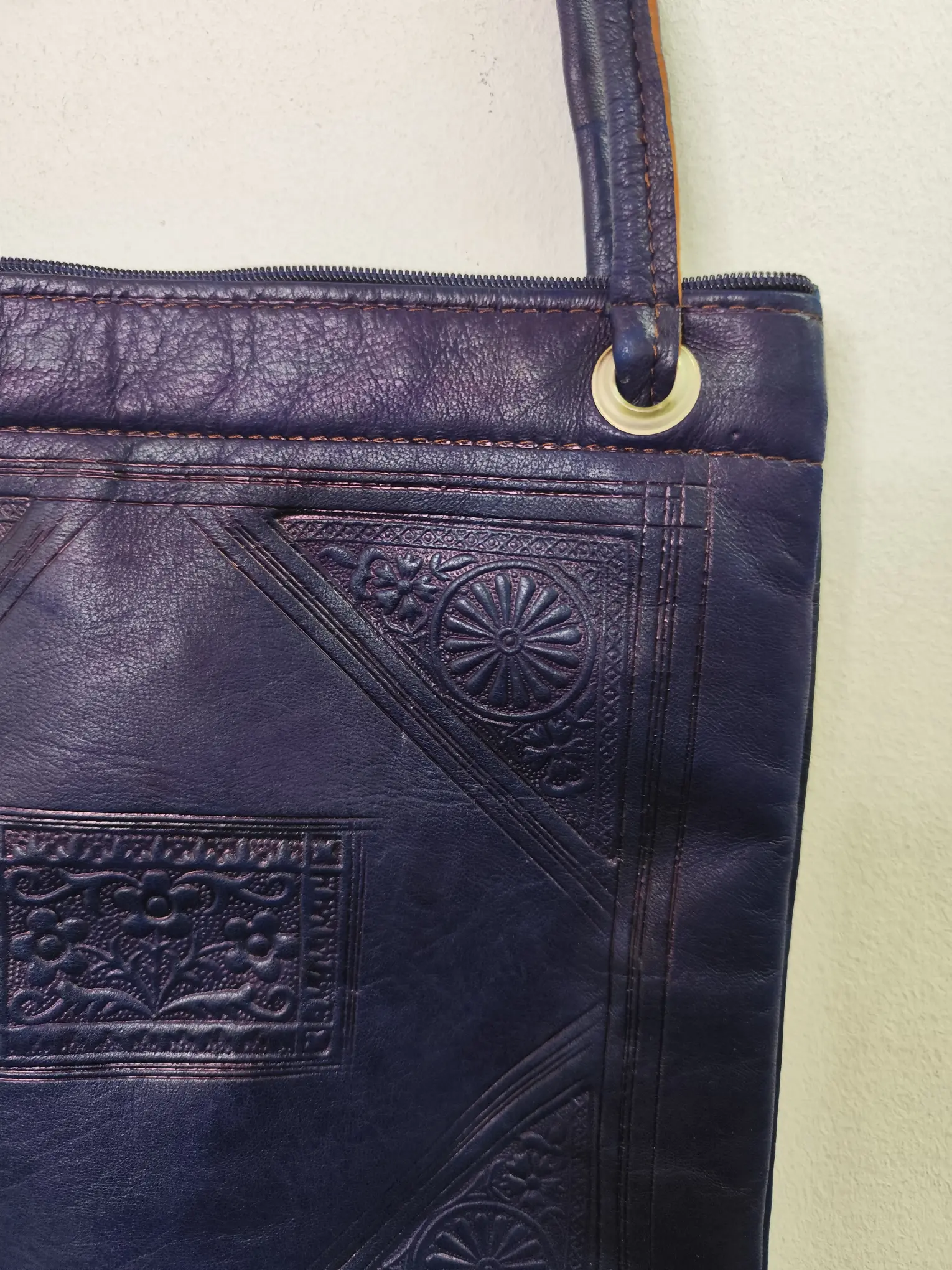 Bolso vintage 90s indio de piel, cuero en color azul marino con detalles grabados y detalles en metal plateado grabado. Es tipo shopper y tiene una tira para poder llevarlo colgado del hombro. Perfecto para los días más otoñales o invernales. Queda ideal con ropa vaquera o con ropa más formal, como unos pantalones de pinzas o una falda. Si quieres darle un toque más atrevido, combínalo con un total look de cuero con chupa de cuero y unos pantalones o falda de piel.