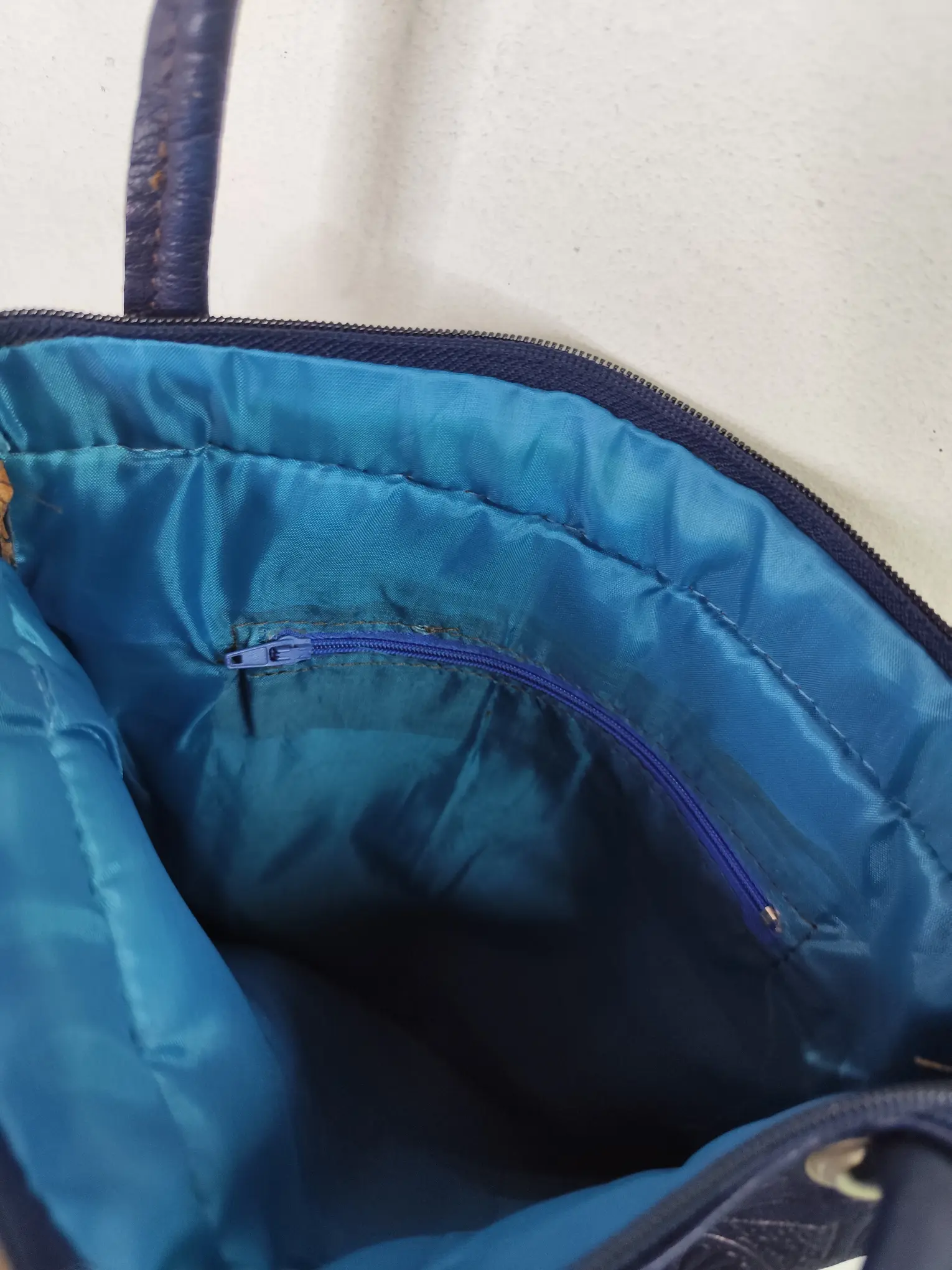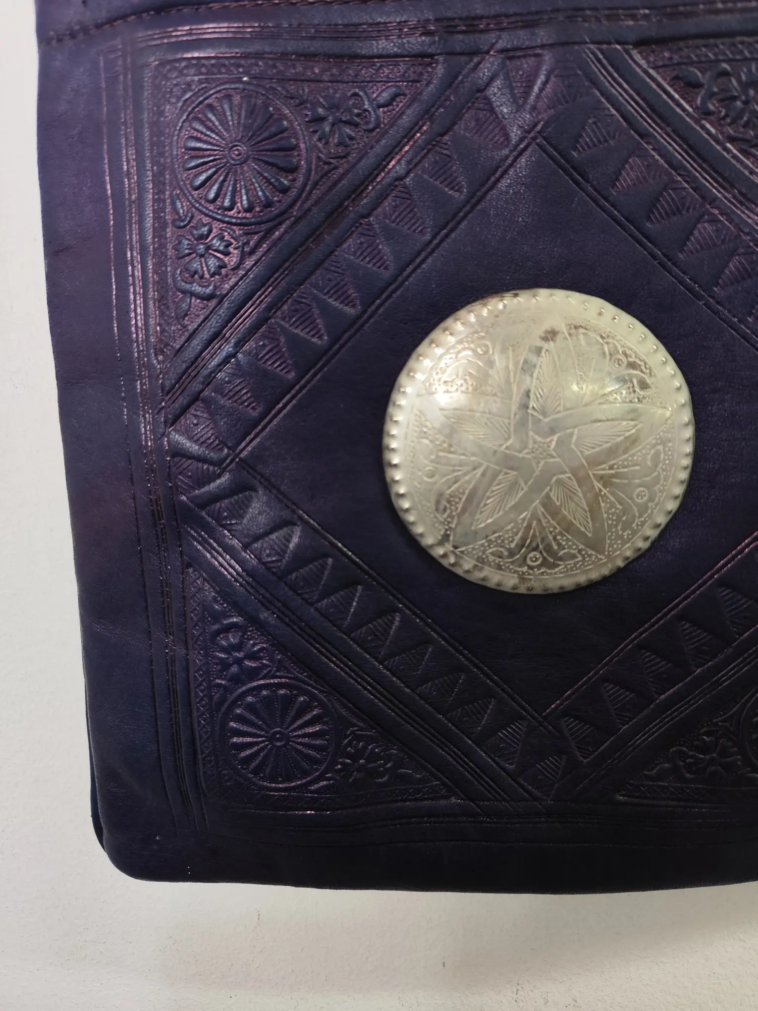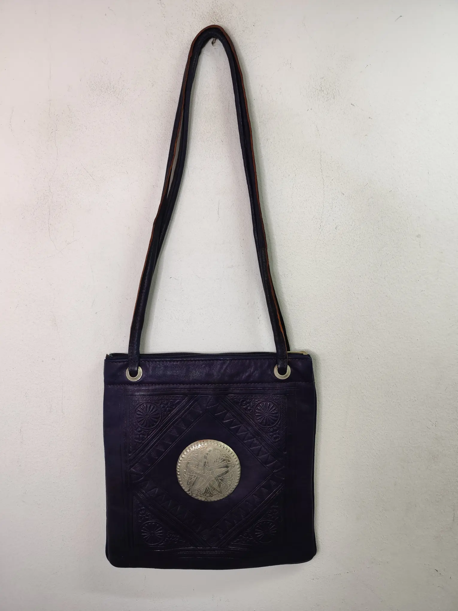 Bolso vintage 90s indio de piel, cuero en color azul marino con detalles grabados y detalles en metal plateado grabado. Es tipo shopper y tiene una tira para poder llevarlo colgado del hombro. Perfecto para los días más otoñales o invernales. Queda ideal con ropa vaquera o con ropa más formal, como unos pantalones de pinzas o una falda. Si quieres darle un toque más atrevido, combínalo con un total look de cuero con chupa de cuero y unos pantalones o falda de piel.