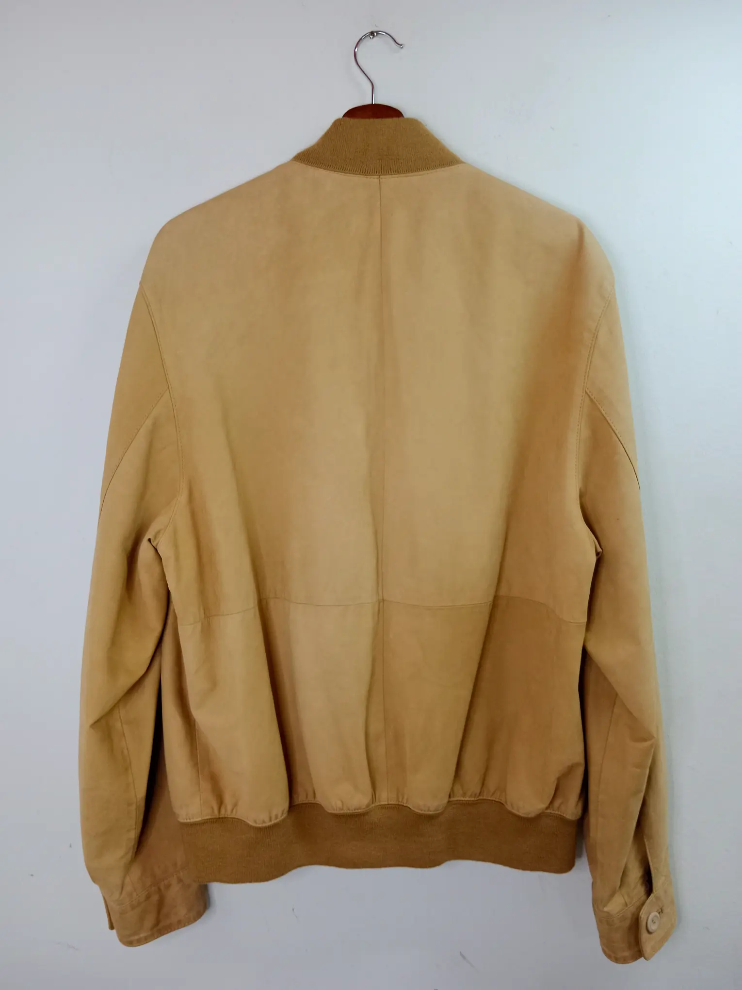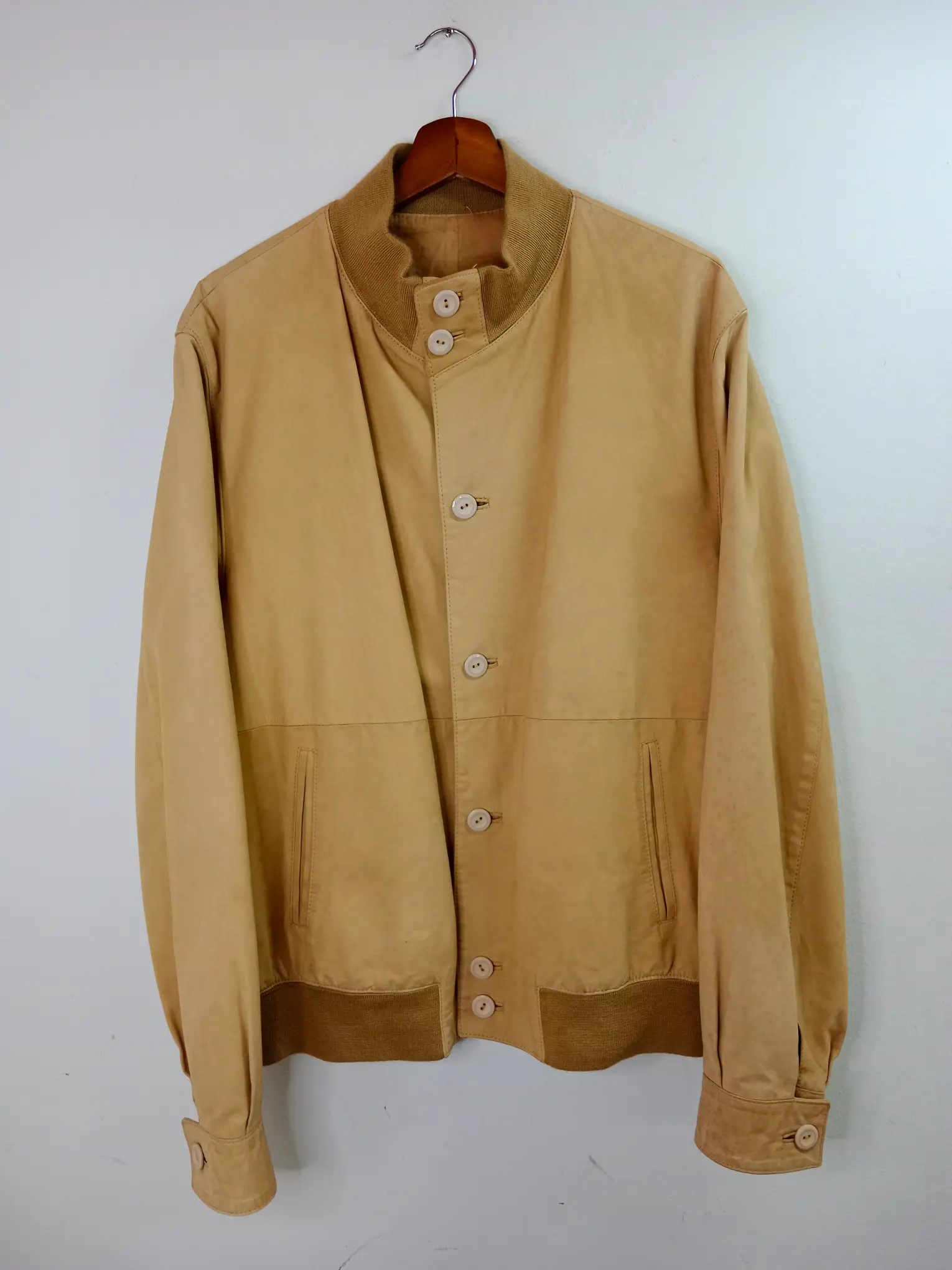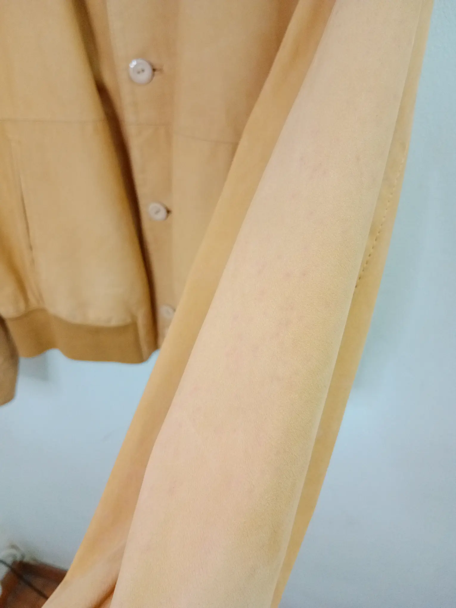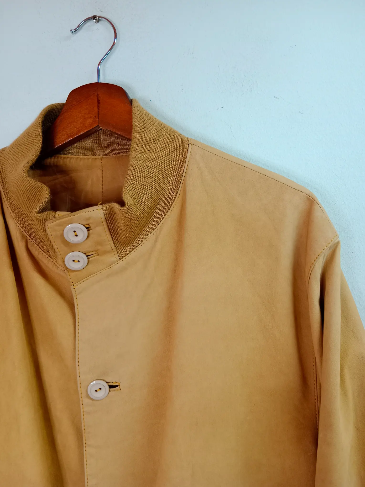 Chaqueta de piel, cuero vintage 90s tipo biker en color mostaza con botones y el cuello y los puños de punto. Ideal para los días más fríos de invierno para usarla con una sudadera o más capas debajo del abrigo. Queda genial tanto con pantalones vaqueros como con pantalones tipo chinos o de pinzas o incluso con una falda.