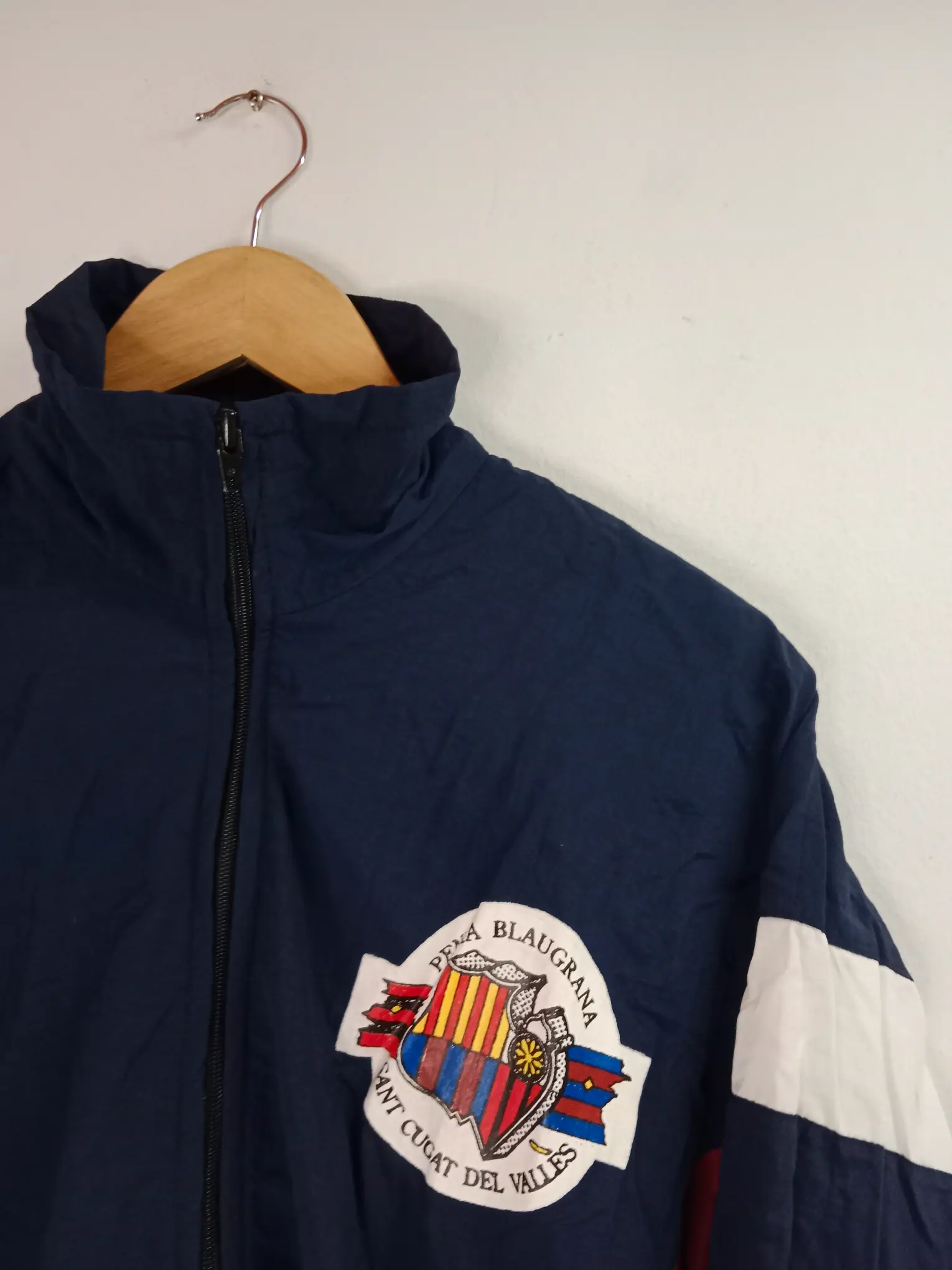 Chaqueta vintage, crazy jacket con forro en azul marino con detalles en rojo y blanco y el escudo impreso. Ideal para primavera y verano en los días más fresquitos o para invierno para usarla con ropa de abrigo debajo. Queda genial tanto con pantalones vaqueros como con pantalones tipo chino o cargo o incluso con una falda si quieres tener un estilo más atrevido.