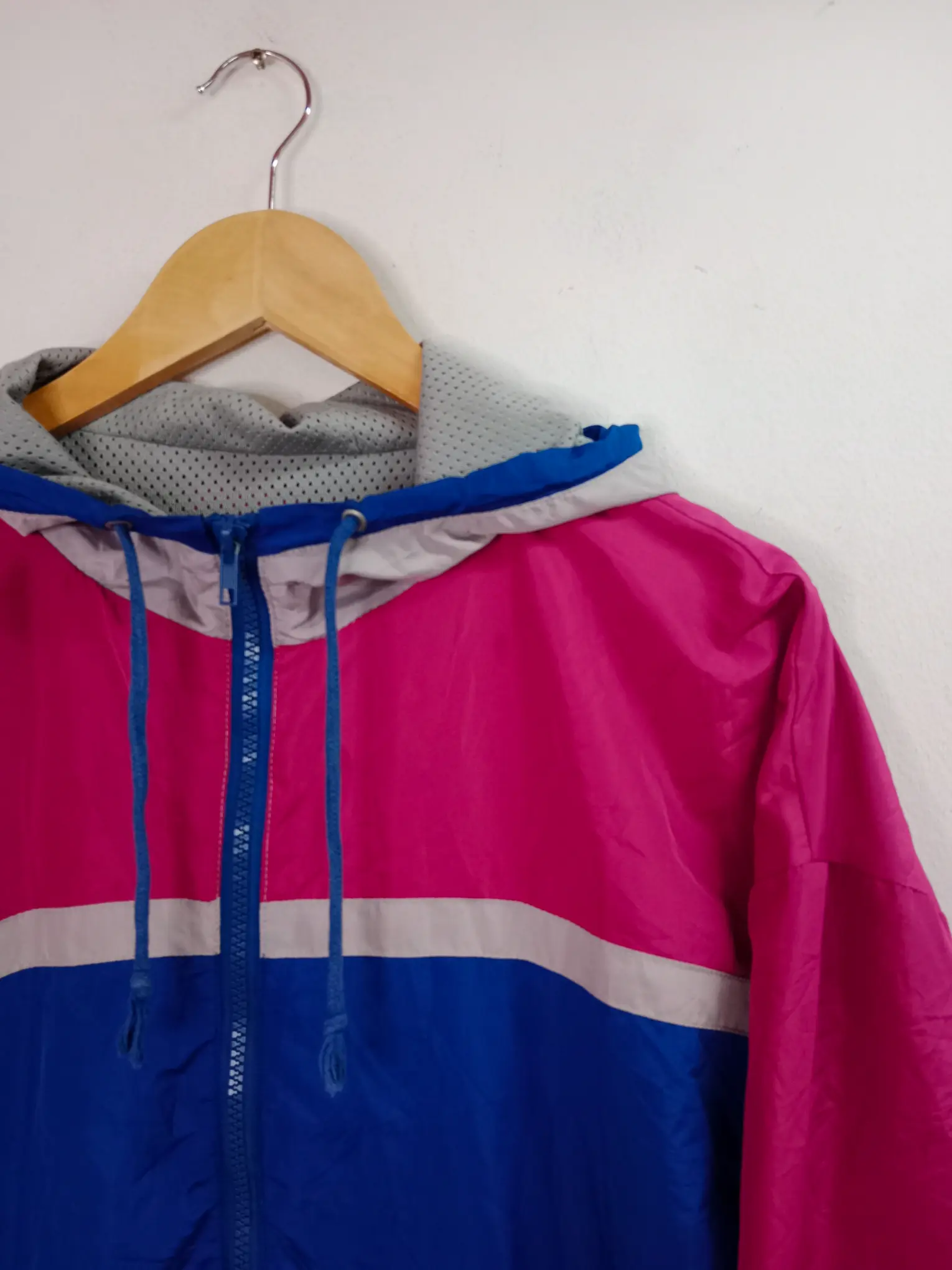 Chaqueta deportiva tipo crazy jacket, cortavientos con capucha en color rosa fucsia y azul con cremallera y bolsillos. Ideal para primavera y verano en los días más fresquitos o para invierno para usarla como sudadera debajo del abrigo. Queda genial tanto con pantalones vaqueros como con pantalones deportivos o incluso con una falda si quieres darle un aire diferente a tu look.