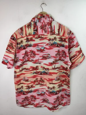 Camisa hawaiana de manga corta en color rojo con estampado de animales marinos en color blanco. Ideal para primavera y verano, para llevarla así en los días de más calor o como sobrecamisa, abierta con una camiseta o top debajo en los días más fresquitos. Queda genial tanto con pantalones largos, como con una falda vaquera o unos shorts.