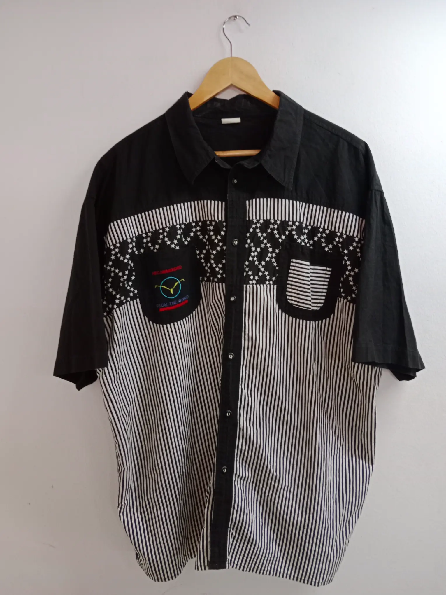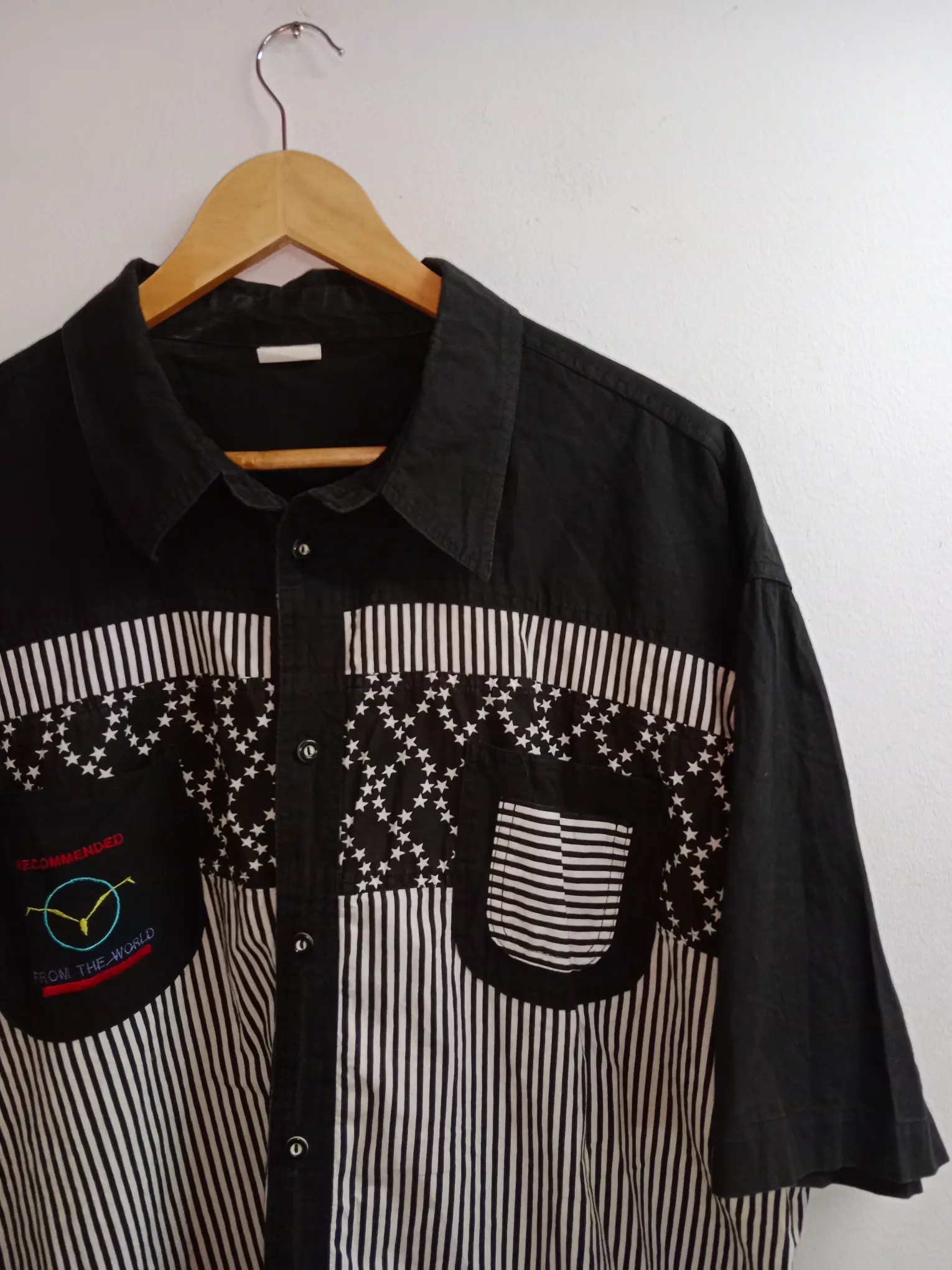 Camisa de manga corta vintage estampada en blanco y negro. Ideal para primavera y verano, para llevarla así en los días de más calor o como sobrecamisa, abierta con una camiseta o top debajo en los días más fresquitos. Queda genial tanto con pantalones largos, como con una falda vaquera o unos shorts.