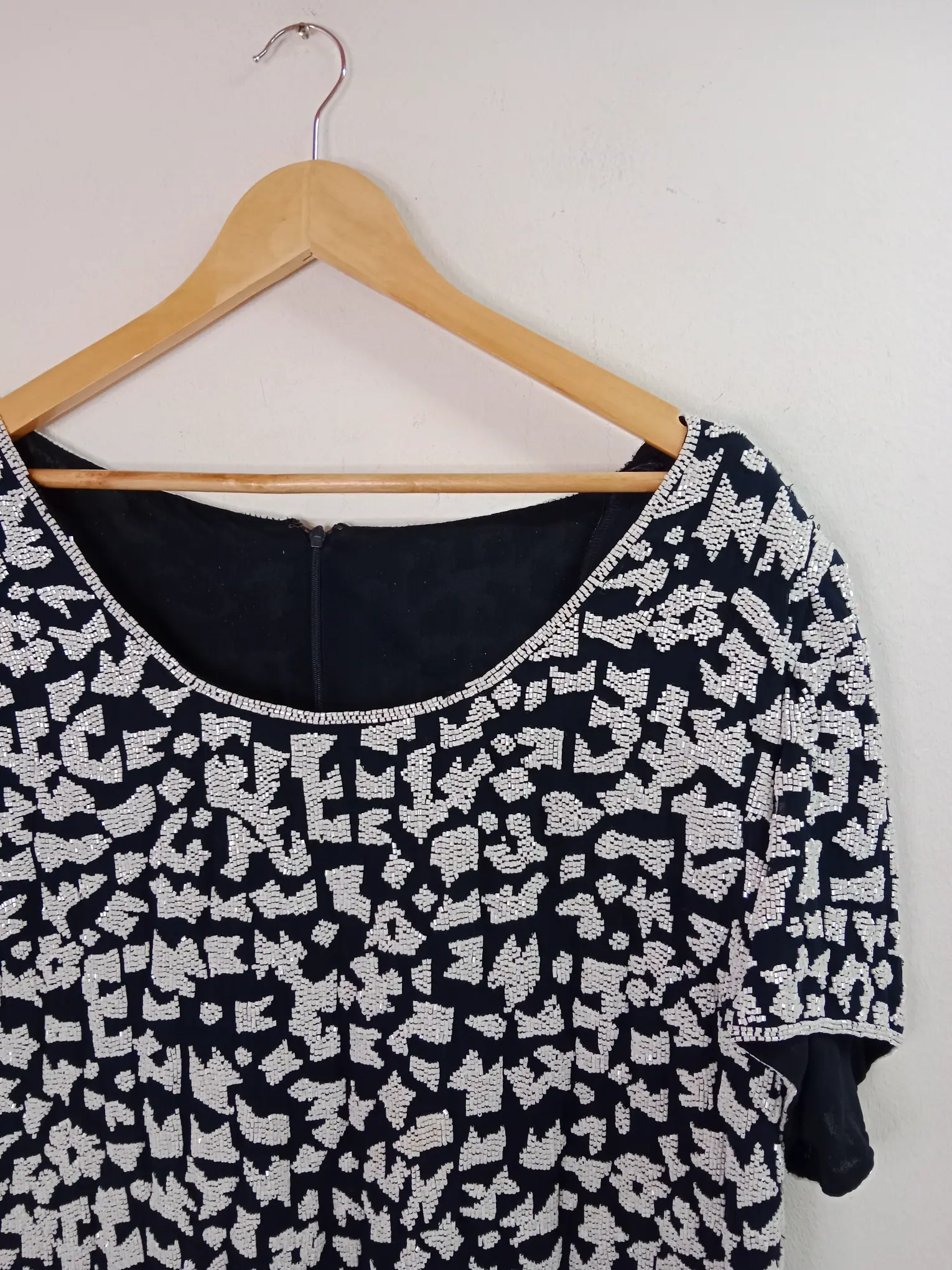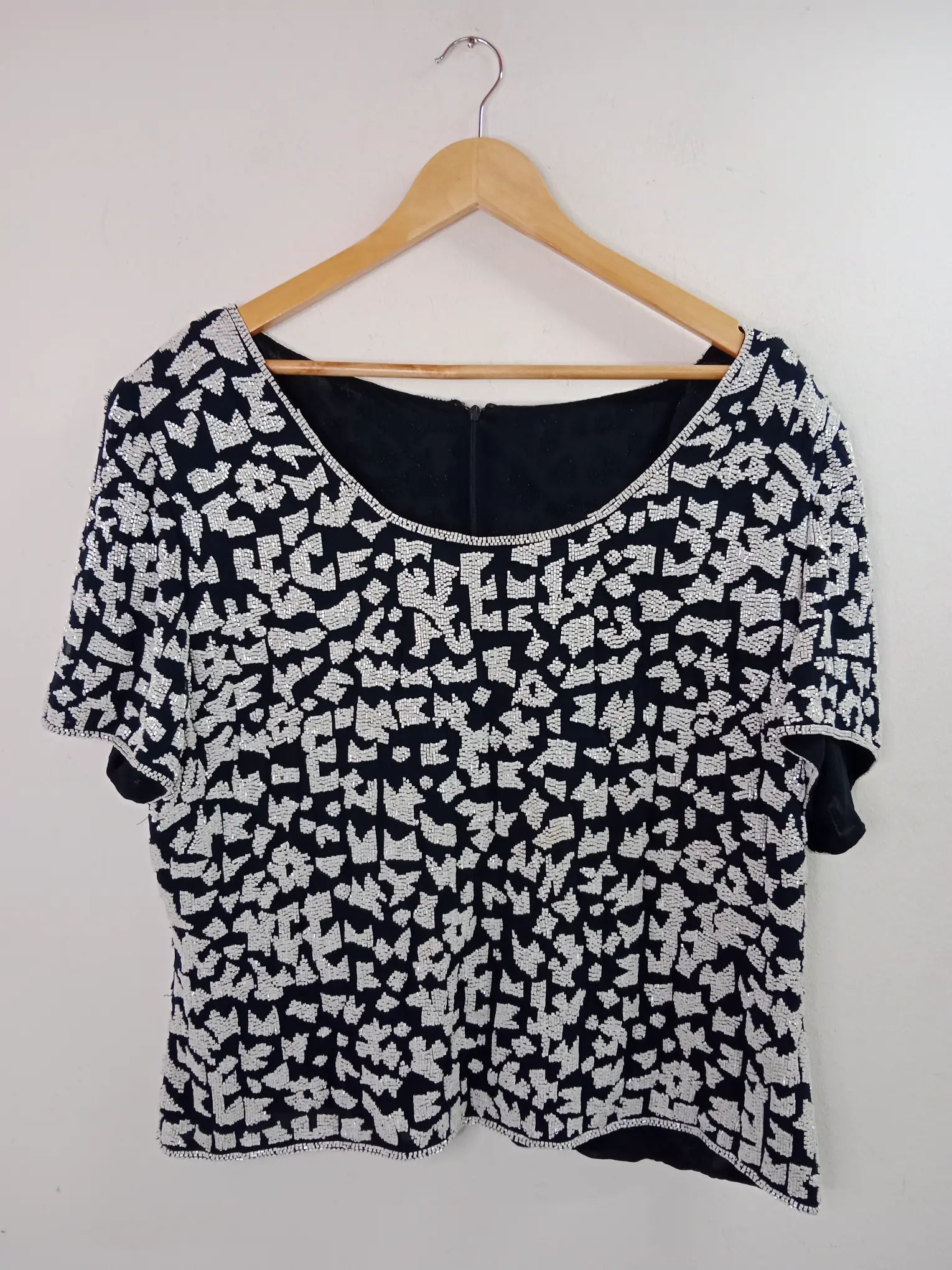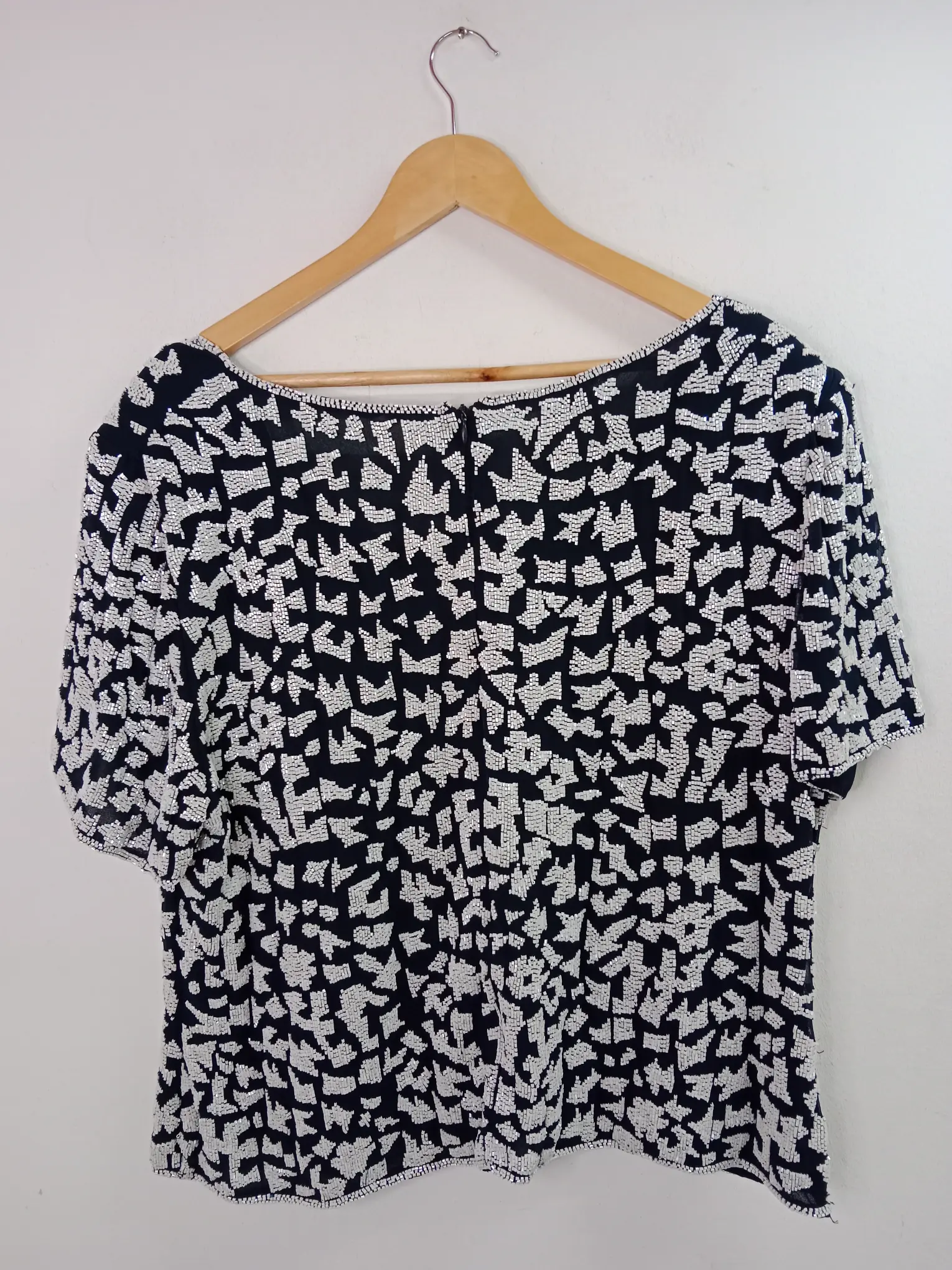 Camiseta de manga corta tipo blusa en azul marino con abalorios blancos bordados. Ideal para primavera y verano. Queda genial tanto con pantalones largos, como con una falda vaquera o unos shorts.